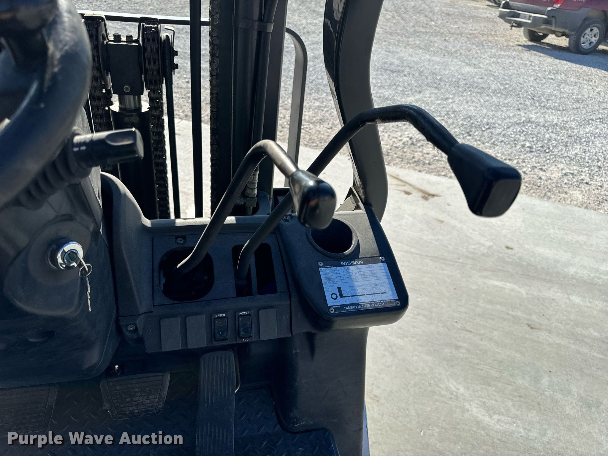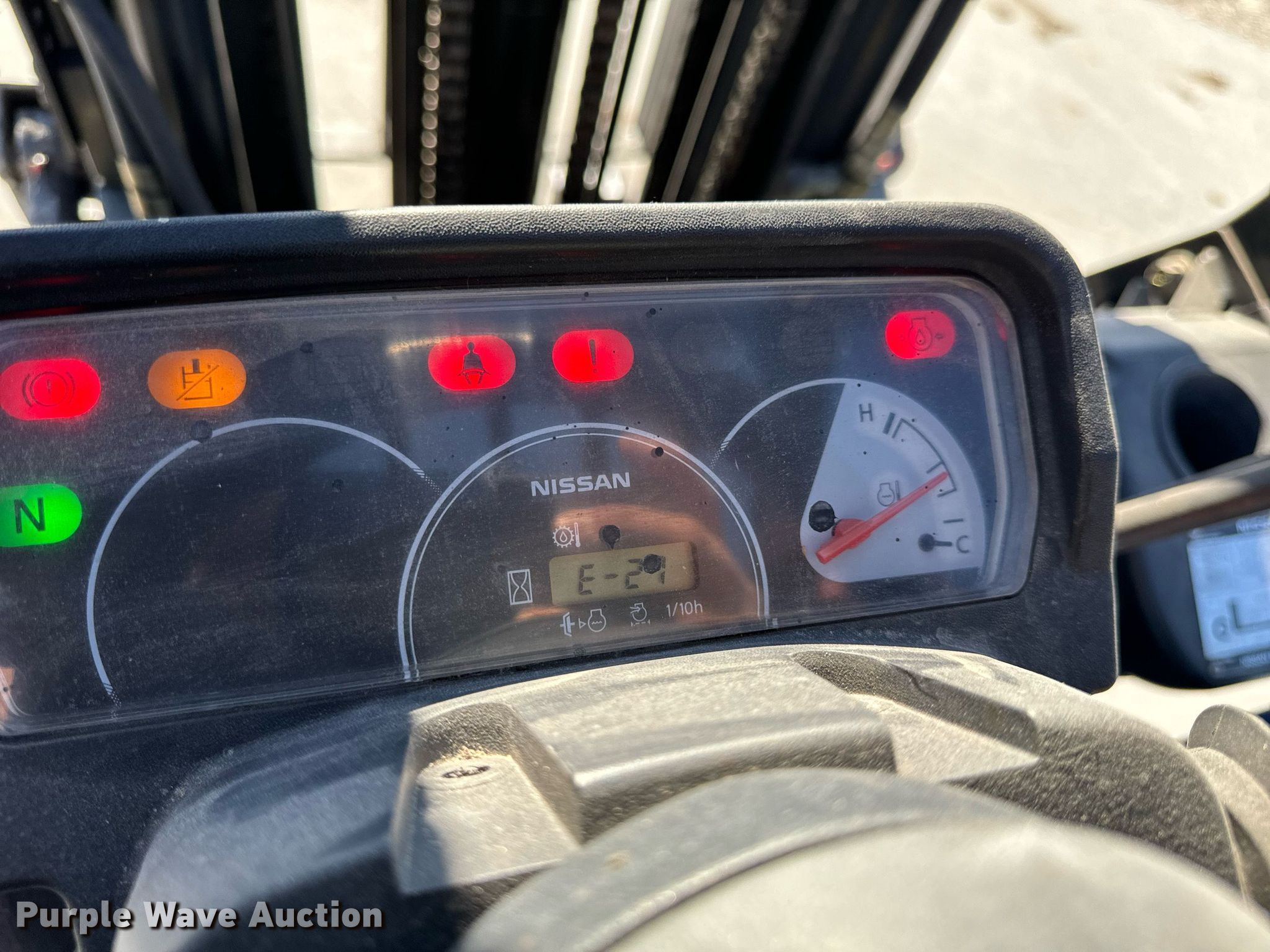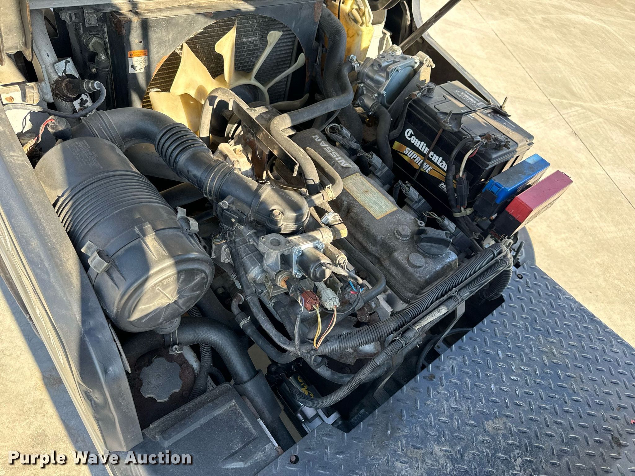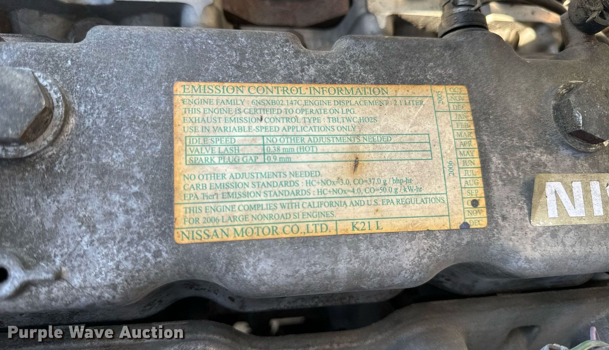 Nissan 50 forklift. Hours: 15,336 on meter, Serial: CPL02-9P7105. Engine Nissan K21 , Displacement: 2.1L, Cylinders: 4, Fuel type: LPG LP bottle: Not included. Transmission Powershift. Operators station OROPS. Features Maximum lift capacity: 4,400 lbs, Maximum lift height: 187", Mast stages: 3, Side shift, Mast tilt, Fork length: 42". Tires Front: 21X7X15, Rear: 413/12-285.8, Solid, Non-marking. Notes Warning indicator: E-27. Sugar Creek Enterprises. 1379 County Road 1305. Moberly, MO 65270