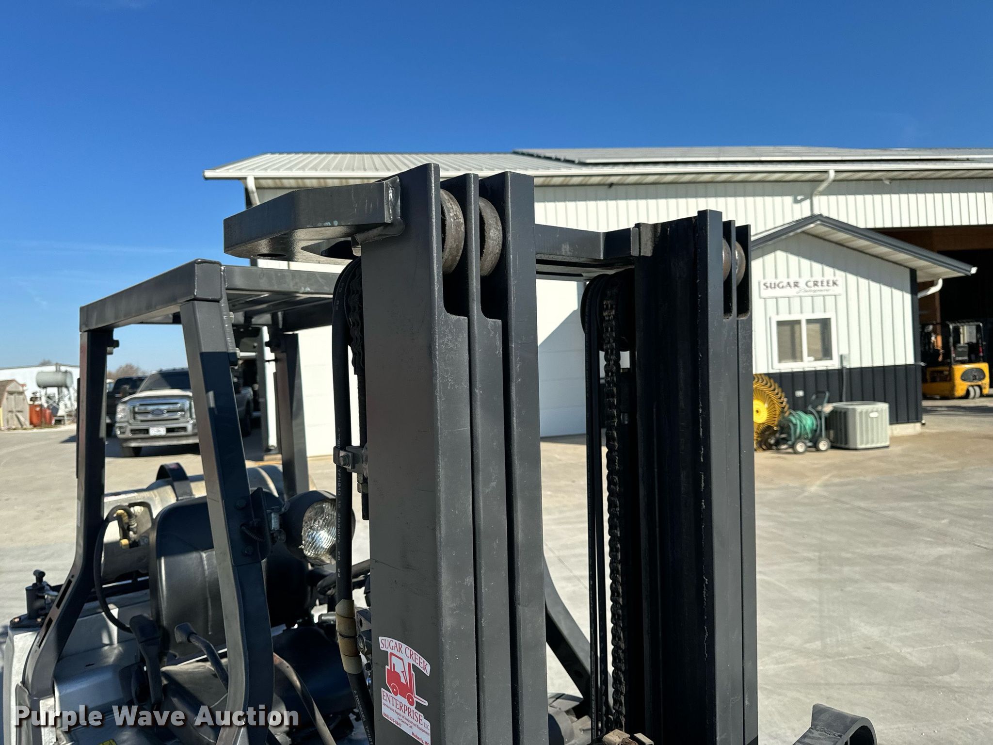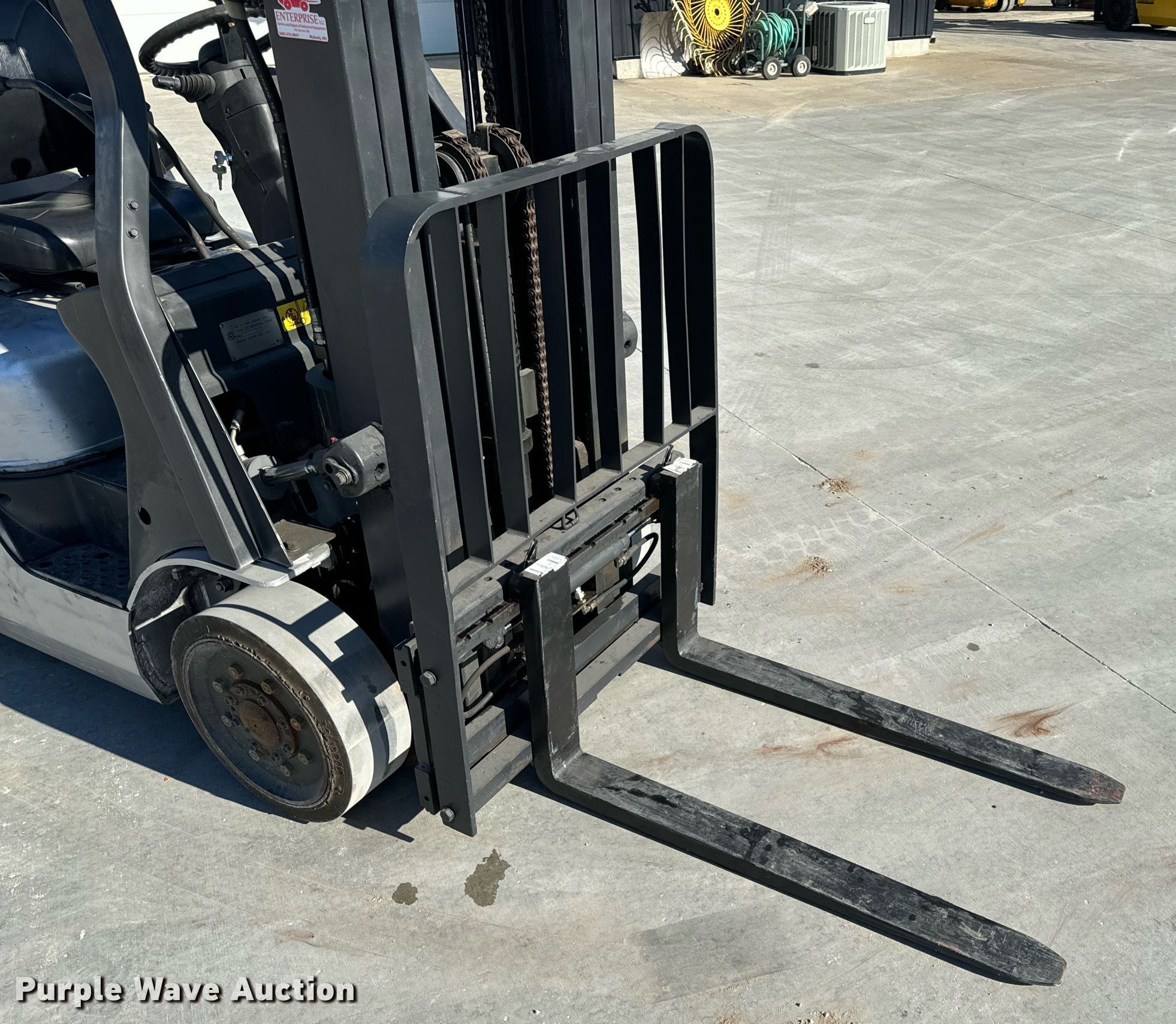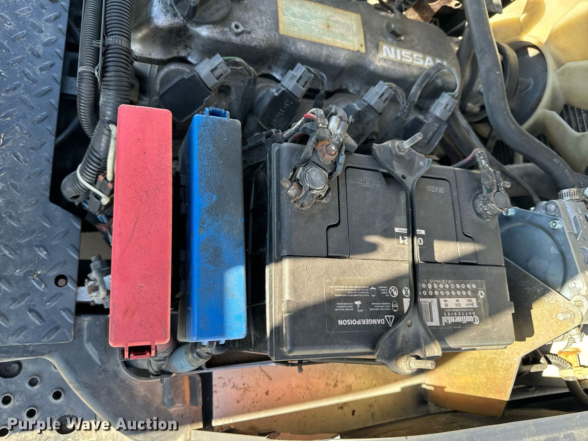 Nissan 50 forklift. Hours: 15,336 on meter, Serial: CPL02-9P7105. Engine Nissan K21 , Displacement: 2.1L, Cylinders: 4, Fuel type: LPG LP bottle: Not included. Transmission Powershift. Operators station OROPS. Features Maximum lift capacity: 4,400 lbs, Maximum lift height: 187", Mast stages: 3, Side shift, Mast tilt, Fork length: 42". Tires Front: 21X7X15, Rear: 413/12-285.8, Solid, Non-marking. Notes Warning indicator: E-27. Sugar Creek Enterprises. 1379 County Road 1305. Moberly, MO 65270