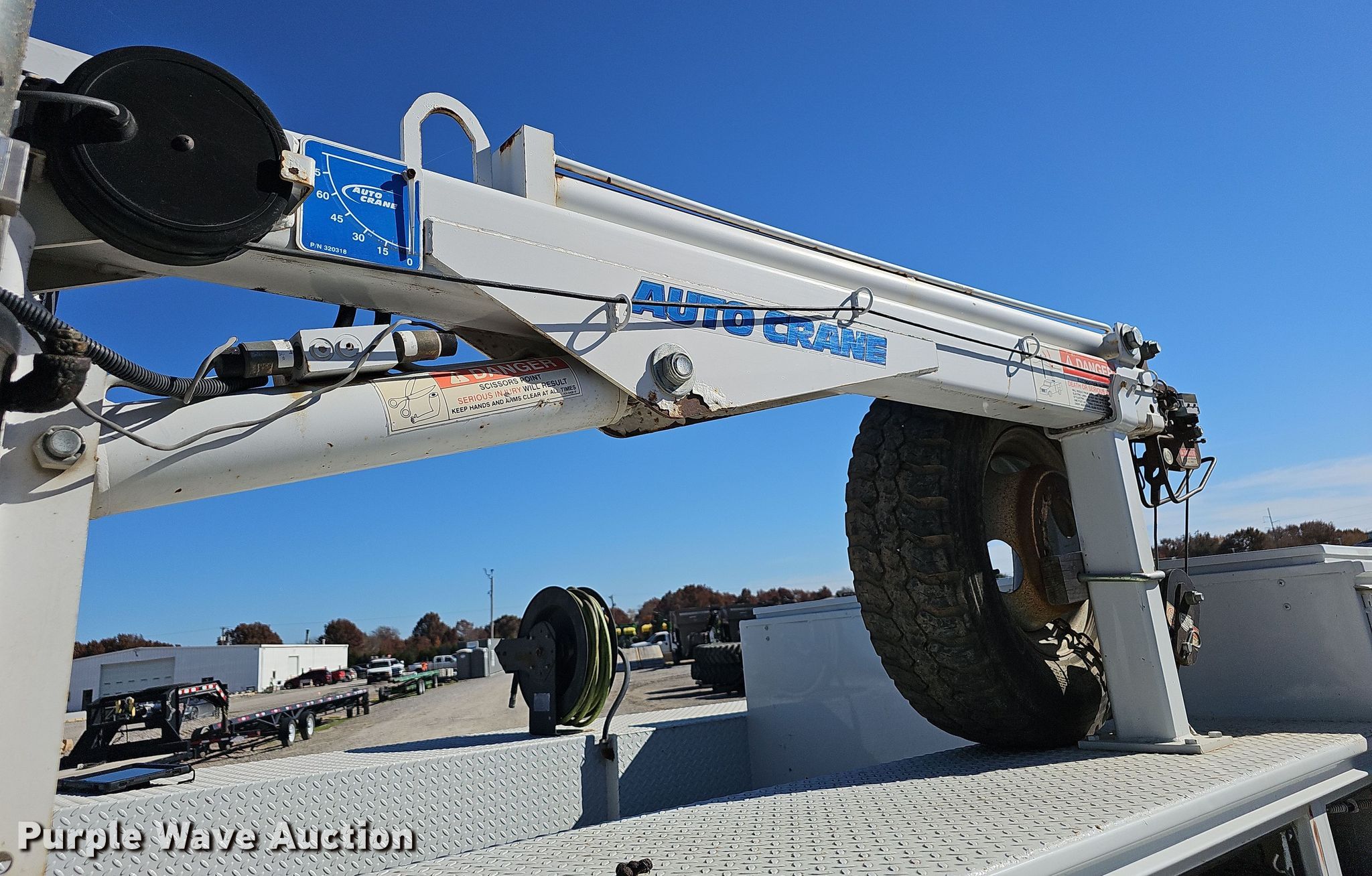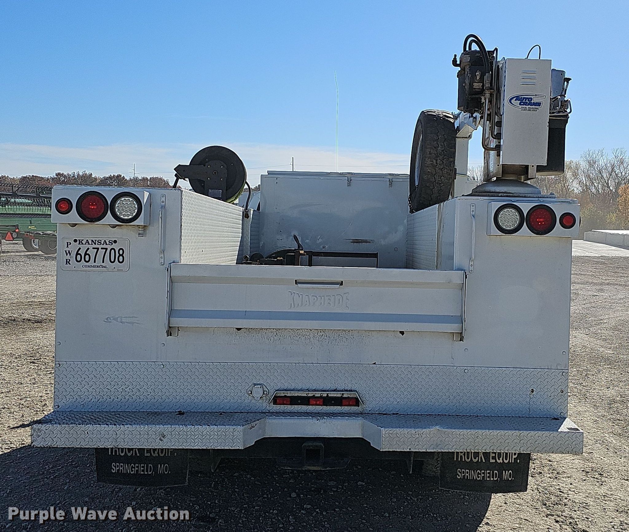 1997 Ford F450 Super Duty utility / service truck. Miles: 317,703 on odometer, VIN: 3FELF47F3VMA66101. Engine Ford, Displacement: 7.3L, Cylinders: 8, Fuel type: Diesel. Transmission Manual, Speed: 5. Chassis Axles: Single, Suspension: Spring, Brakes: Hydraulic. Interior AC, heat, Cruise control. Features Bed Knapheide, 11' 2" L x 94" W, Air compressor Puma PP6060V, Oil/lube system Hose reels, Crane Auto crane 3203 PRX, Maximum boom length: 15' Maximum lift capacity: 3,200 lbs.. Tires Size: LT235/85R16. Notes Unknown operating condition of crane, Non-operational air compressor, Windshield chipped or cracked. Kansas title. Heritage Tractor. 1076 S Hwy 69. Pittsburg, KS 66762