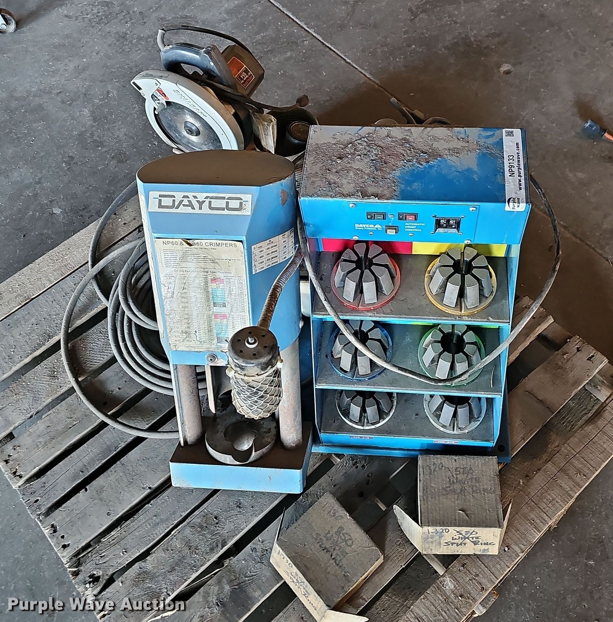 Dayco NP60 WB60 hydraulic hose crimper. Electric Motor. Magnetec , Volts: 230, Phase: Single. Featues Hose capacity: 0.520" to 1.730" diameter. Skilsaw 8.25" circular saw. Reeds, MO 64854