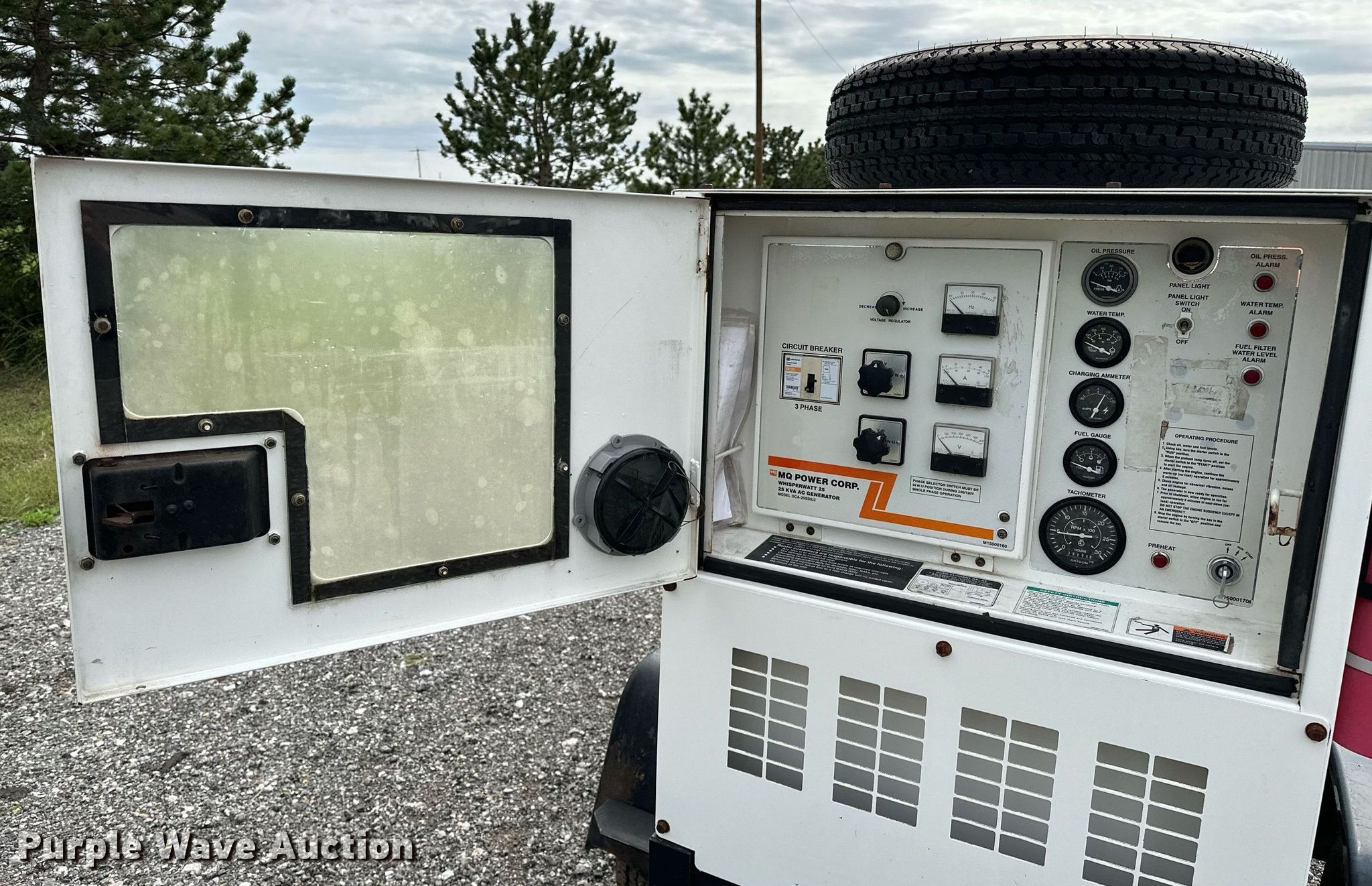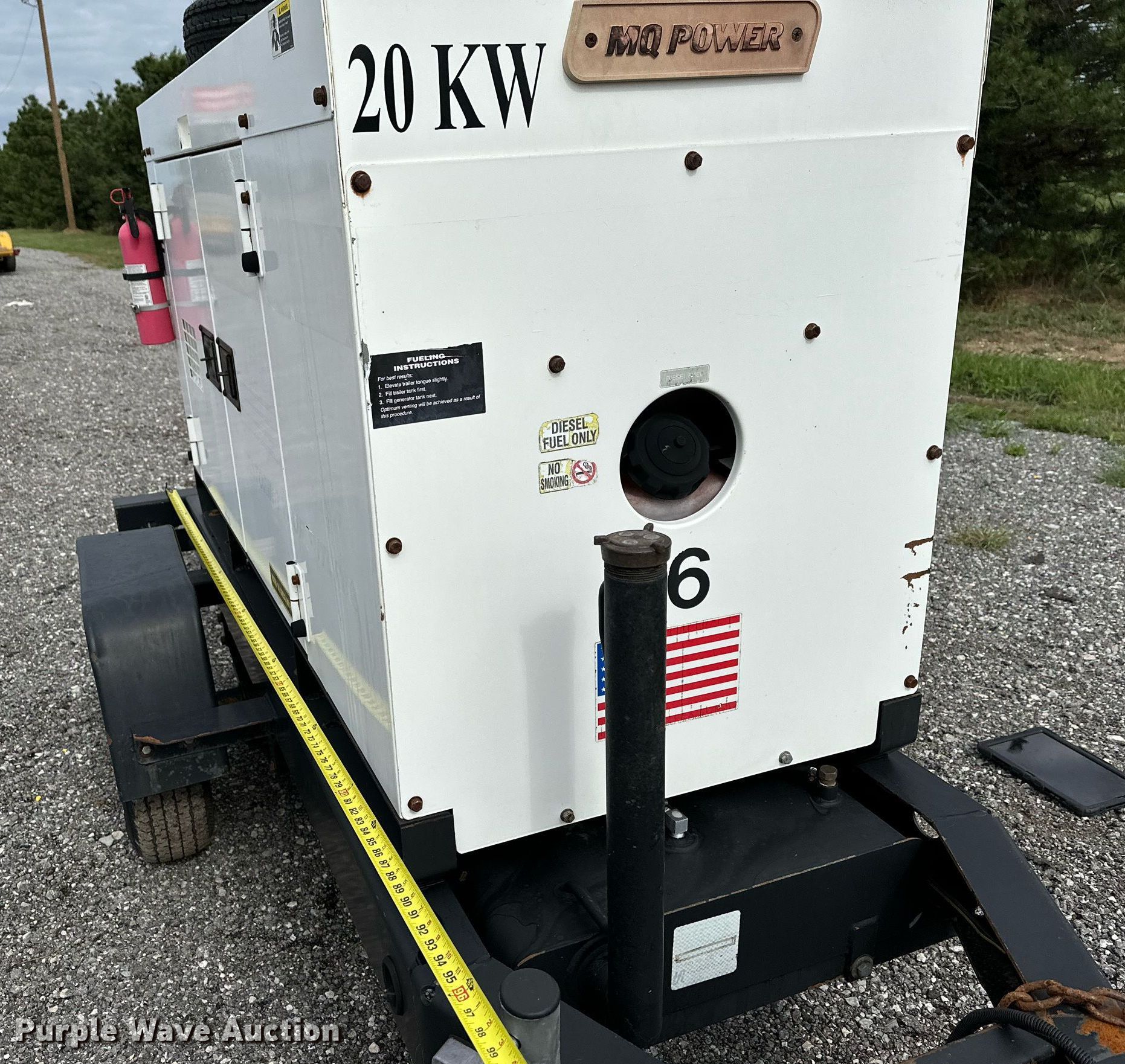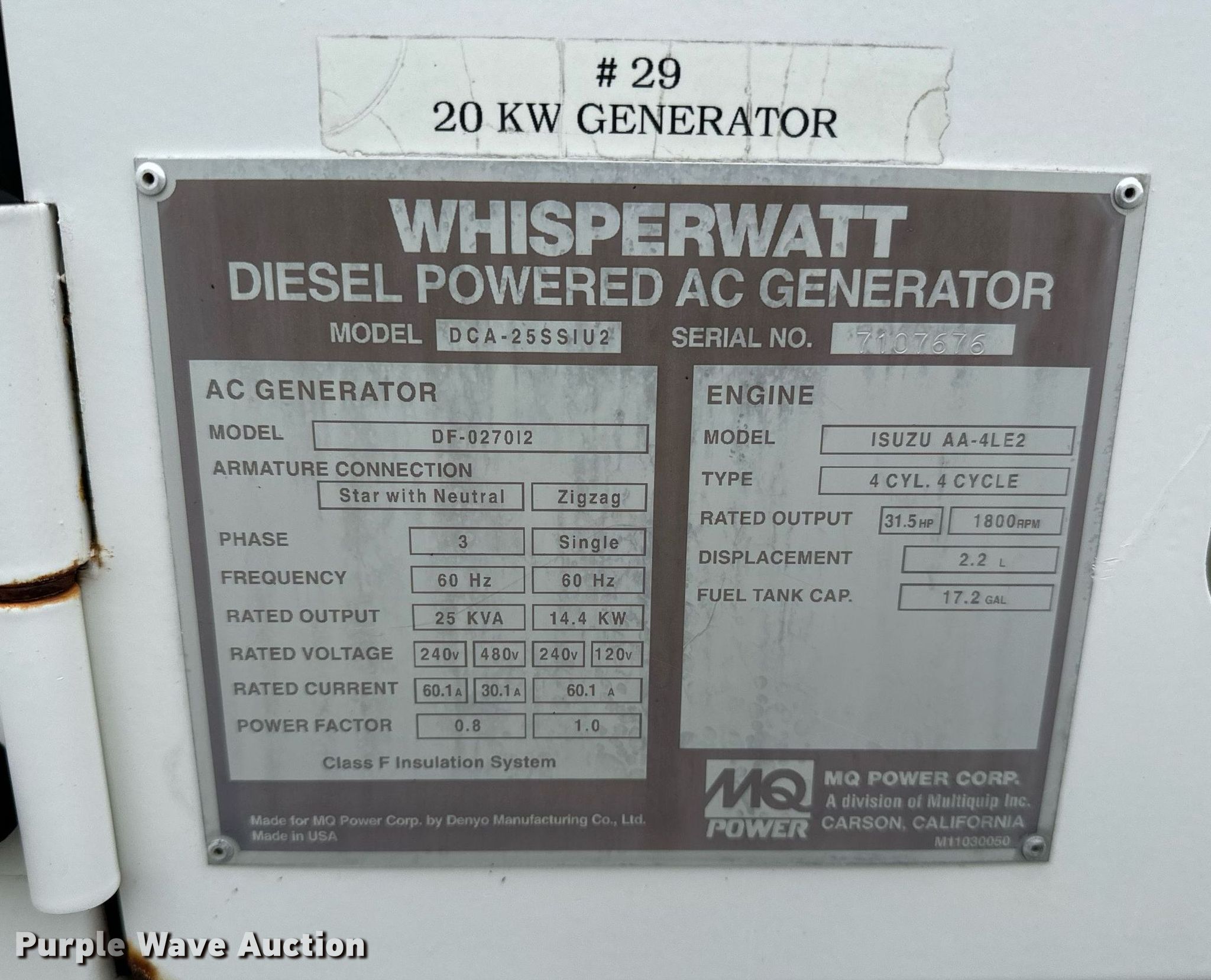 MQ Power Denyo generator. Hours: 30,696 on meter, Serial: 7107676. Engine Isuzu AA-4LE2, Displacement: 2.2L, Cylinders: 4, Fuel type: Diesel. Features Generator Whisperwatt DF-0270I2, kVA: 25, kW: 14.4, Phase: Single, Three, Fuel tank. Trailer 11' L x 54" W, Ball hitch size: 2", Suspension: Spring, Axles: Single, Tire size: 175/80R13. This is worksite support equipment and will not come with a title. Transfer of ownership documentation will be a bill of sale. 15107 North 137th East Avenue. Collinsville, OK 74021