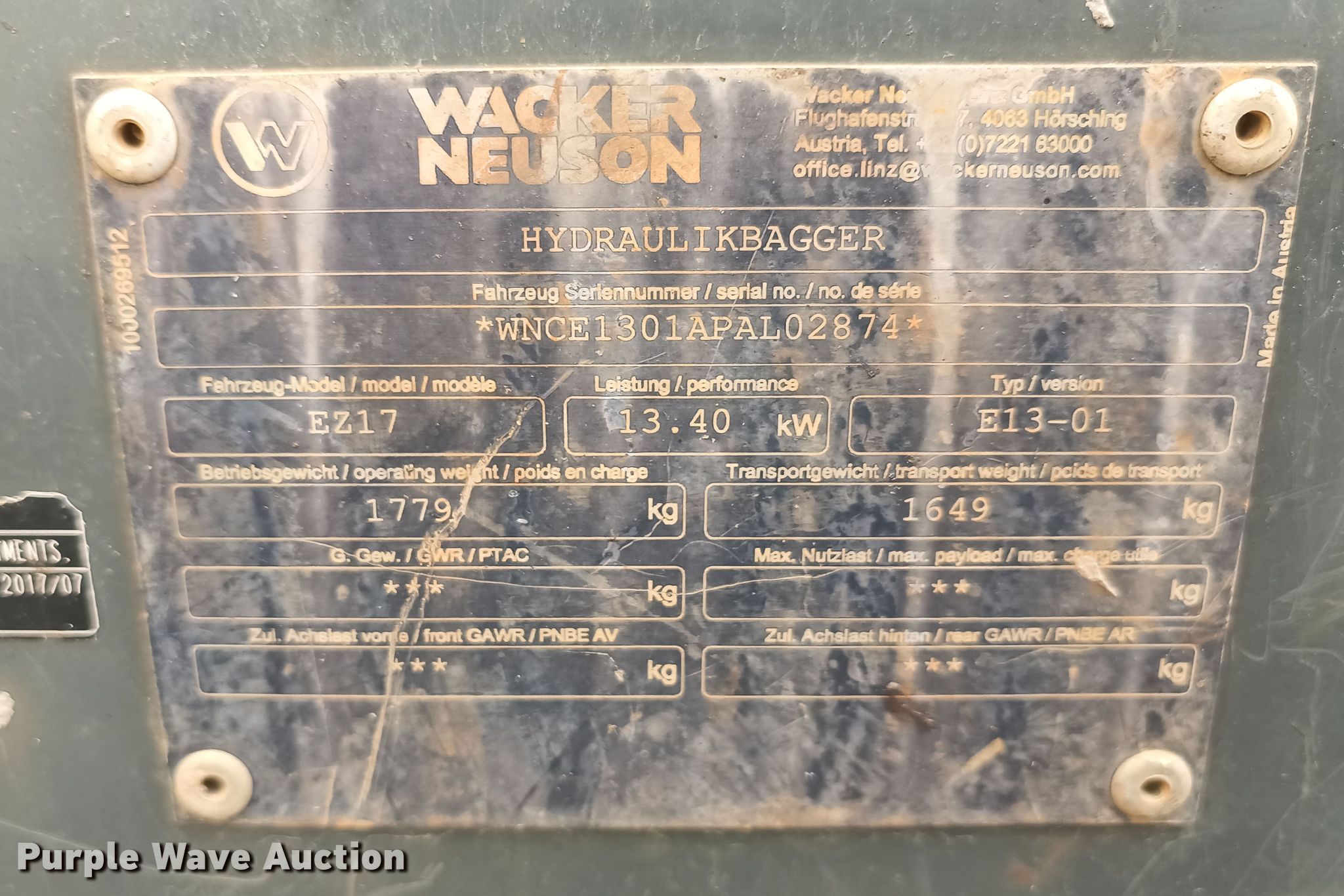 Purple Wave is selling a used Mini Excavator in Missouri. This item is a Wacker Neuson EZ17 mini excavator with the following: Hours: 1,034 on meter, Serial: WNCE1301APAL02874