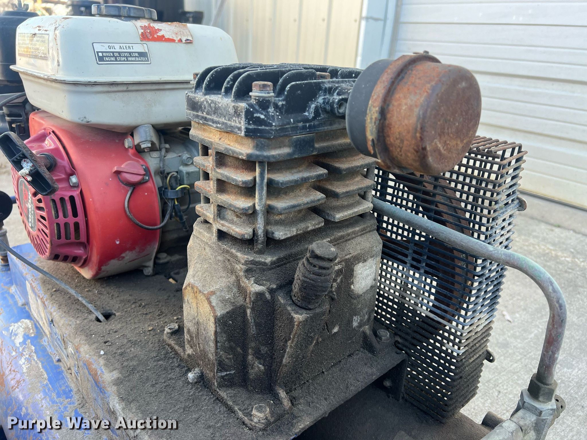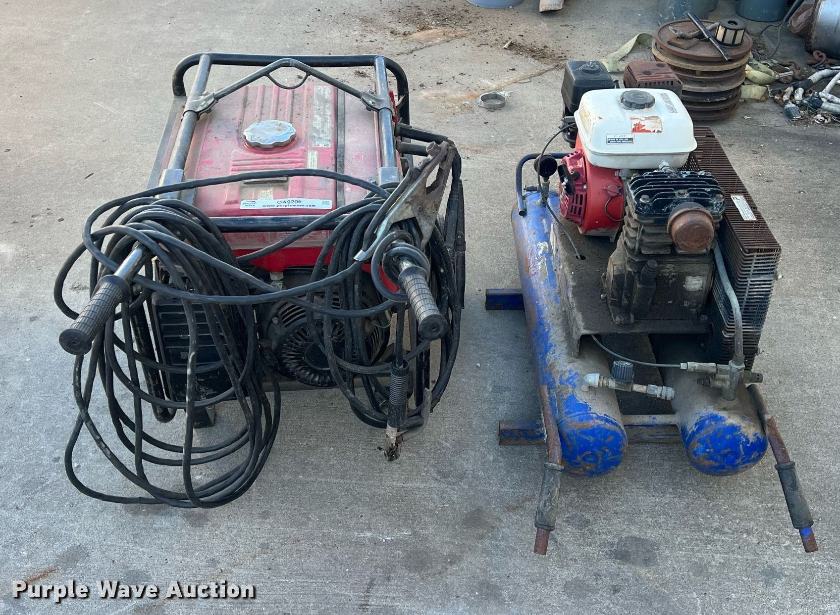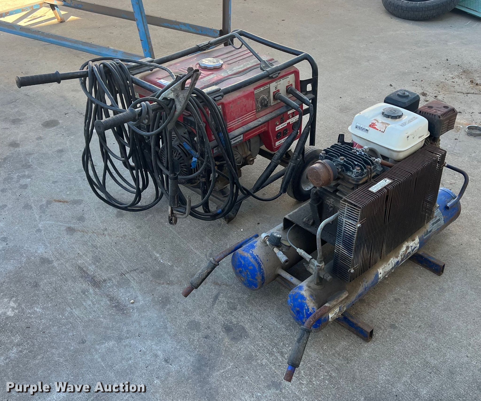 Purple Wave is selling a used Tools in Kansas. This item is a Tools with the following: Air compressor, Honda gas engine, Hp: 5.5, Max PSI: 125, Tank: 8 gallons, Welder, Honda Gas engine