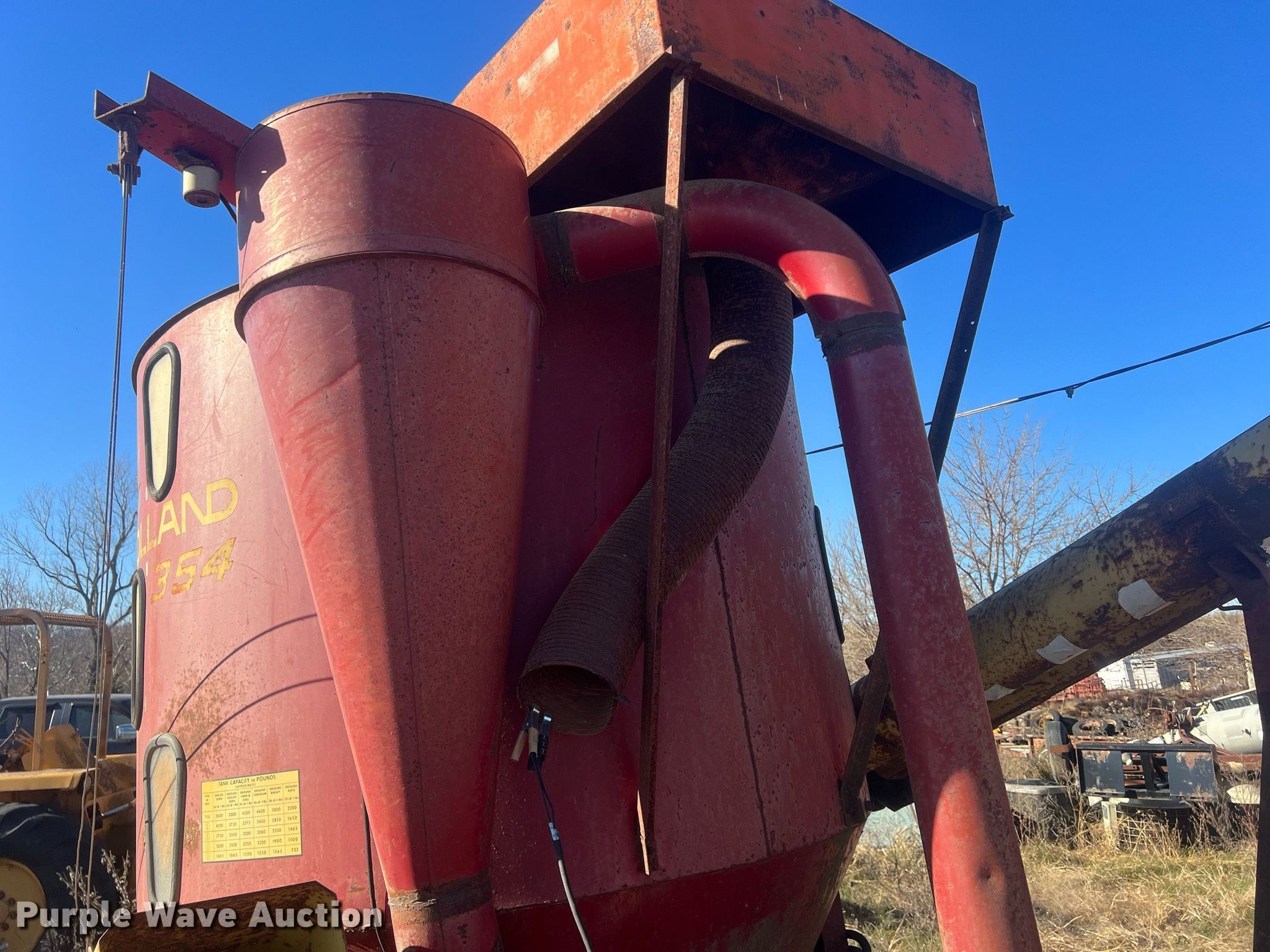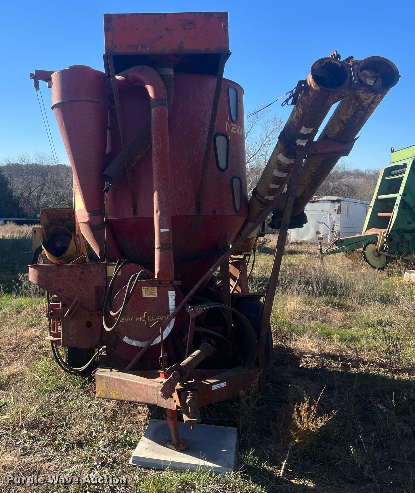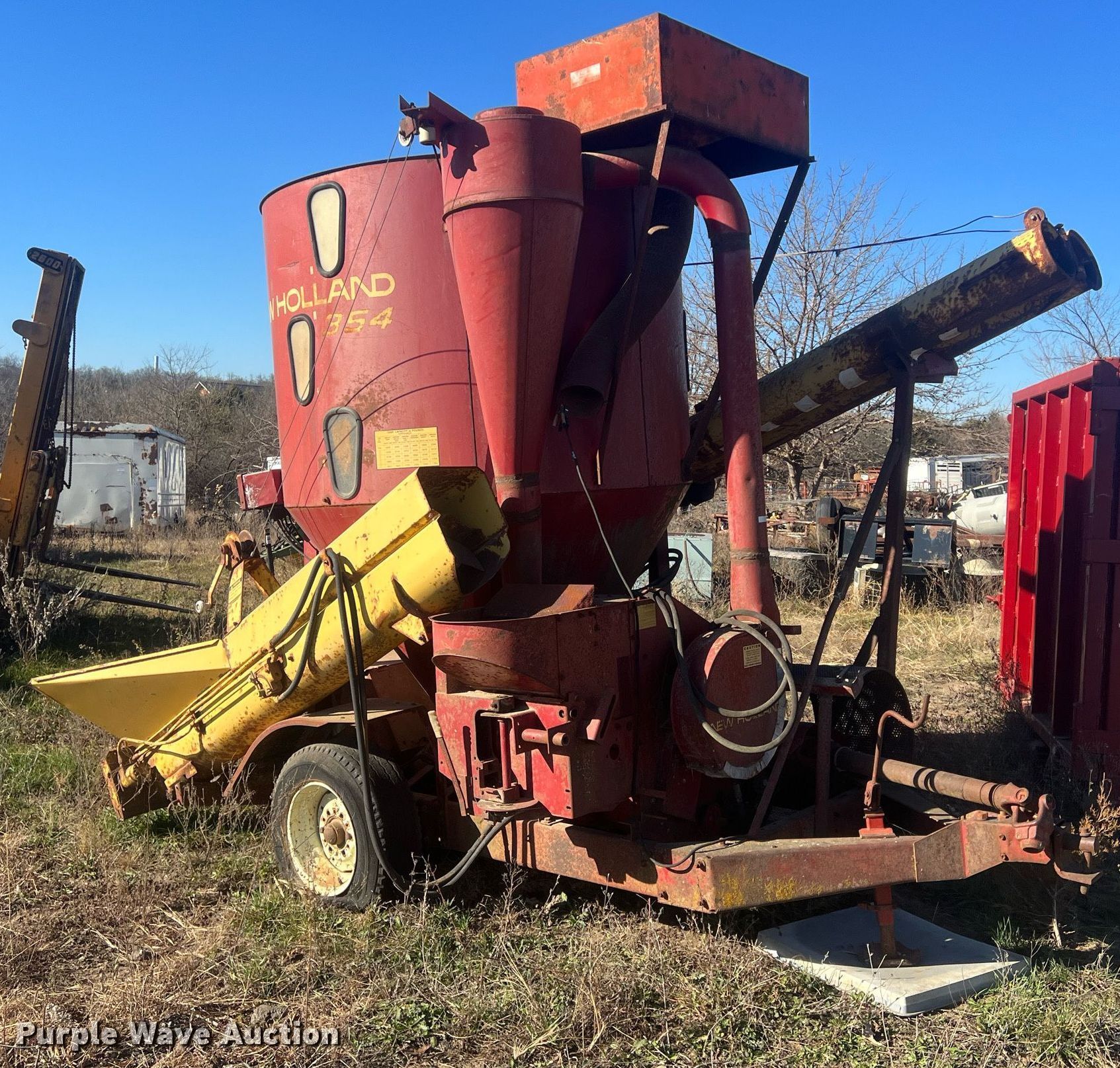 Purple Wave is selling a used Feed Mixer or Bale Processor in Kansas. This item is a New Holland 354 feed grinder/mixer with the following: PTO: 540, Scales, Auger, Quantity: 2, Diameter: 10", Discharge: Side, Hammer Mill