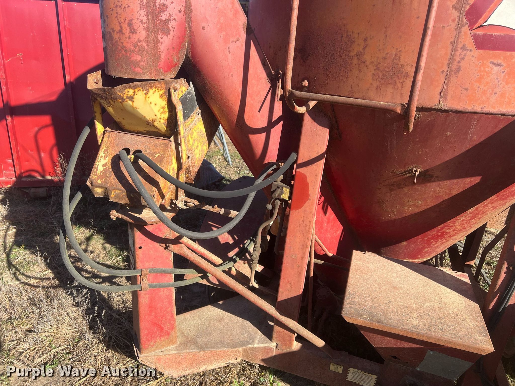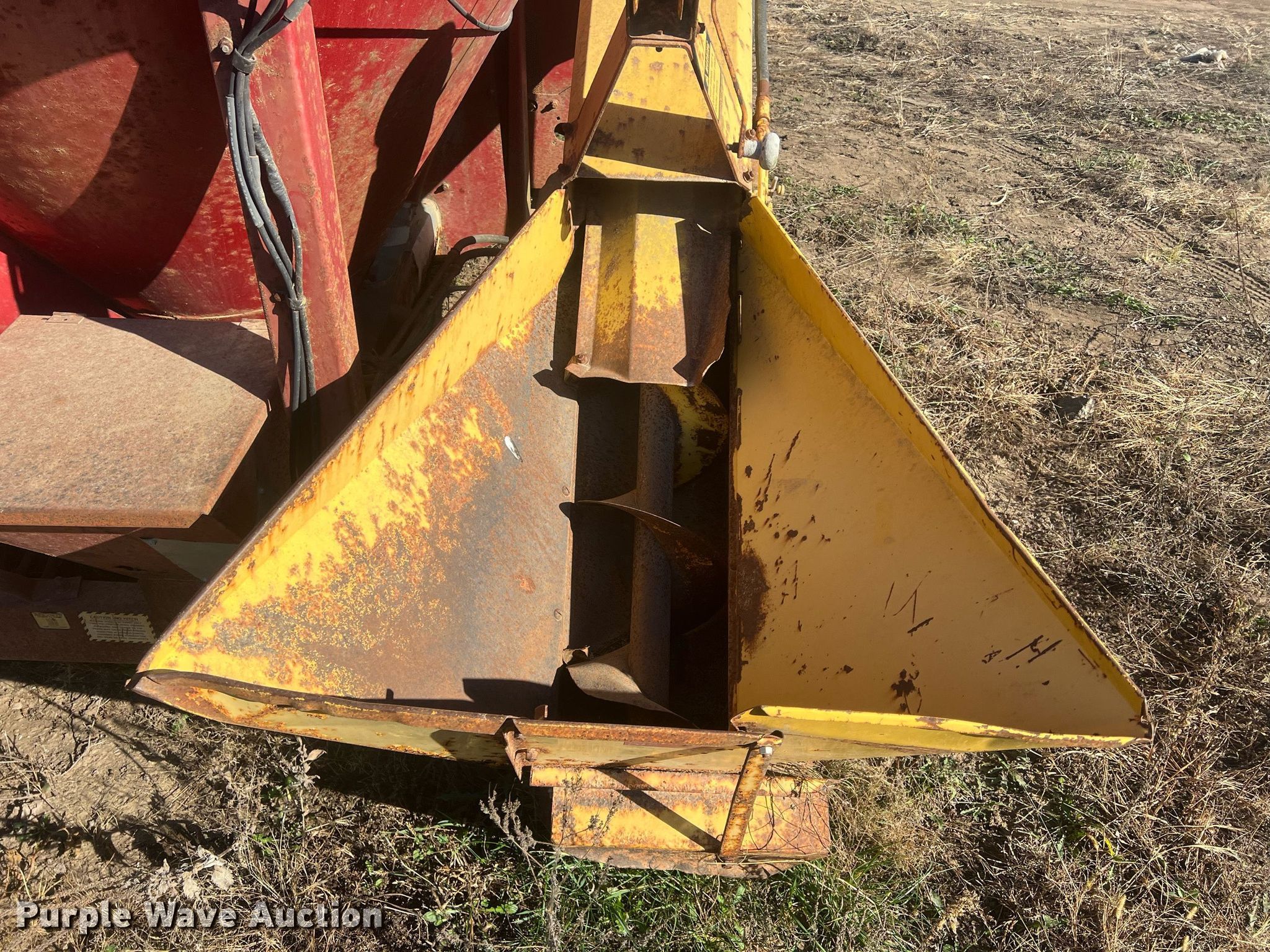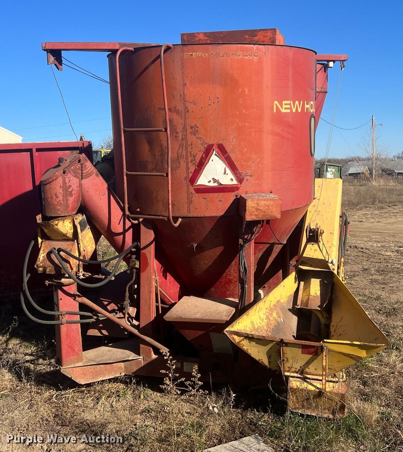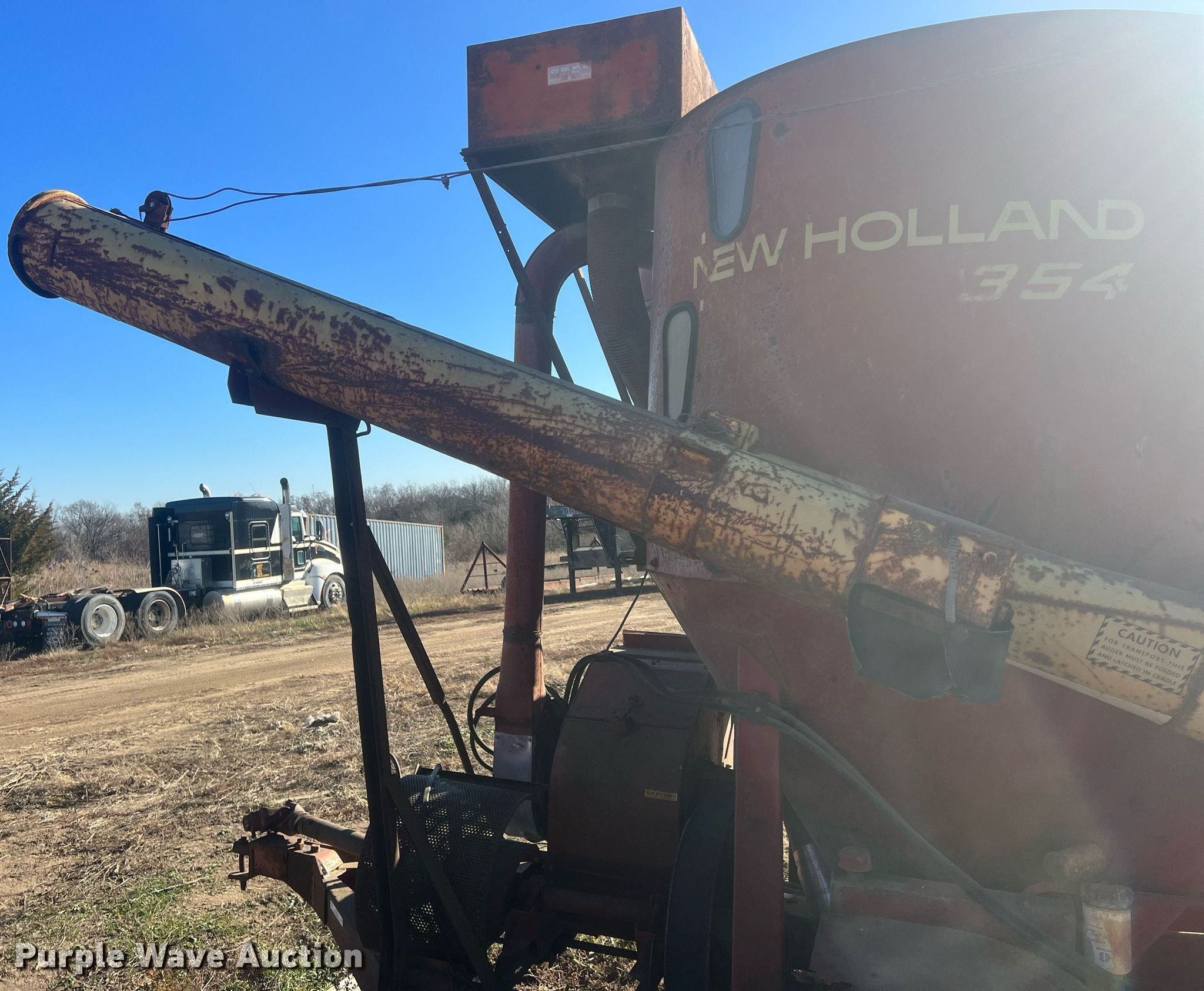 Purple Wave is selling a used Feed Mixer or Bale Processor in Kansas. This item is a New Holland 354 feed grinder/mixer with the following: PTO: 540, Scales, Auger, Quantity: 2, Diameter: 10", Discharge: Side, Hammer Mill