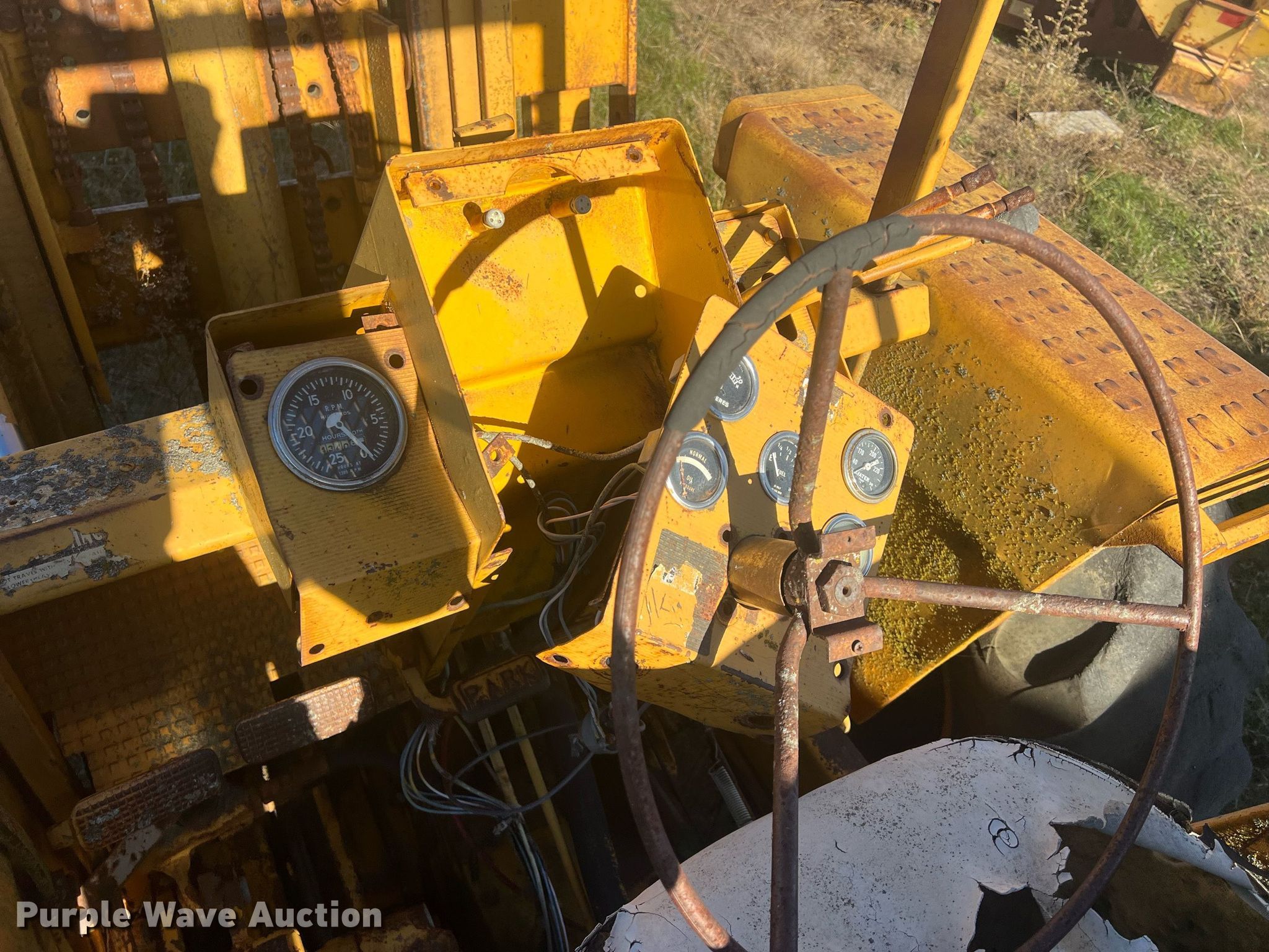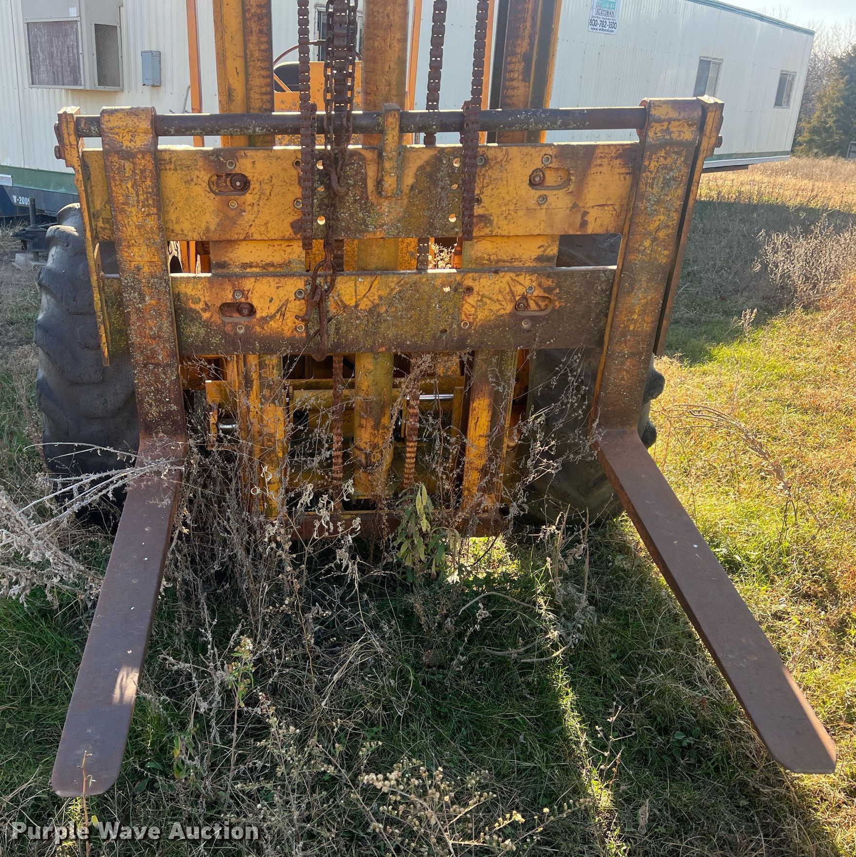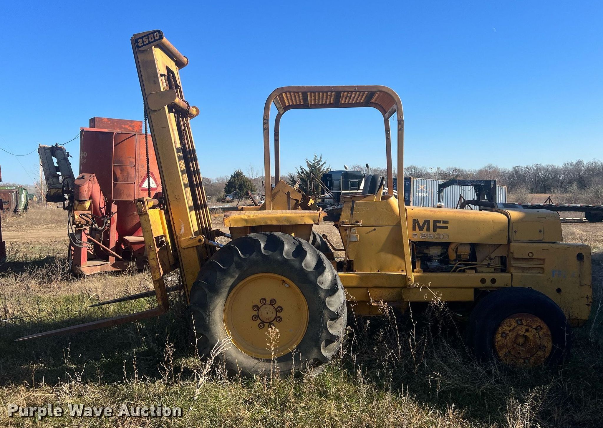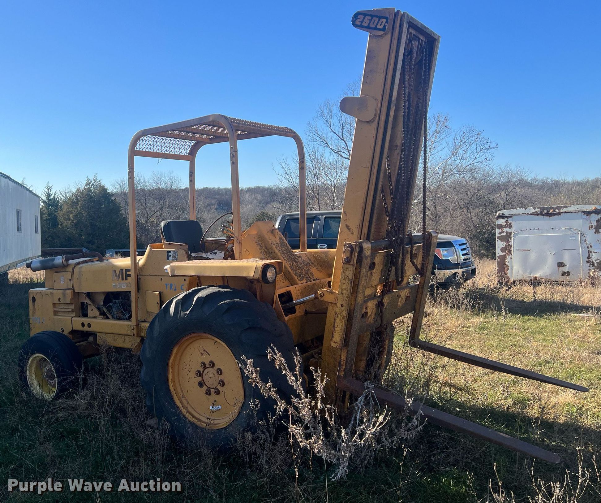Purple Wave is selling a used Strt. Mast Rough Terr. Forklift in Kansas. This item is a Massy Ferguson 2500 forklift with the following: Hours: 4,341 on meter, Serial: 200034