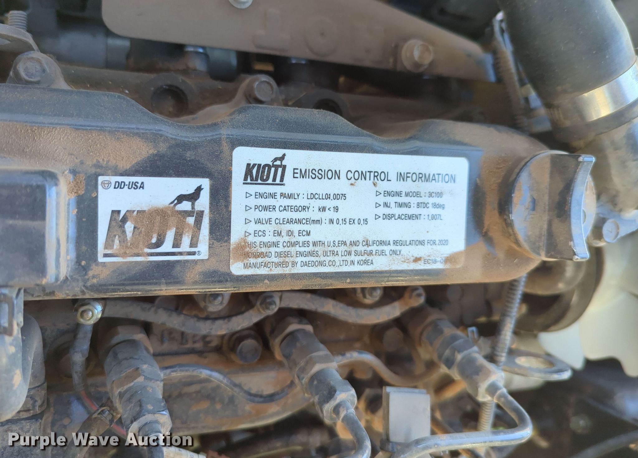 Kioti Mec2200 utility vehicle. Hours: 129 on meter, Serial: X20600070. Engine Kioti, Cylinders: 3, Fuel type: Diesel, Electric start. Transmission Automatic. Chassis Four wheel drive. Operators station Canopy. Features Grill guard, Dump bed 38" L x 56" W, Dump bed type: Manual. Tires Size: 25x10.00-12. Transfer of ownership documentation will be a bill of sale. Guthrie, OK 73044
