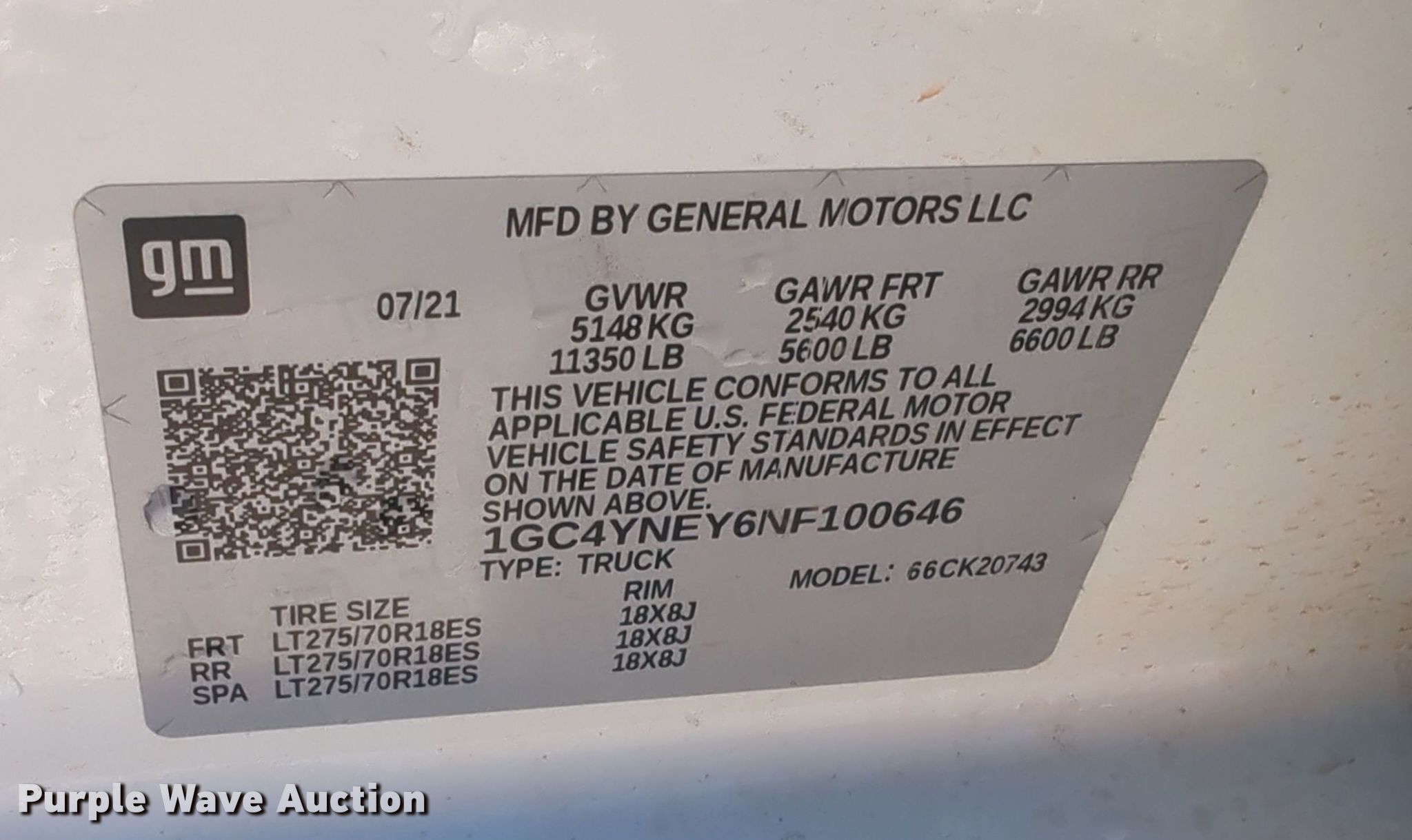 2022 Chevrolet Silverado 2500HD Crew Cab pickup truck. Miles: 84,900 on odometer, VIN: 1GC4YNEY6NF100646. Engine Displacement: 6.6L V8 OHV , Cylinders: 8, Fuel type: Diesel. Transmission Automatic, Four wheel drive. Interior AC, Heat, Seat: Power driver, Power windows, Power locks, Cruise control. Tires Size: 275/70R18. Notes Decals will be removed prior to auction. Oklahoma title. Title distribution may be delayed up to 14 days from verification of funds. Guthrie, OK 73044