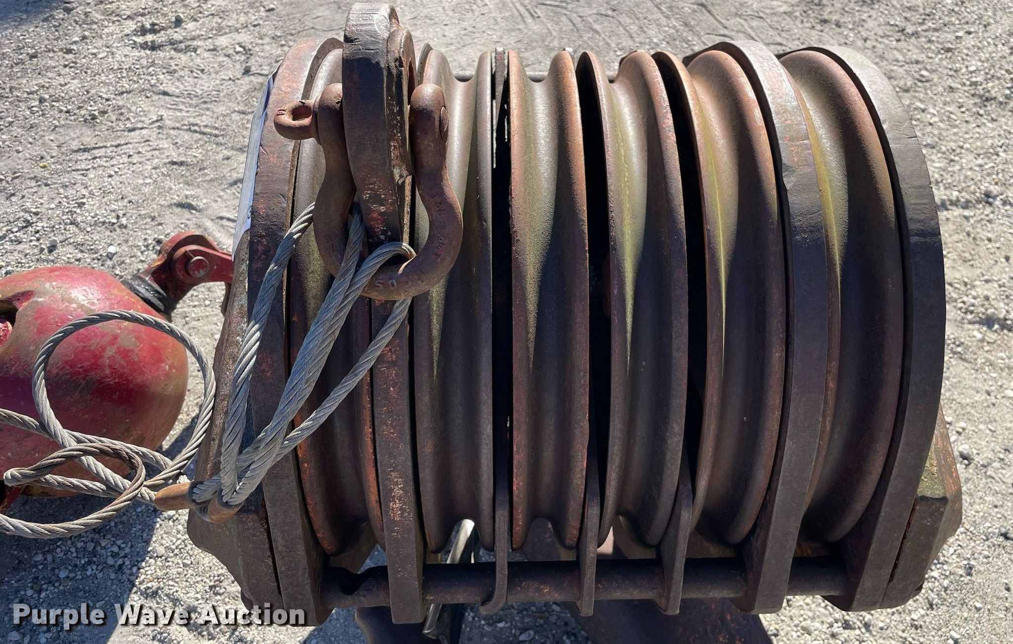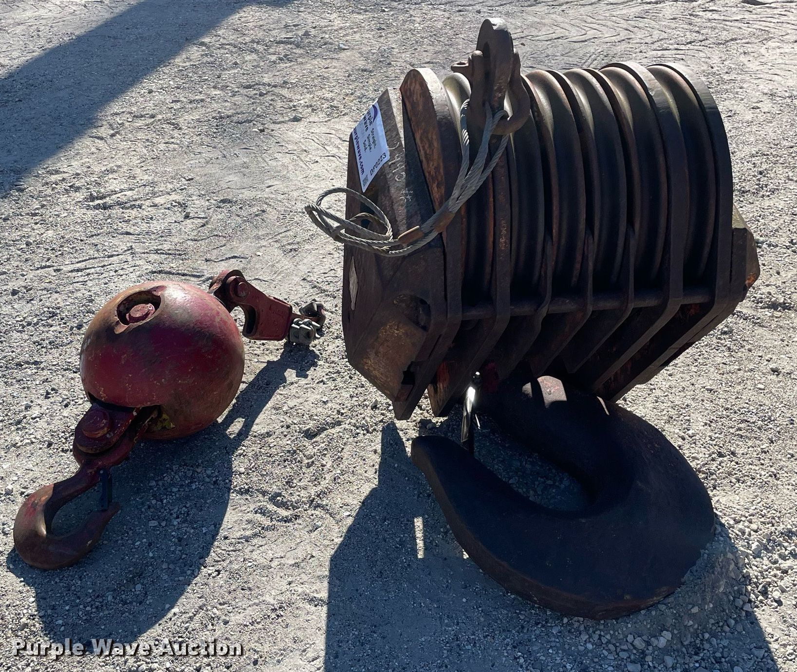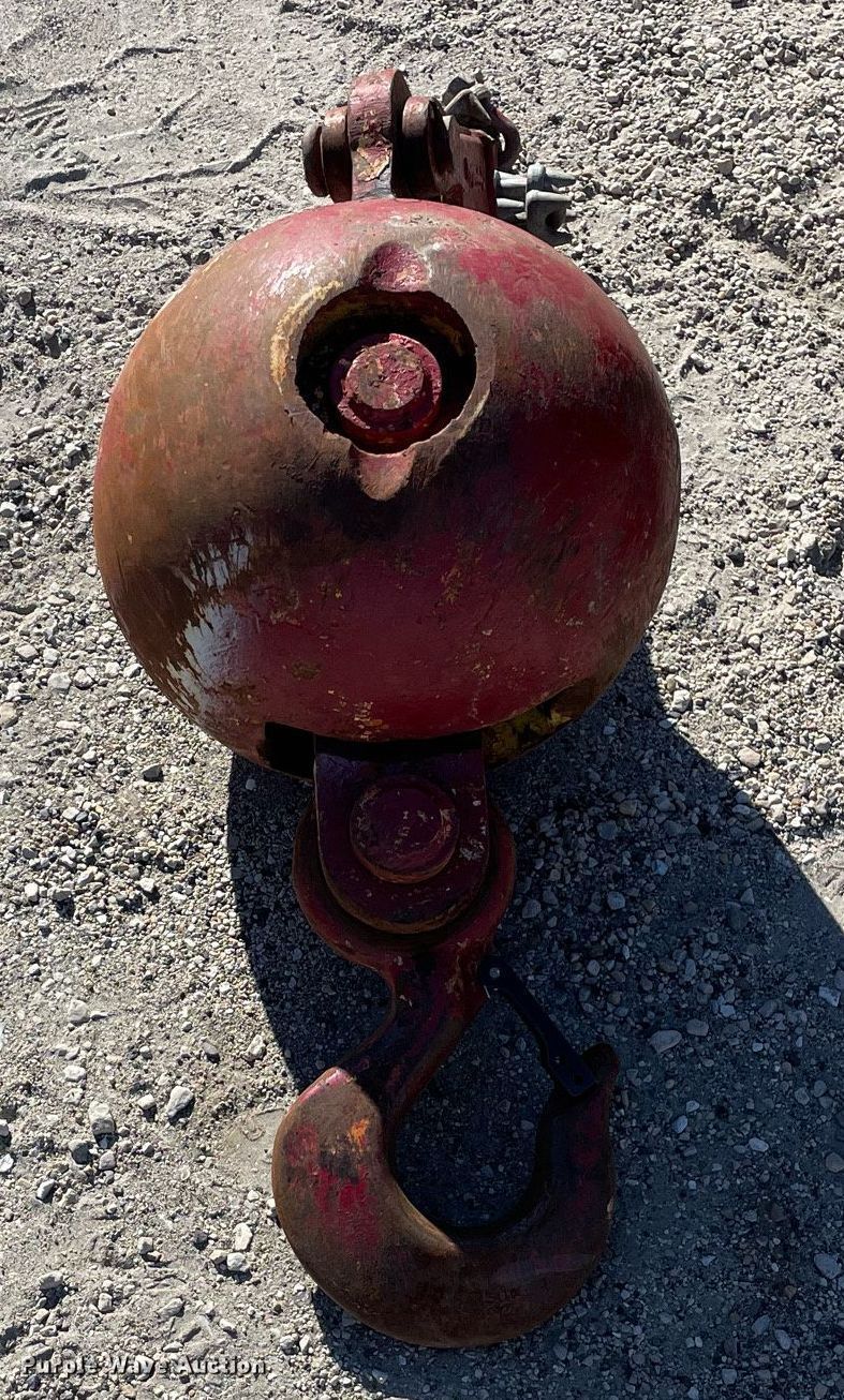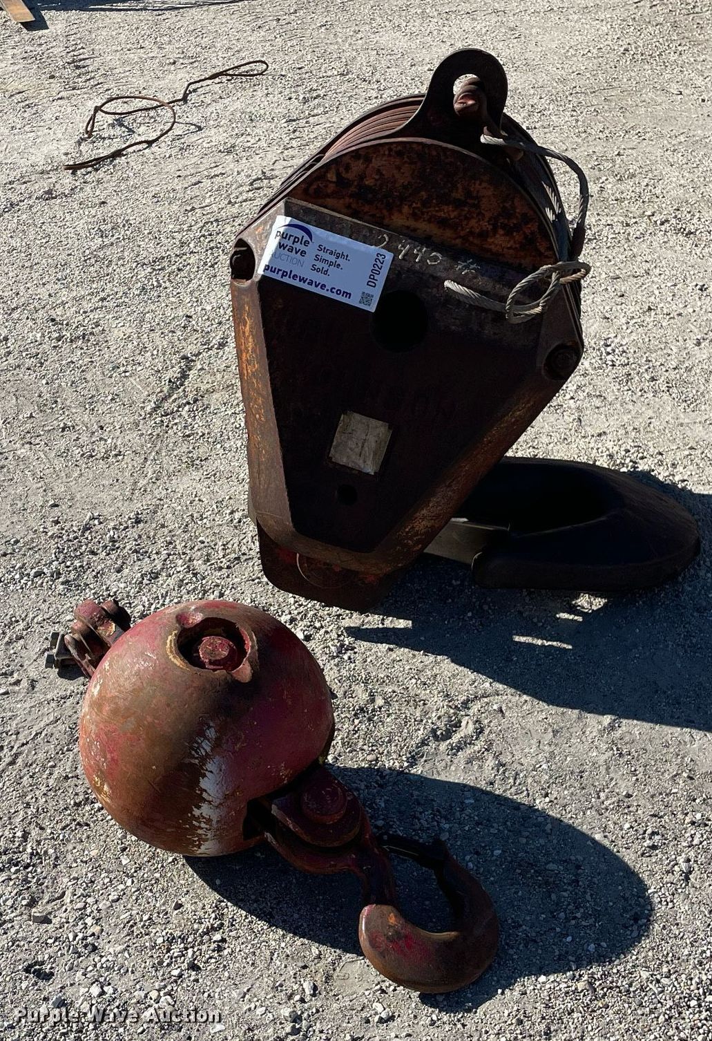 Purple Wave is selling a used Crane Attach. in Illinois. This item is a Johnson crane attachments with the following: Crane block and hook, Capacity: 100 tons, Sheaves: 6, Approx. 2,440 lbs, Crane ball and hook, Capacity: 12 tons, Approx. 400 lbs