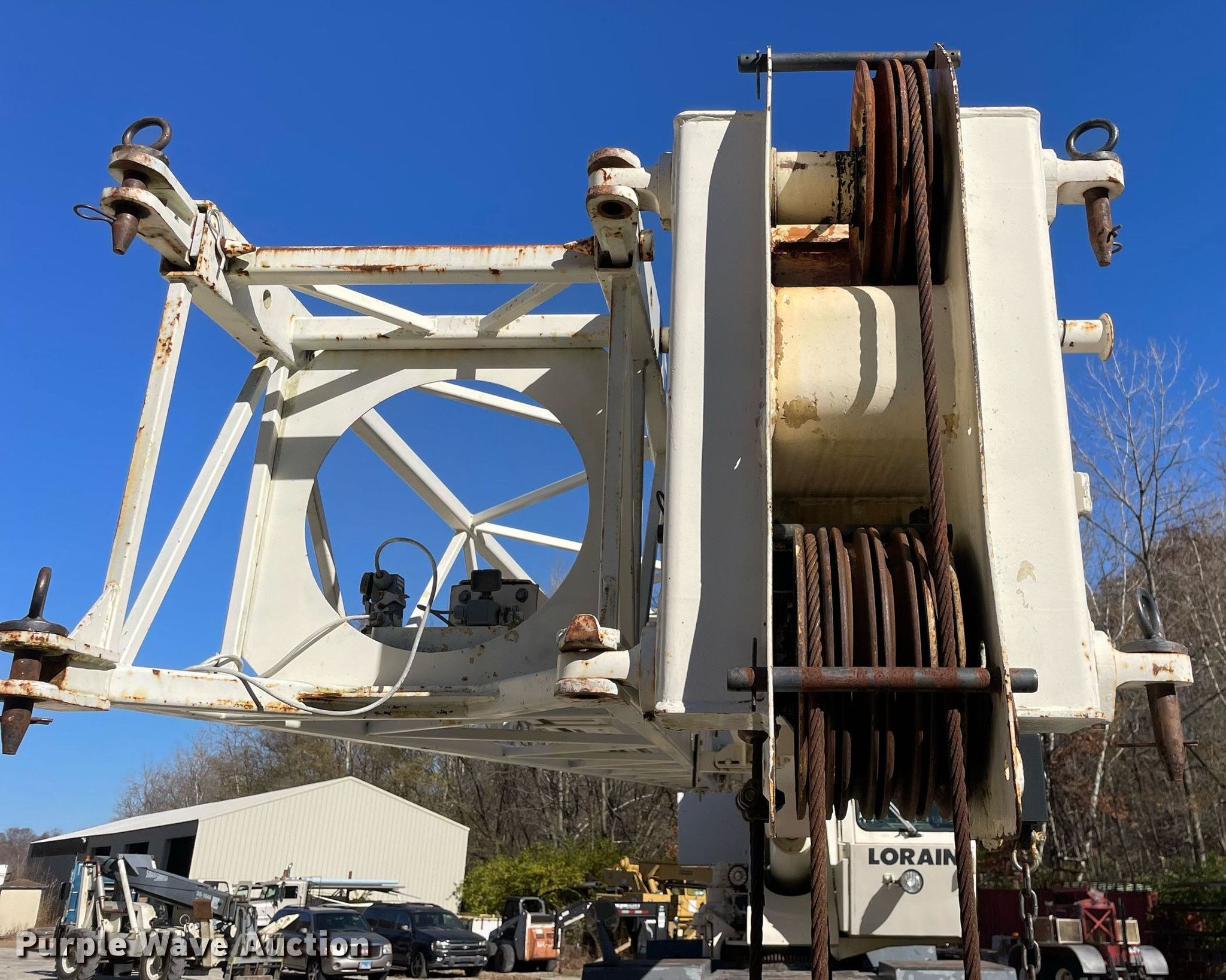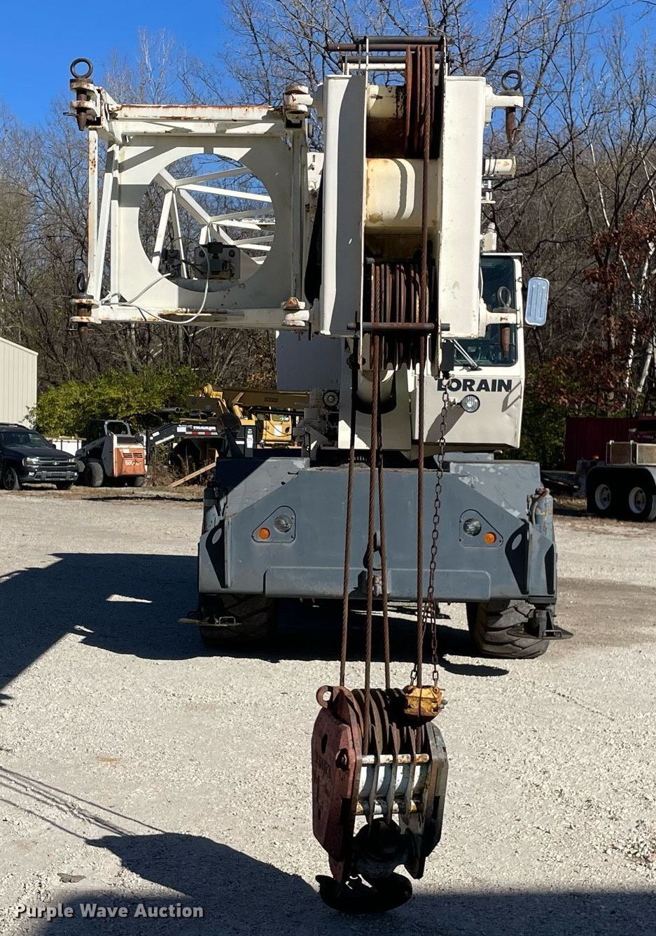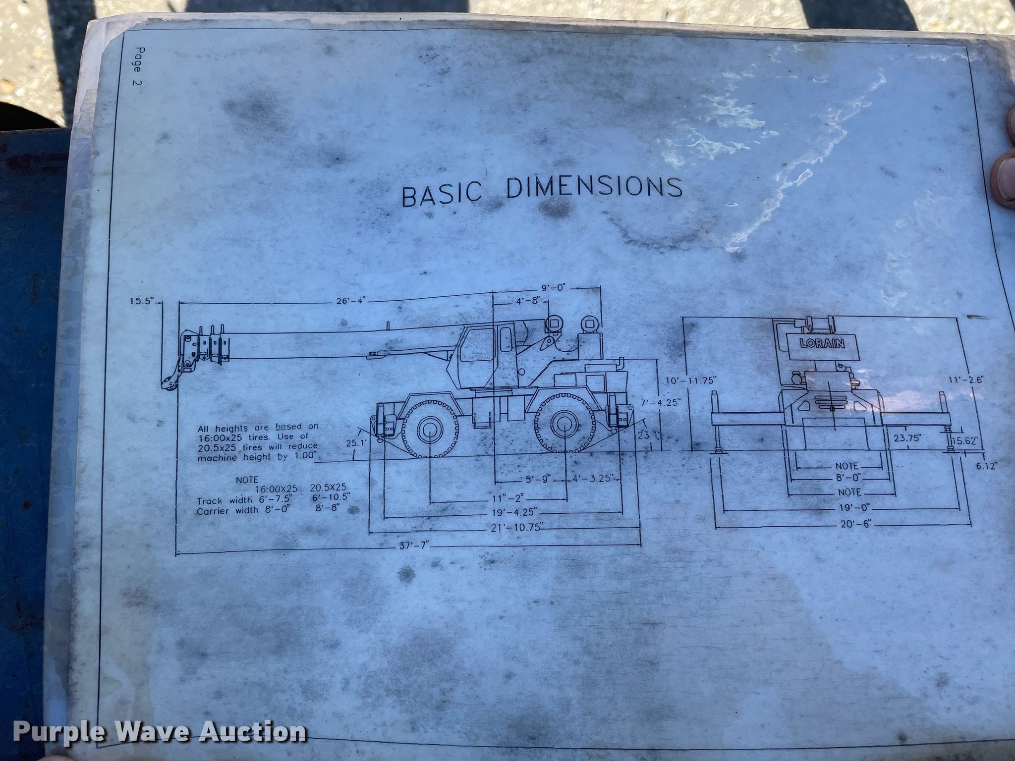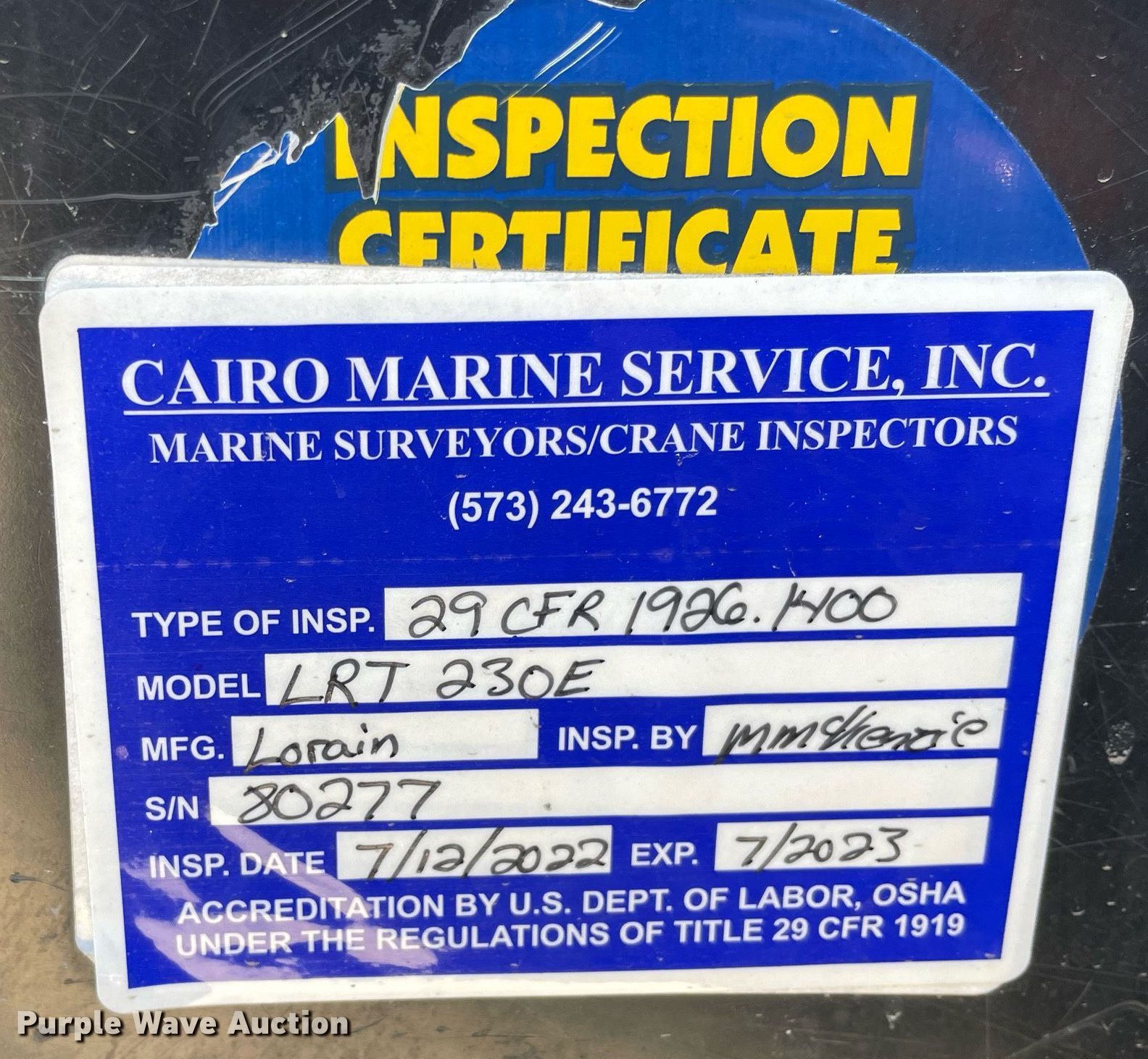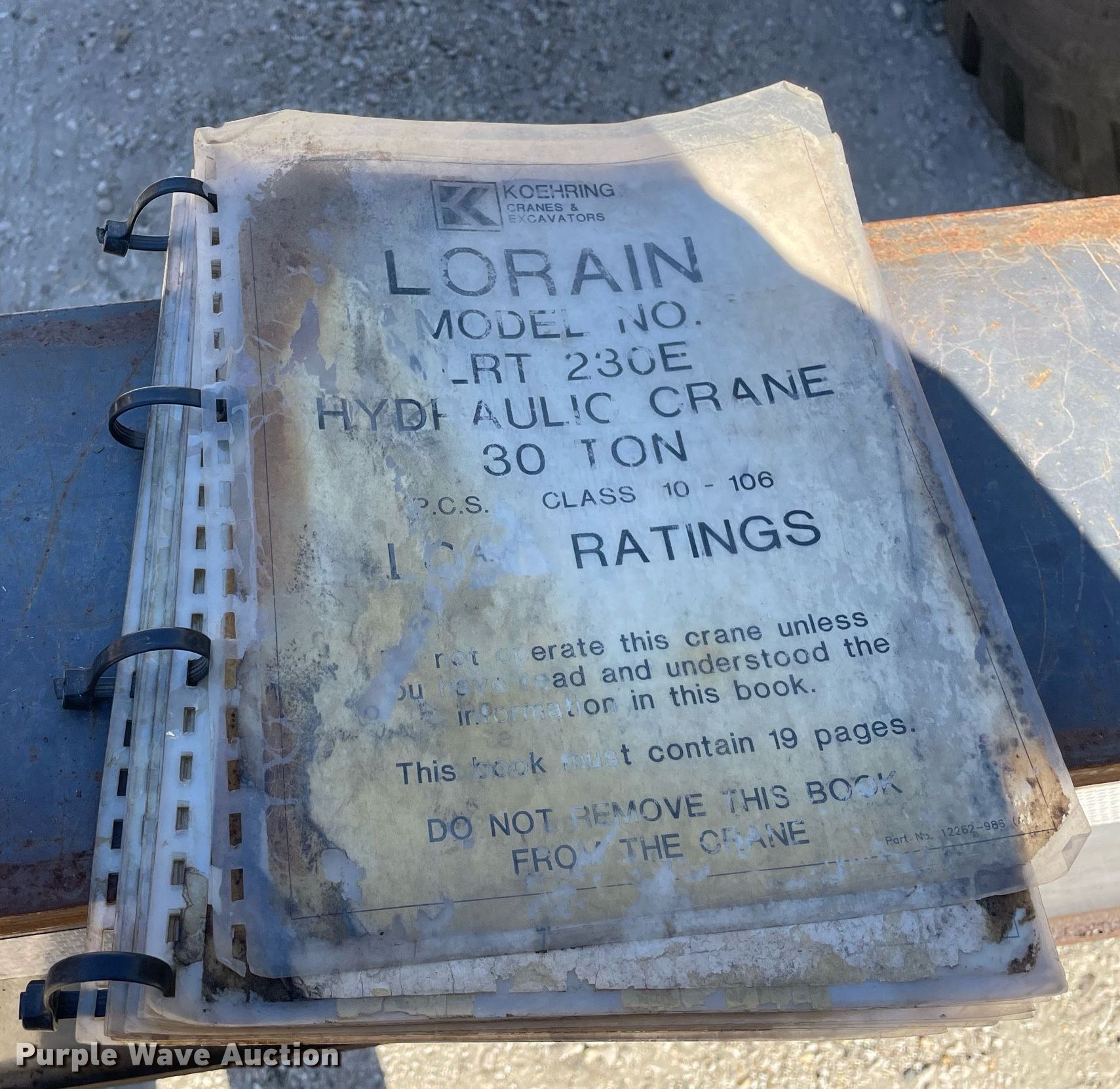 1994 Loraine LRT230E crane. Serial: 80277. Engine Cummins , Displacement: 5.9L, Cylinders: 6, Fuel type: Diesel. Transmission Powershift, 3F - 3R. Chassis Axles: Single, Brakes: Air. Operators station Enclosed cab, Heat, Crane controls: Stick, Upper interior Load monitor Microguard 404.. Features Boom Telescopic, Maximum boom length: 94' Sections: 4, Maximum lift capacity: 60,000 lbs, Maximum lift height: 137', Jib: 26' L, Stabilizers: 4, Boom controls In-cab, Winches: 1, Removable counter weight, Crane block Sheaves: 4, Capacity: 60,000 lbs, Crane ball & hook, Certification valid through: 07/2023, Manuals, Lift chart. Tires Size: 20.5-25. M&W Contractors, Inc.. 900 Cole Street. East Peoria, IL 61611
