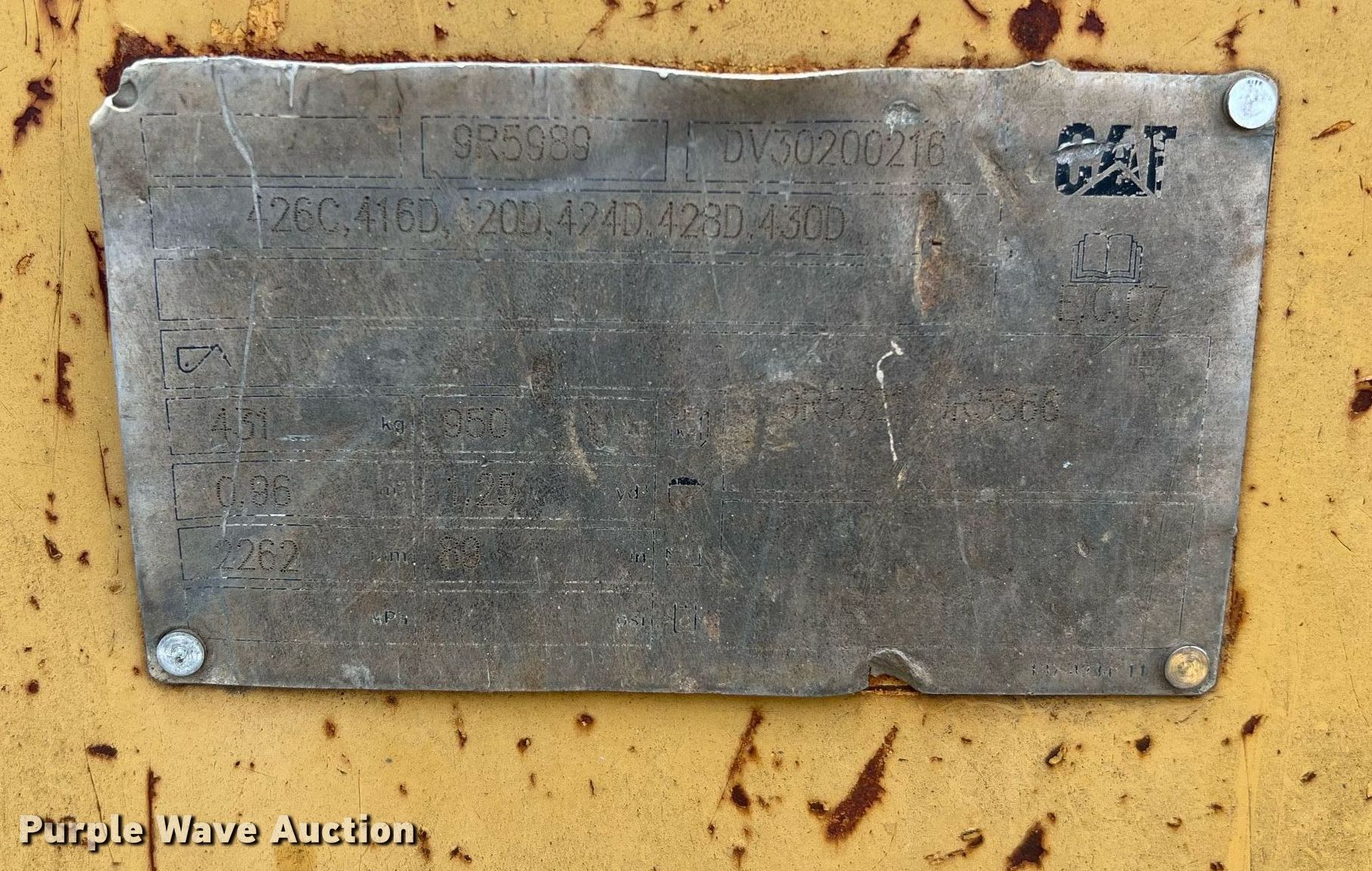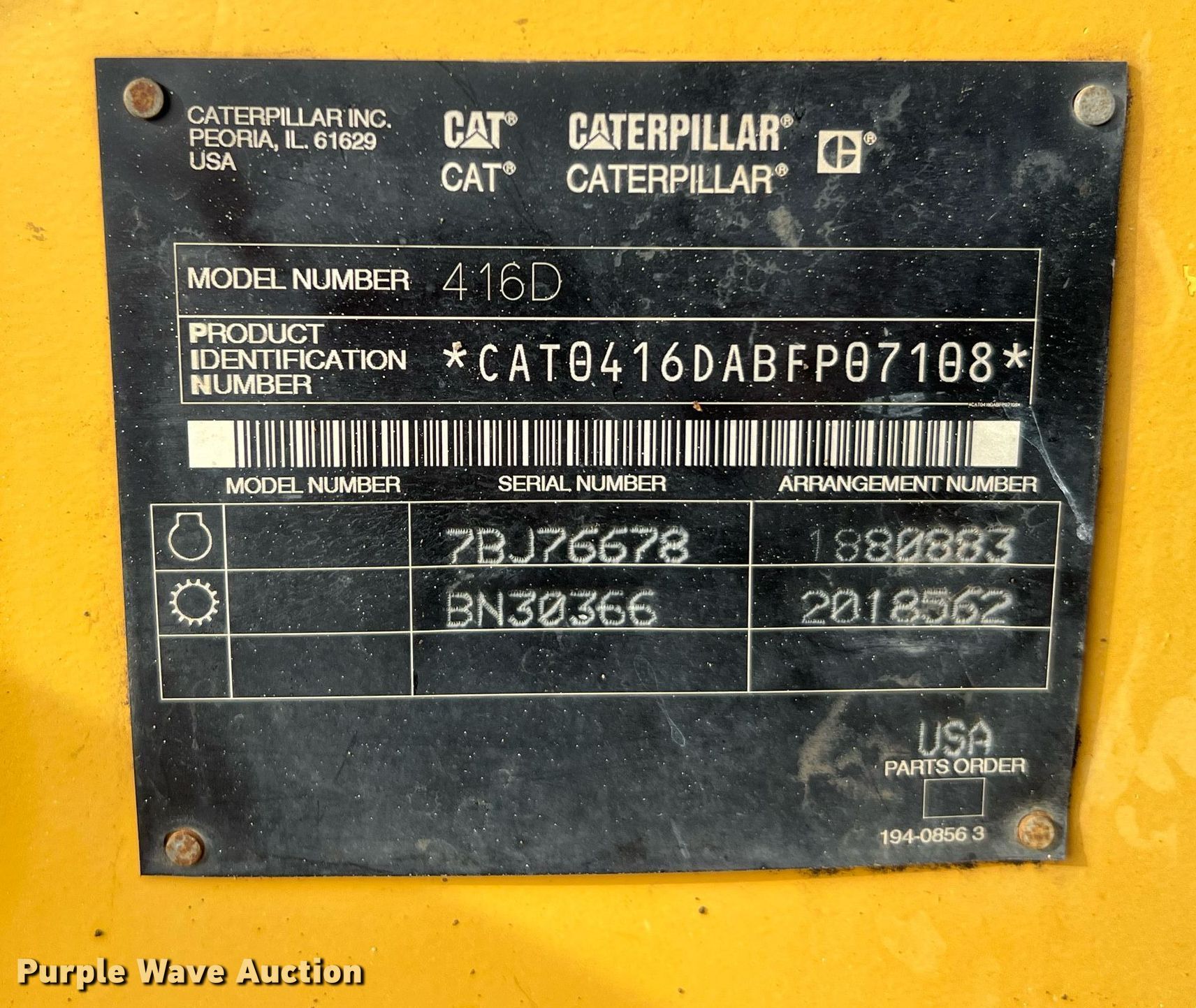 2003 Caterpillar 416D backhoe. Hours: Unknown, Serial: CAT0416DABFP07108. Engine Caterpillar, Serial: 7BJ76678, Cylinders: 4, Fuel type: Diesel. Transmission Shuttle shift, 4F - 4R. Chassis Four wheel drive, Differential lock. Operators station Backhoe controls: Wobble stick / two stick. Features Loader Bucket Caterpillar 9R5989, Capacity: 1.25 cu.yd., Width: 89", Cutting edge: Bolt-on, Backhoe Quick coupler: Manual, Auxiliary hydraulics. Tires Front: 12.5/80-18, Rear: 19.5L-24. Notes Non-operational hour meter. 420 Brooks Mill Road. Bertram, TX 78605