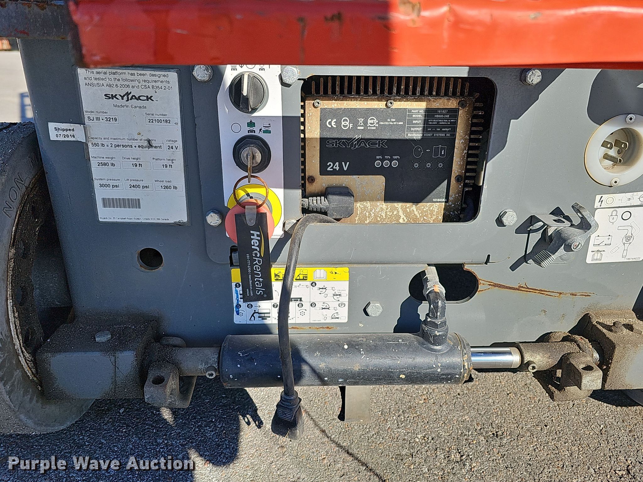 Purple Wave is selling a used Scissor or Vertical Lift in Nebraska. This item is a 2016 Skyjack SJIII 3219 scissor lift with the following: Hours: 165 on meter, Serial: 22100182