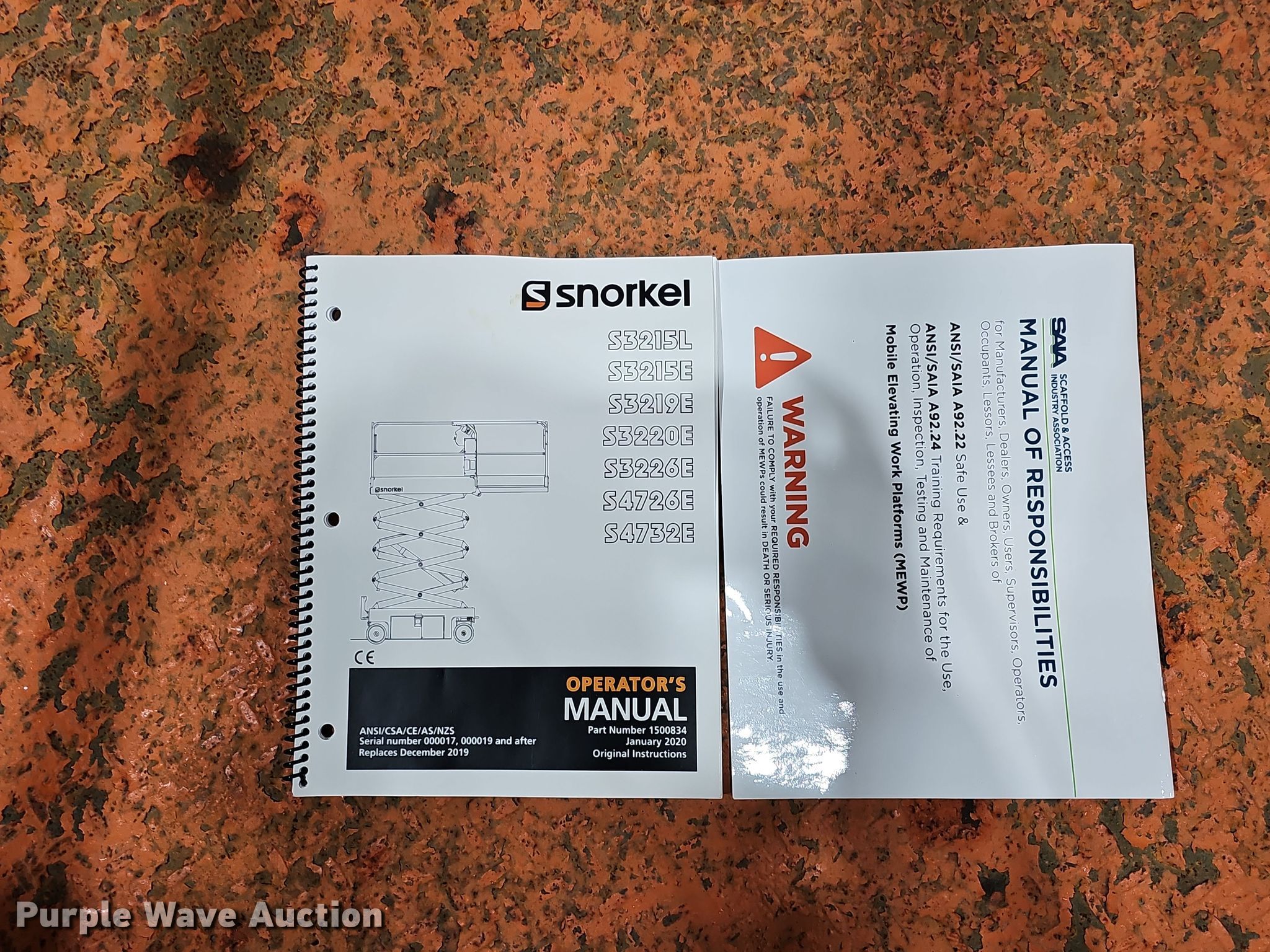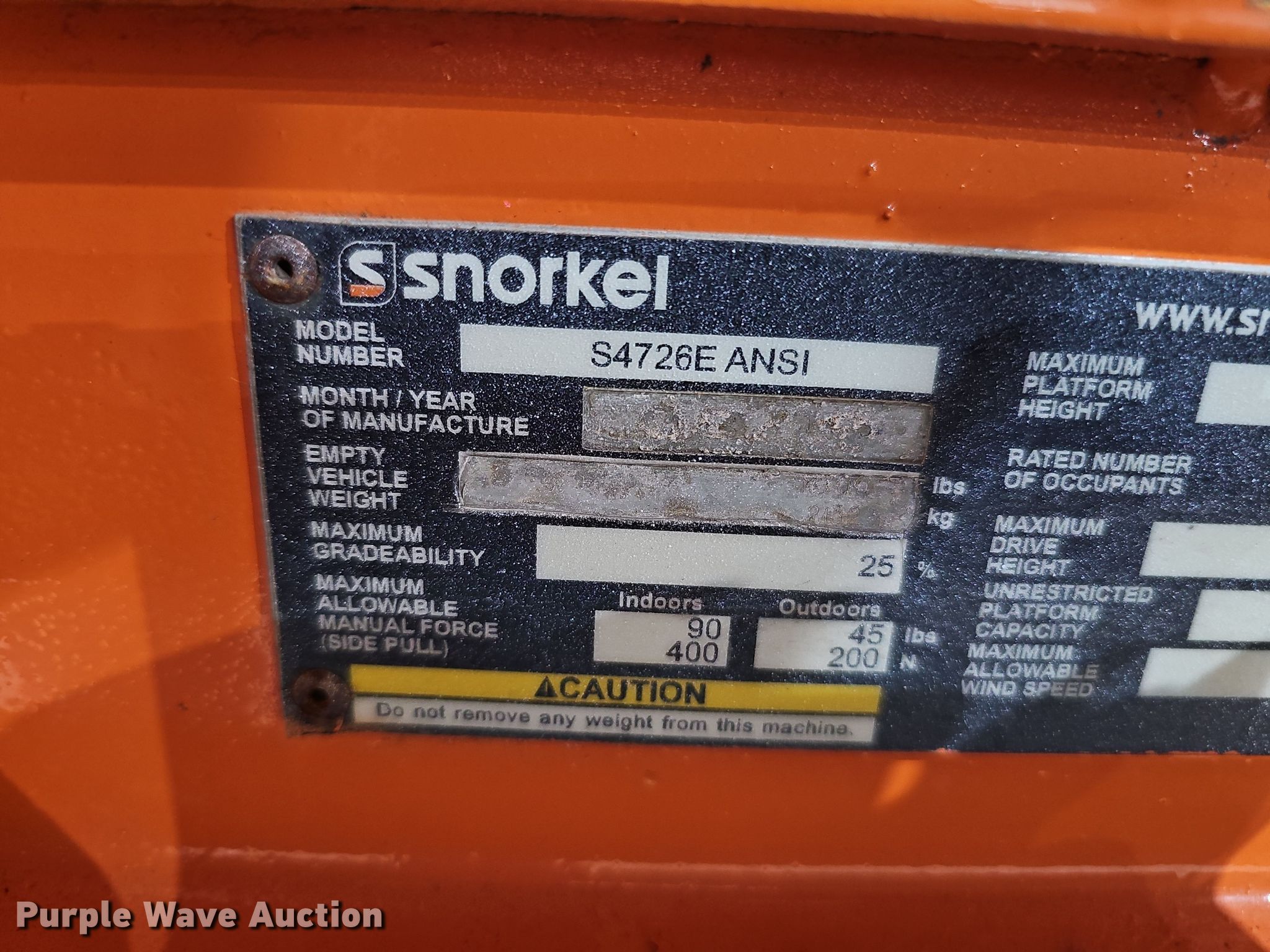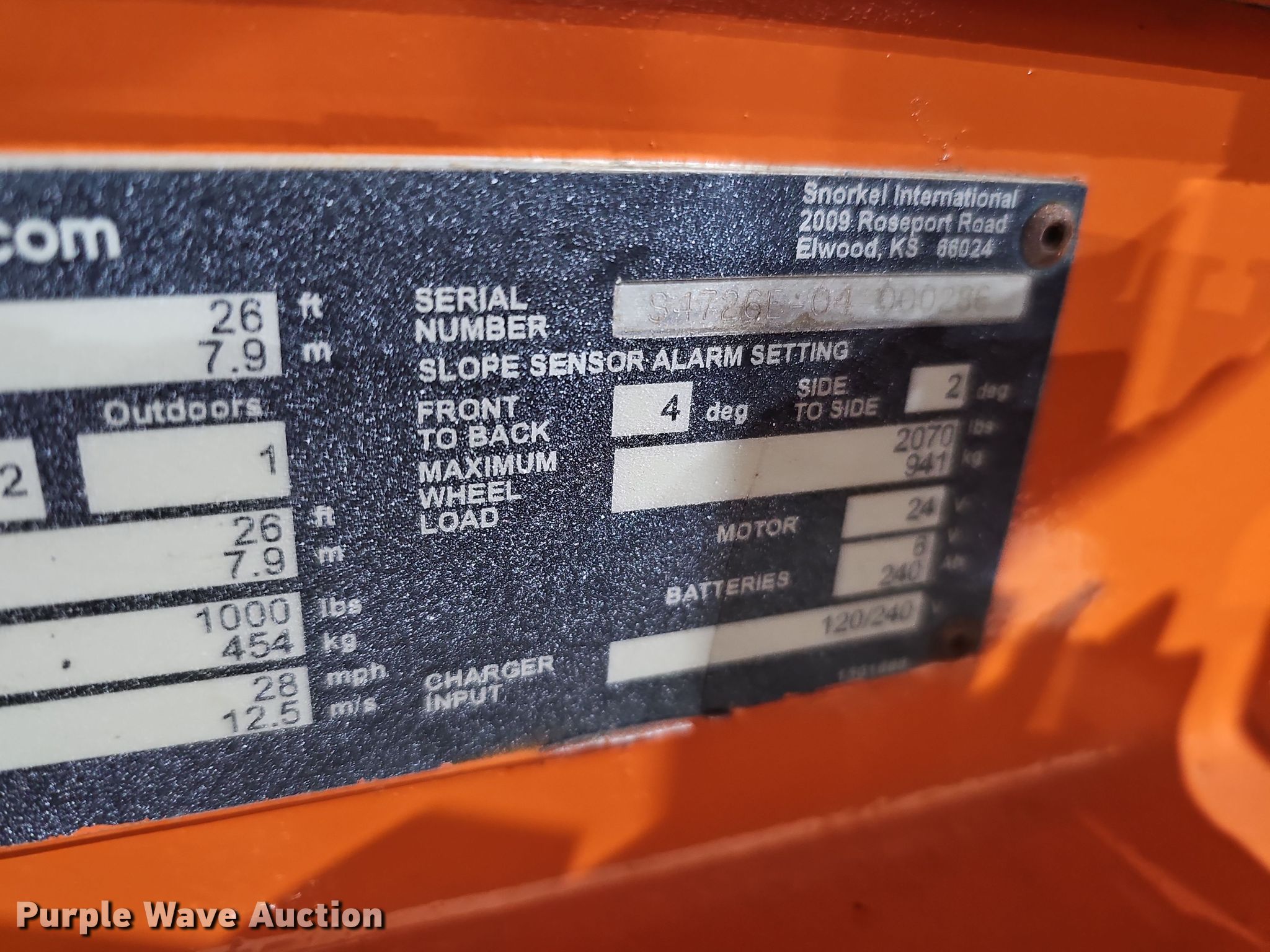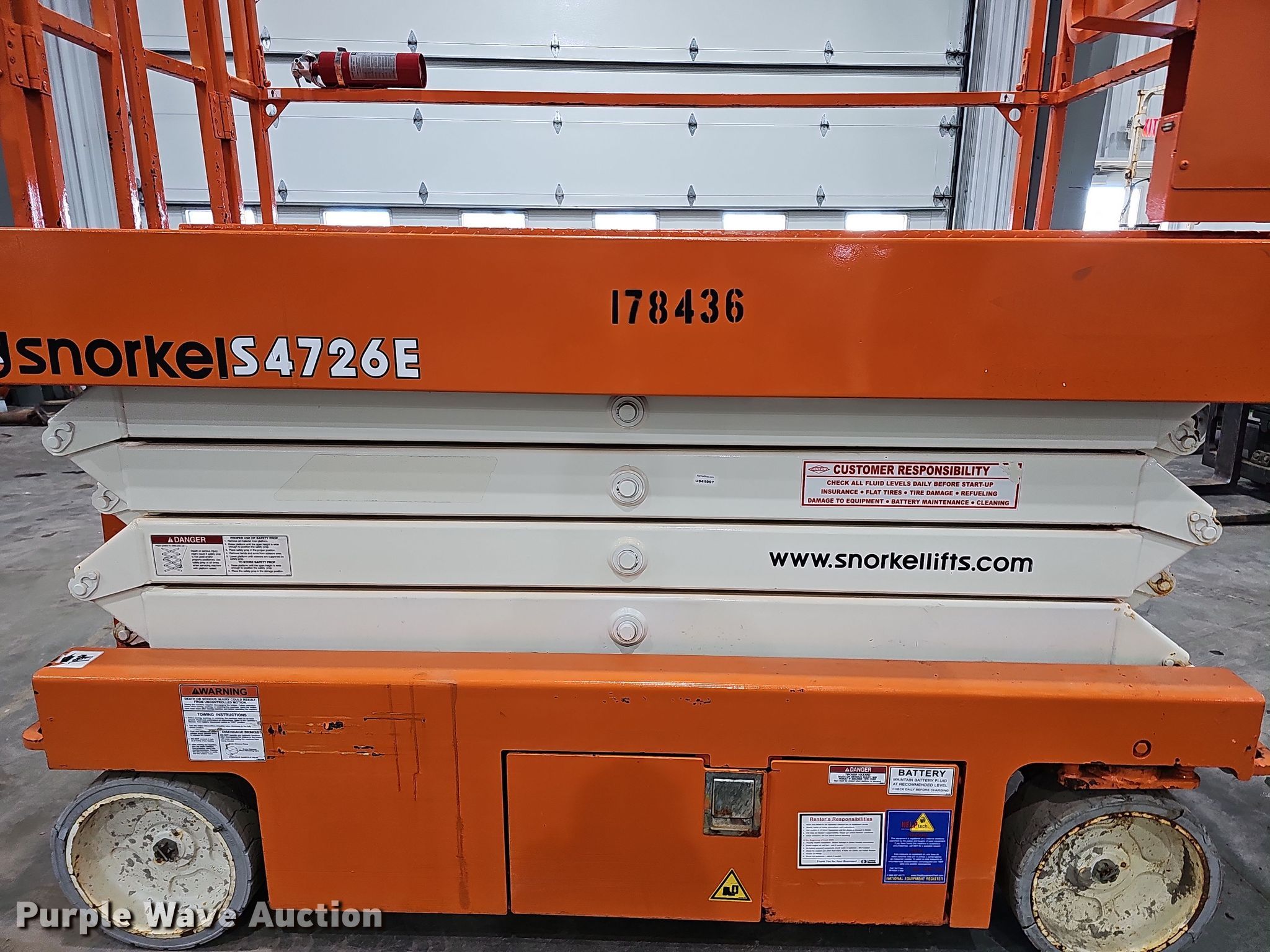Snorkel S4726E scissor lift. Hours: 517 on meter, Serial: 000286. Electric Motor Volts: 24. Features Maximum lift capacity: 1,000 lbs, Maximum lift height: 26', Platform: 135" L x 46" W, AC power outlet, Controls: Platform, Ground, Platform extensions: Manual, Safety alarm. Tires Tire size: 15x5, Solid, Non-marking. Notes Owners manual. JORDAN MACHINERY/ S & N Auto Sales. 25050 US Hwy 275. Waterloo, NE 68069