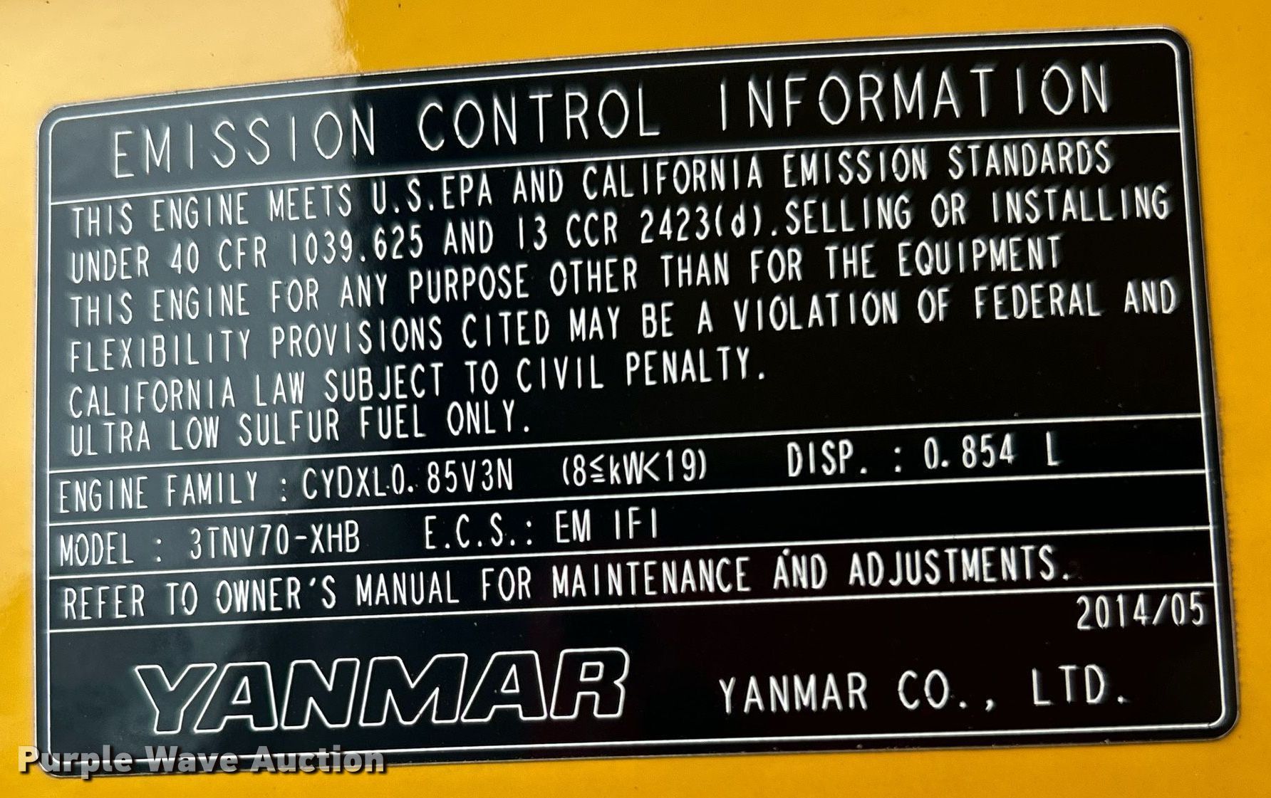 2014 John Deere 17D mini excavator. Hours: 1,607 on meter, Serial: 1FF017DXJE222755. Engine Yanmar 3TNV70-XHB, Displacement:.854L, Cylinders: 3, Fuel type: Diesel. Transmission Hydrostatic, Two speed travel. Operators station OROPS. Features Auxiliary hydraulics, Backfill blade Width: 50", Boom Swing, Stick Stick length: 3', Quick coupler: Mechanical, Bucket Width: 11", Teeth: 3. Tracks Width: 9", Rubber. 15107 North 137th East Avenue. Collinsville, OK 74021