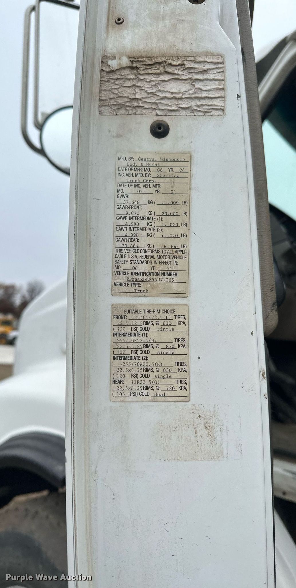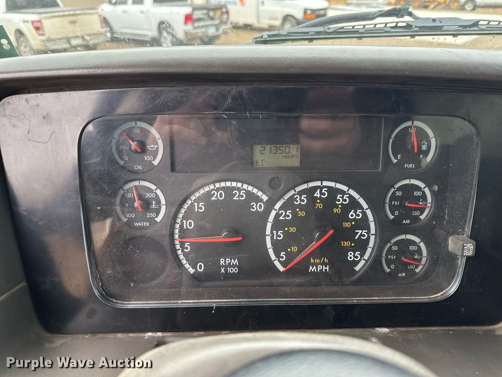 2005 Sterling L9500 dump truck. Miles: 583,676 on odometer, Hours: 21,350 on meter, VIN: 2FZSAZDL25AN71065. Engine Caterpillar C11, Displacement: 11.1L, Cylinders: 6, Fuel type: Diesel, Engine brake. Transmission Eaton Fuller RoadRanger RT/RTO 8LL, Manual, Speed: 10. Chassis Axles: 4, Pusher axle Steerable, Differential lock: Full, Suspension: Spring over walking beam, Brakes: Air, PTO, GVWR: 83,000 lbs FAWR: 20,000 lbs. Interior AC, Heat, Heated mirrors, Cruise control. Features Dump bed 18' 6" L x 8' 3" W, Side height: 48", Side board height: 10", Bed type: Steel, Bed vibrator, Ram: Single , End gate: Air operated. Tires Front: 425/65-R22.5, Rear: 11R22.5, Lift axle: 255/70R22.5. Minnesota title. Title distribution may be delayed up to 30 days from verification of funds. 12417 U. S. Highway 71. Menahga, MN 56464