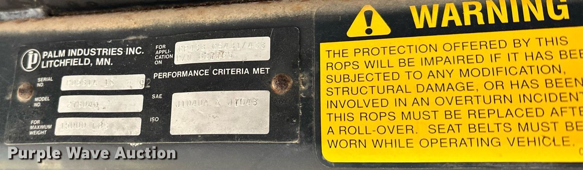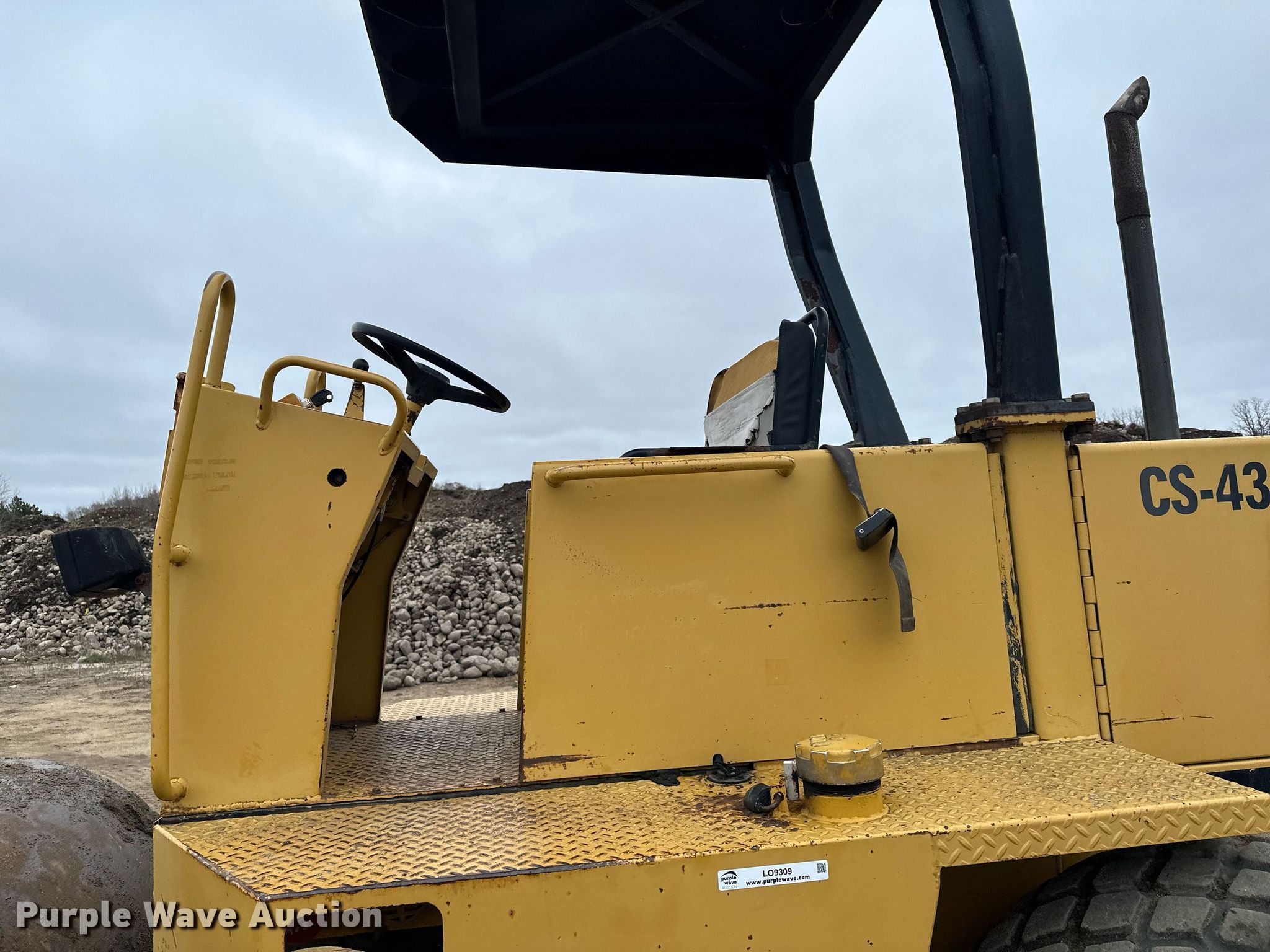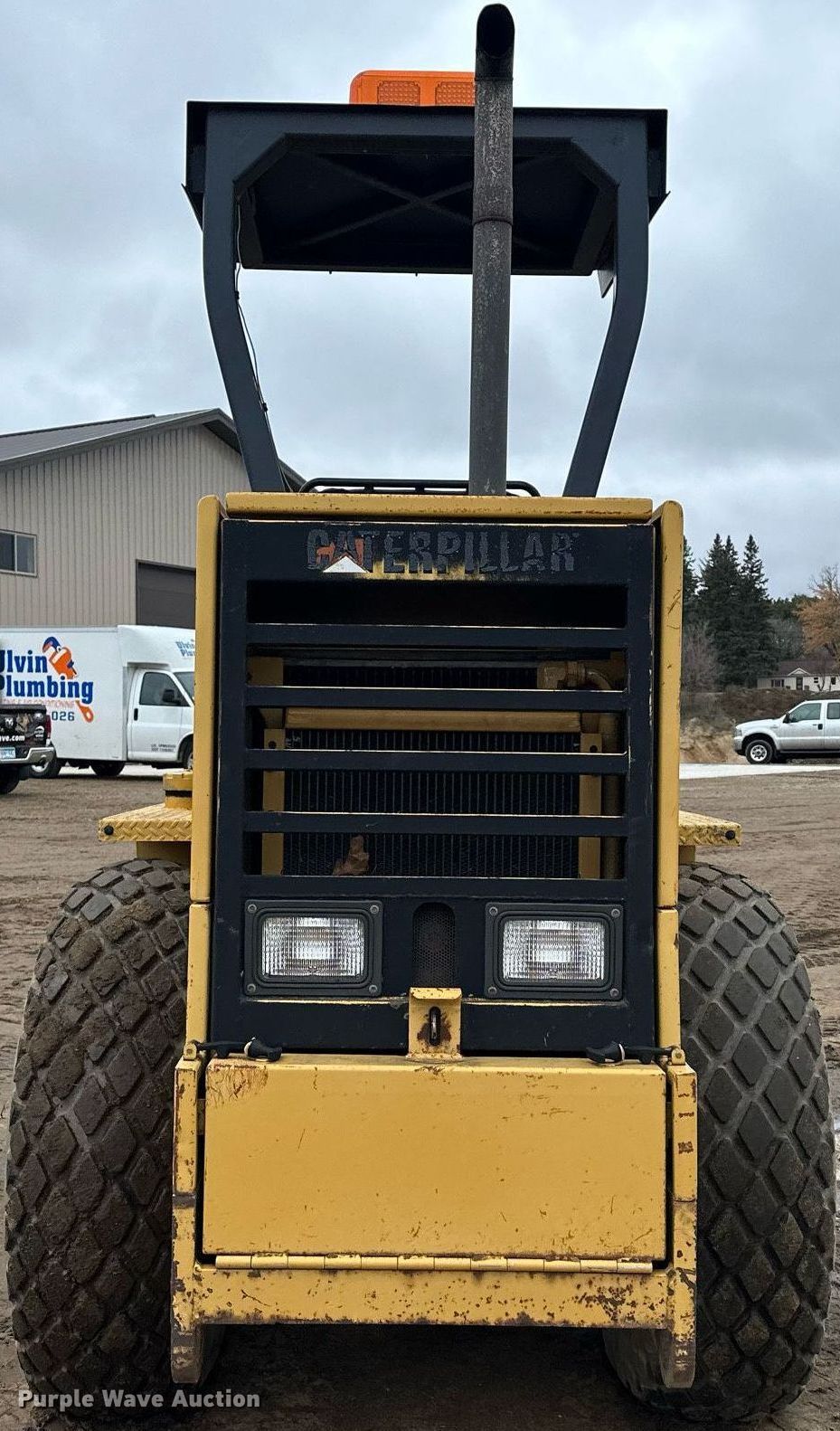 1993 Caterpillar CS433B single drum vibratory roller. Hours: 2,145 on meter, Serial: 4FK00126. Engine Perkins, Cylinders: 4, Fuel type: Diesel. Transmission Hydrostatic, Two speed travel. Operators station OROPS, Vandal cover. Features Drum: Smooth, Front drum Width: 66", Diameter: 48", Drum scrapers: Front. Tires Size: 14.9-24. 12417 U. S. Highway 71. Menahga, MN 56464