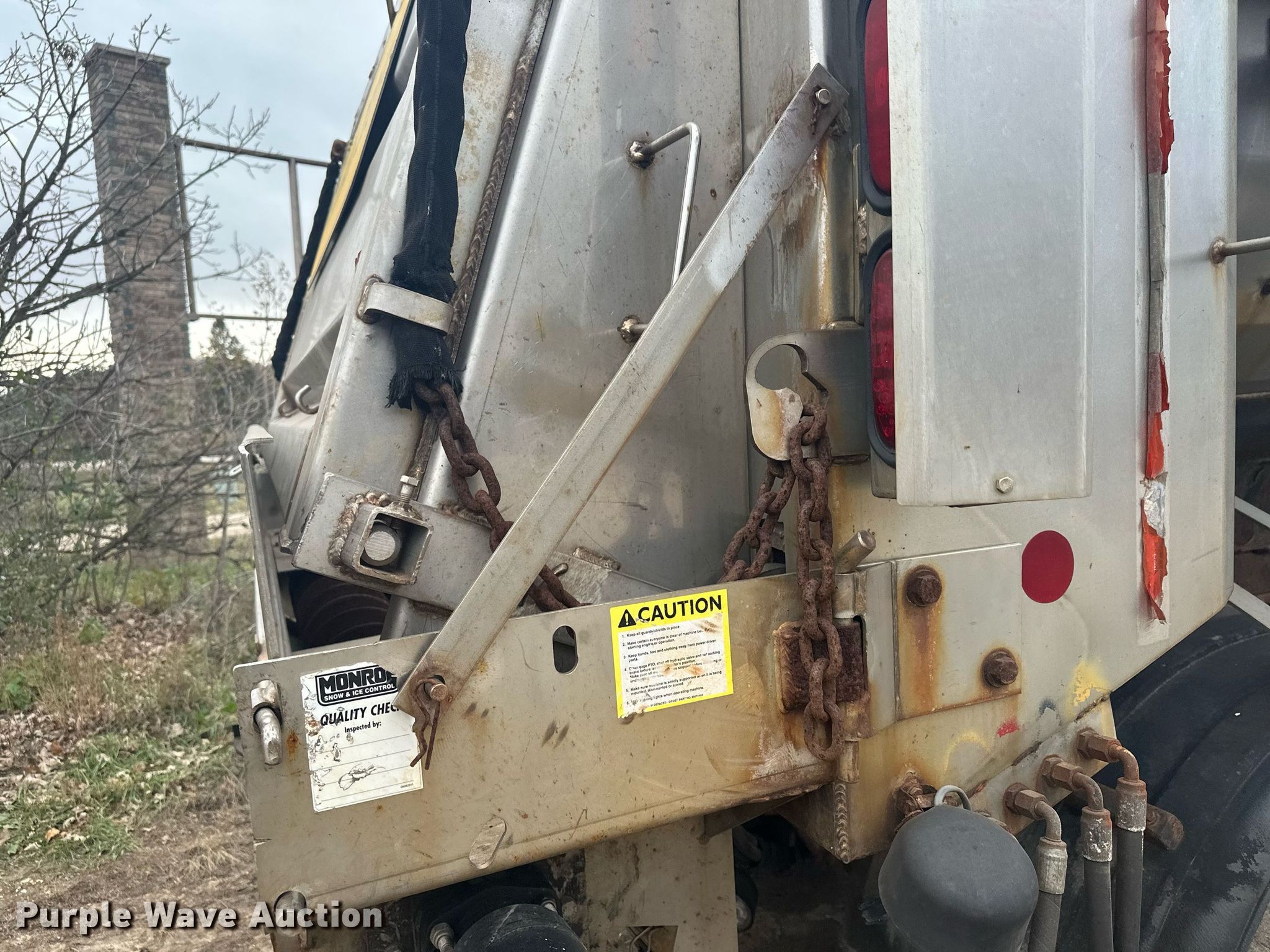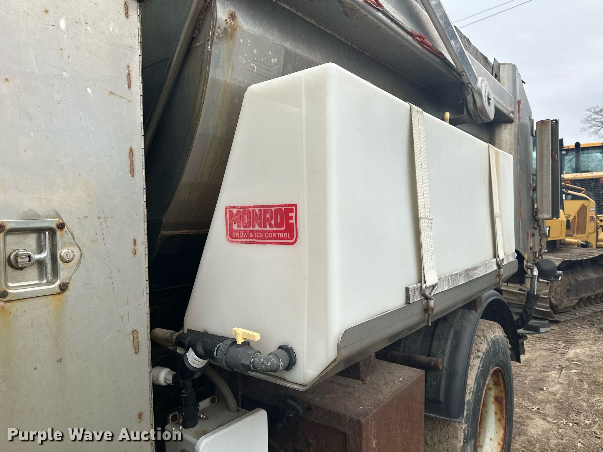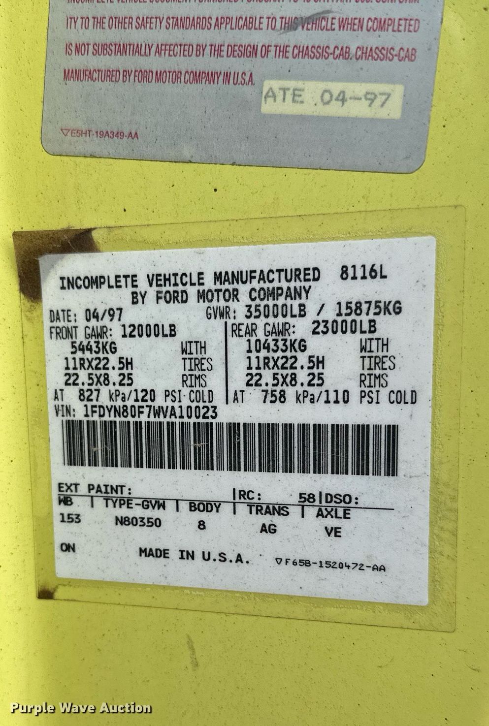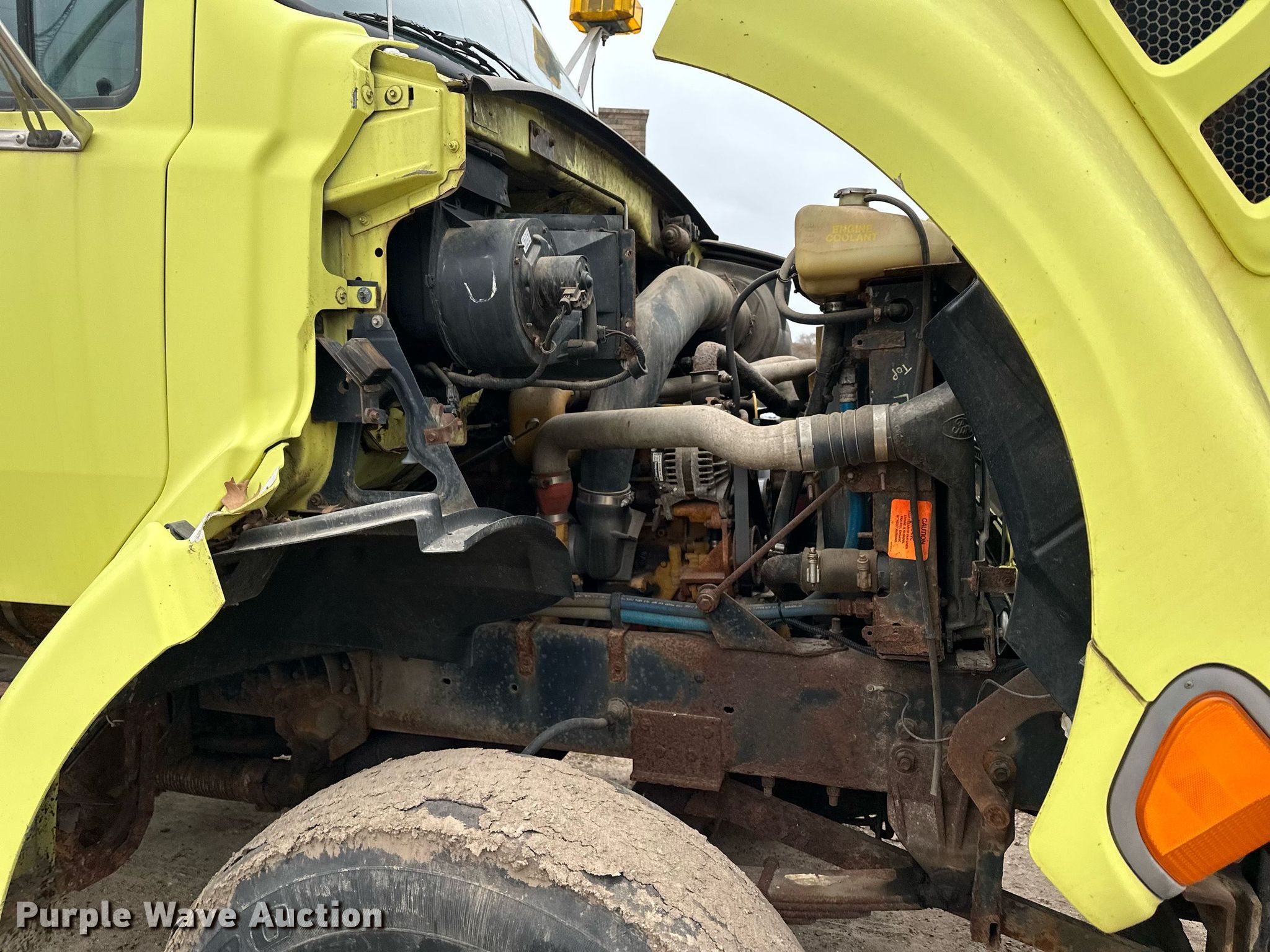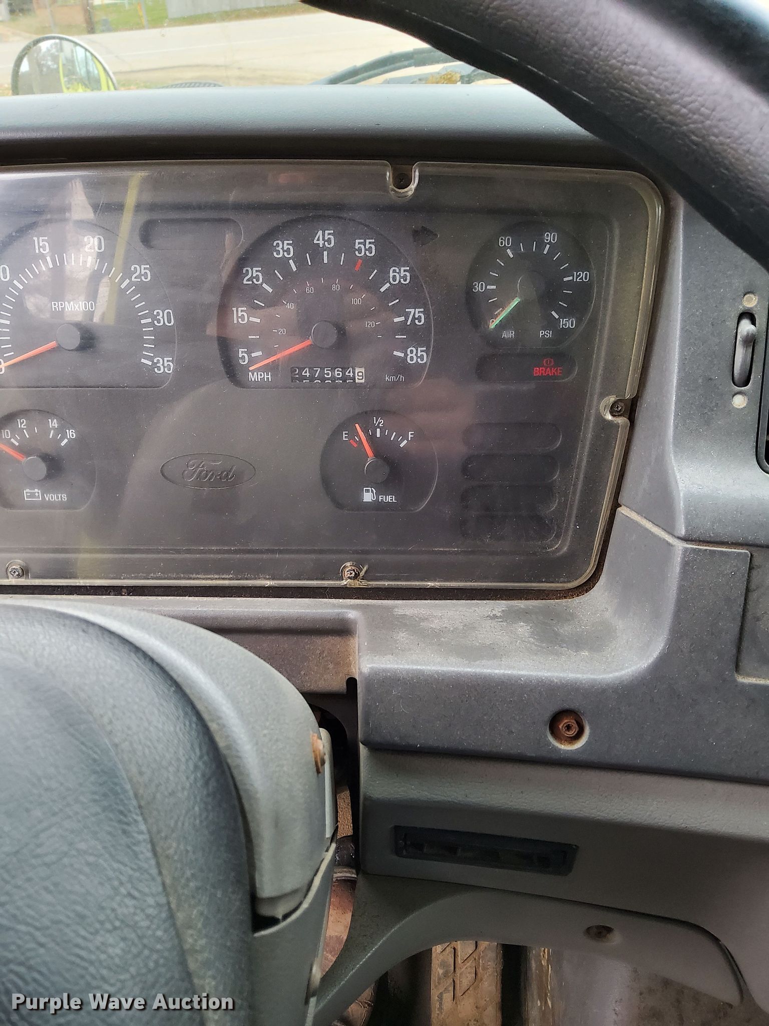 1998 Ford L8000 dump truck. Miles: 247,565 on odometer, Hours: 462 on meter, VIN: 1FDYN80F7WVA10023. Engine Caterpillar 3126, Displacement: 7.2L, Cylinders: 6, Fuel type: Diesel, HP: 230. Transmission Automatic. Chassis Axles: Single, Differential lock: Inter-axle, Suspension: Spring, Brakes: Air, PTO, Front mount PTO, GVWR: 35,000 lbs FAWR: 12,000 lbs, RAWR: 23,000 lbs, Wheelbase: 153". Interior AC, Heat, Heated mirrors, Power windows, Cruise control. Features Dump bed Monroe, 9' L x 96" W, Side height: 40", Side board height: 4.5", Bed type: Steel, Roll tarp, Ram: Single , End gate: Air operated, Spreader Monroe, Plow Width: 144". Tires Size: 11R-22.5. Notes Dead battery. Minnesota title. Title distribution may be delayed up to 30 days from verification of funds. Alcon. 2258 Marion Road Southeast. Rochester, MN 55904