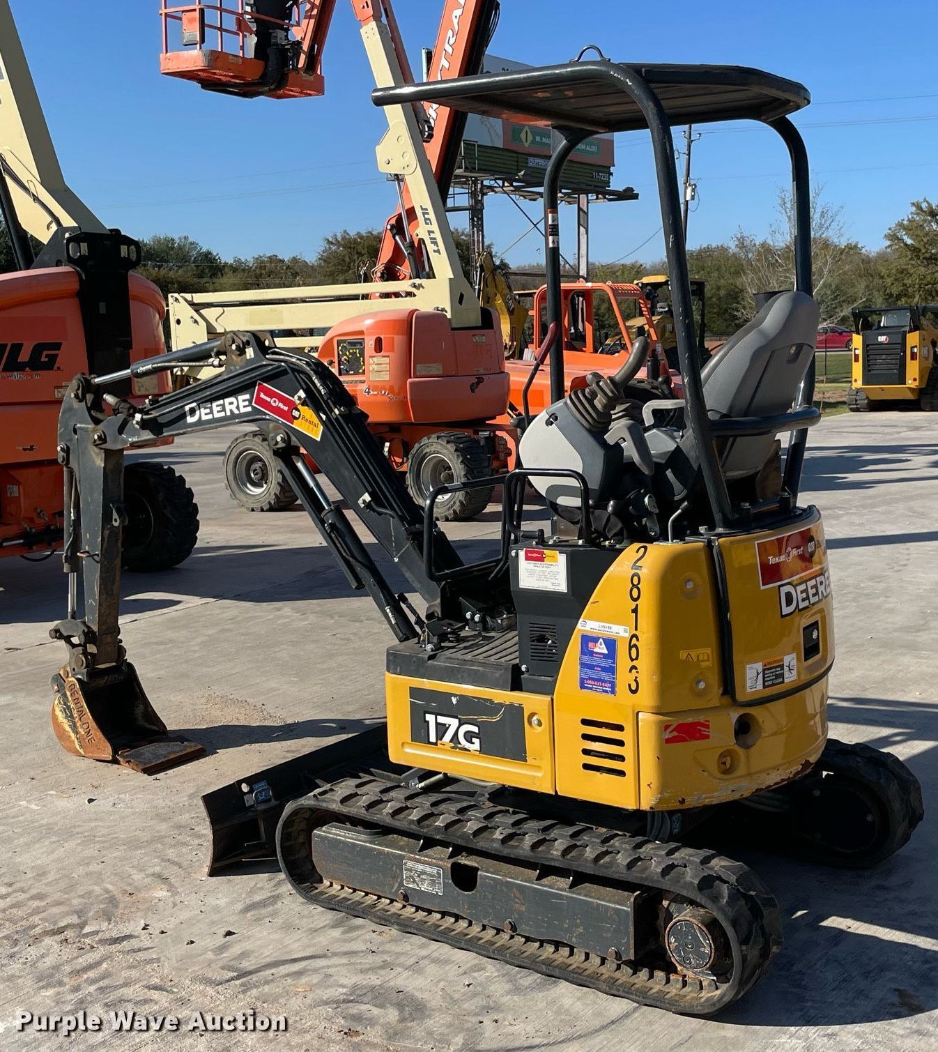 Purple Wave is selling a used Mini Excavator in Texas. This item is a 2019 John Deere 17G mini excavator with the following: Hours: 640 on meter, Serial: 1EF017GXLKK229829