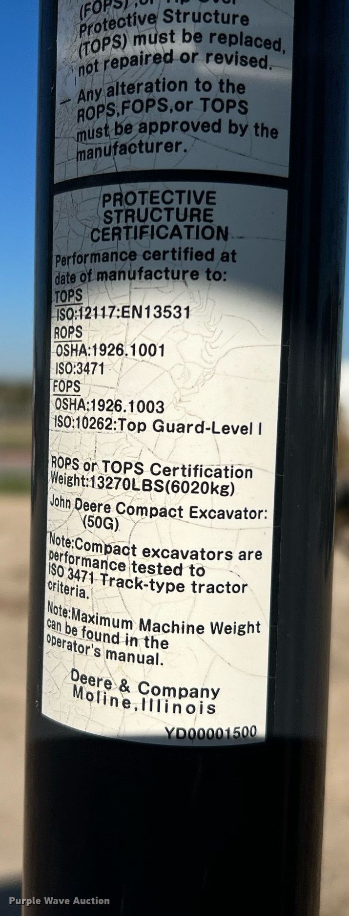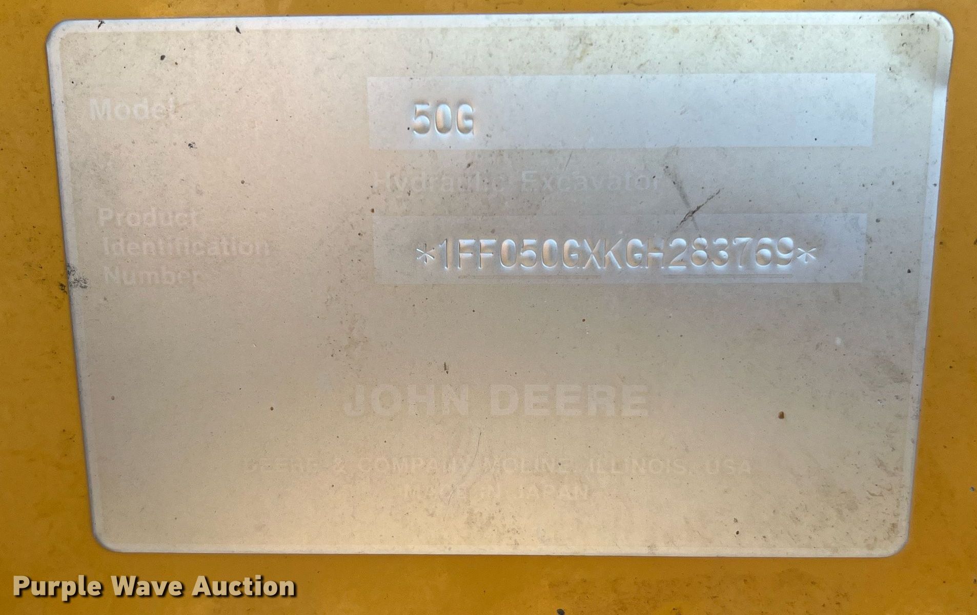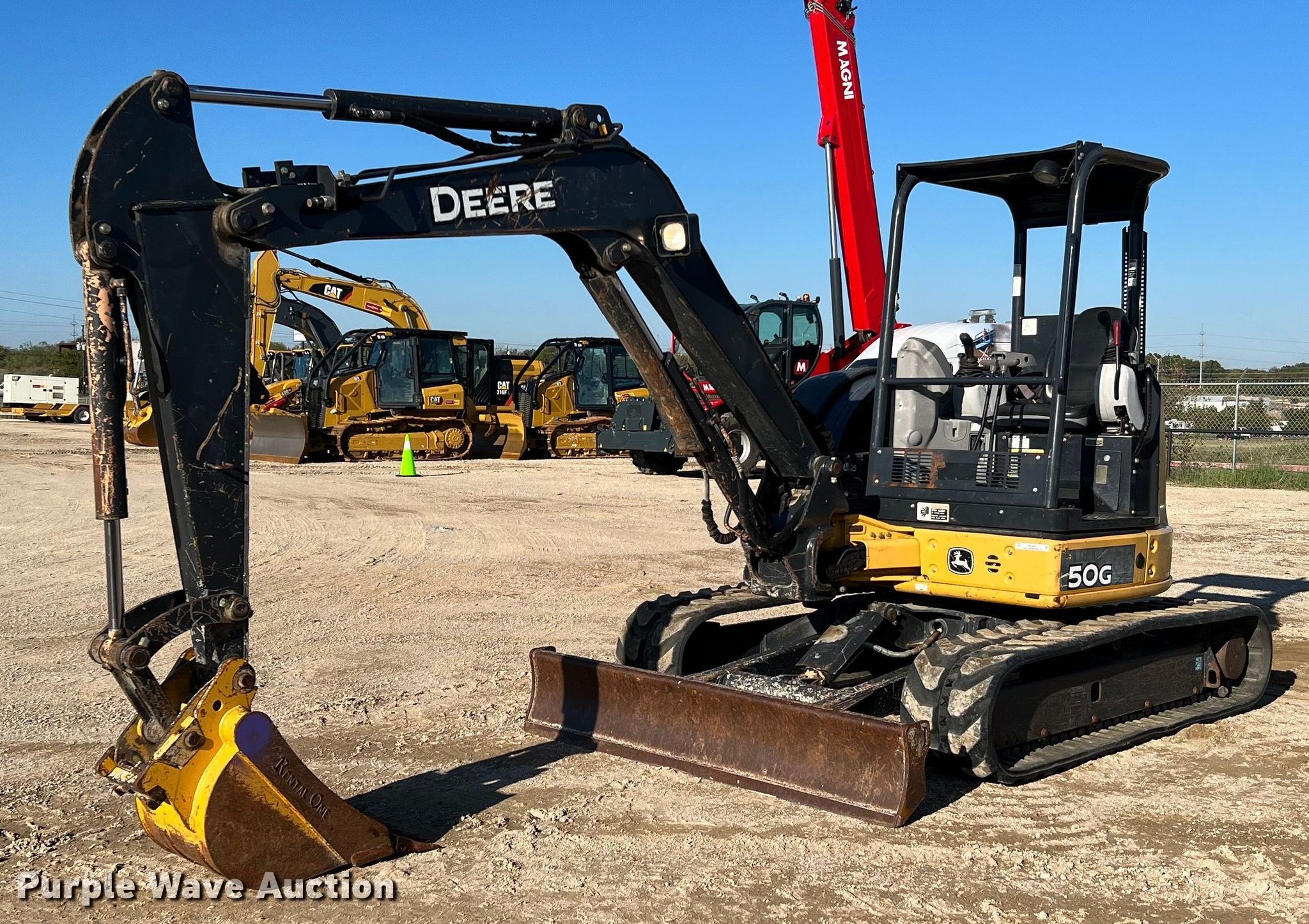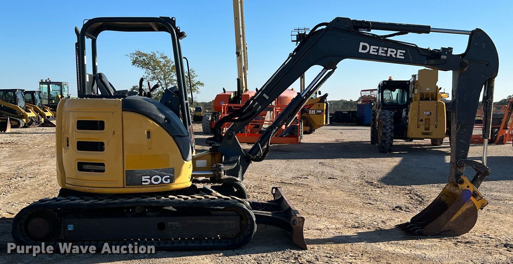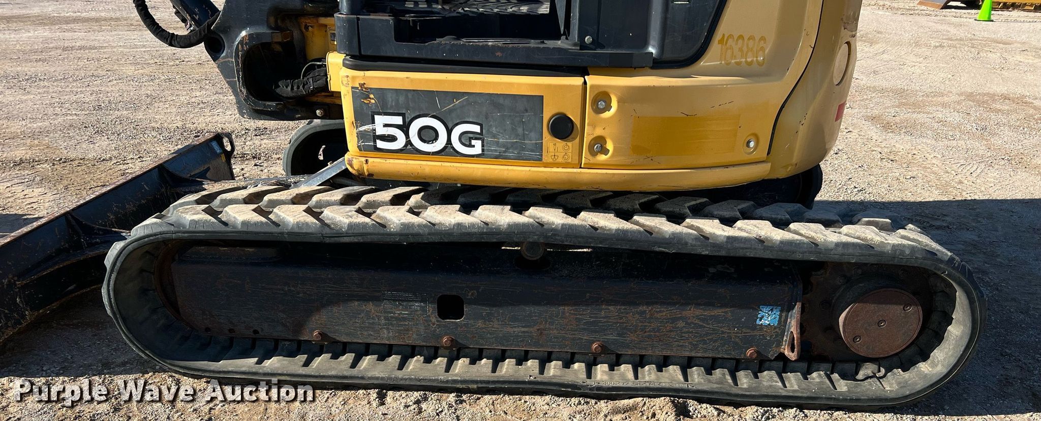 Purple Wave is selling a used Mini Excavator in Texas. This item is a 2016 John Deere 50G mini excavator with the following: Hours: Unknown, Serial: 1FF050GXKGH283769, Unit #: 16386