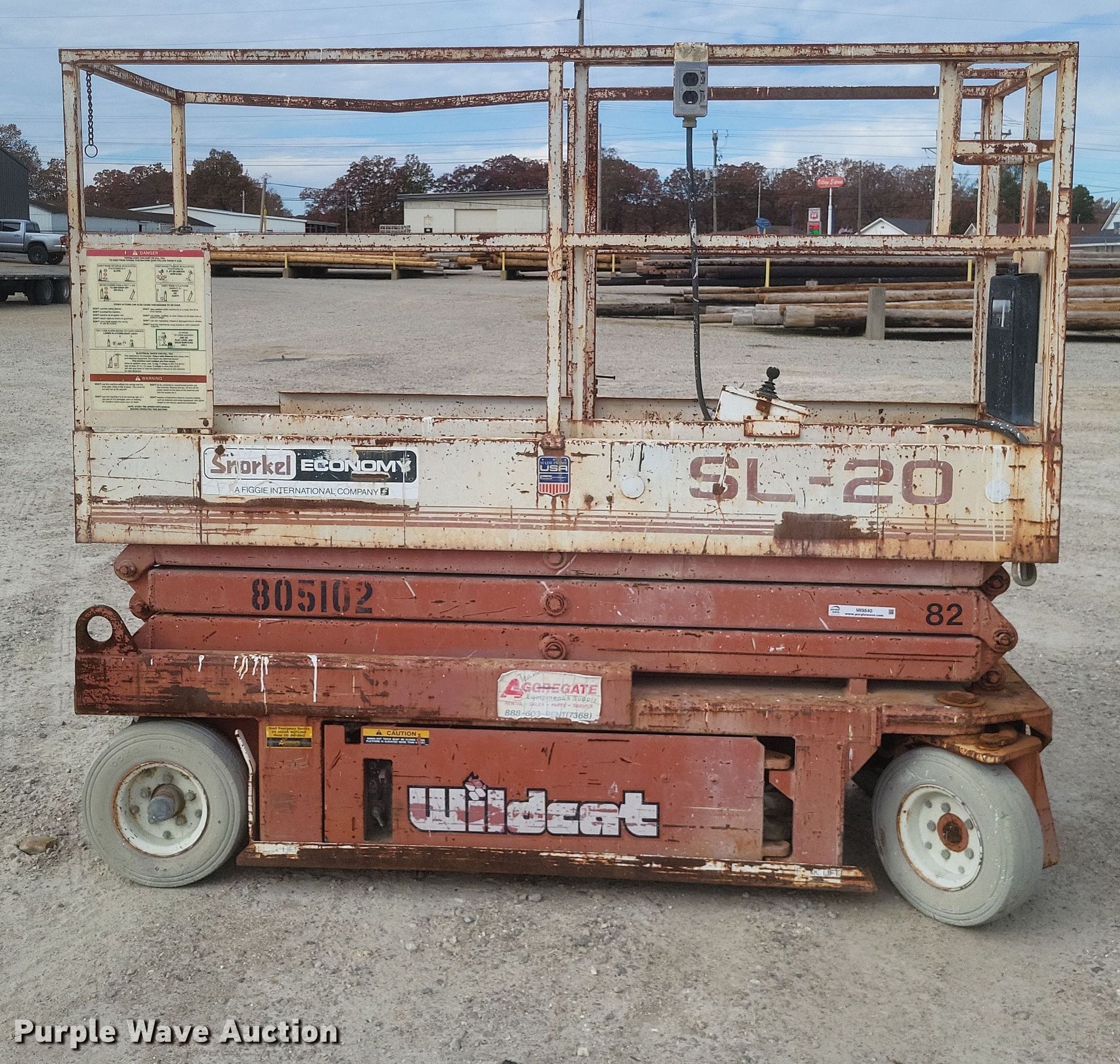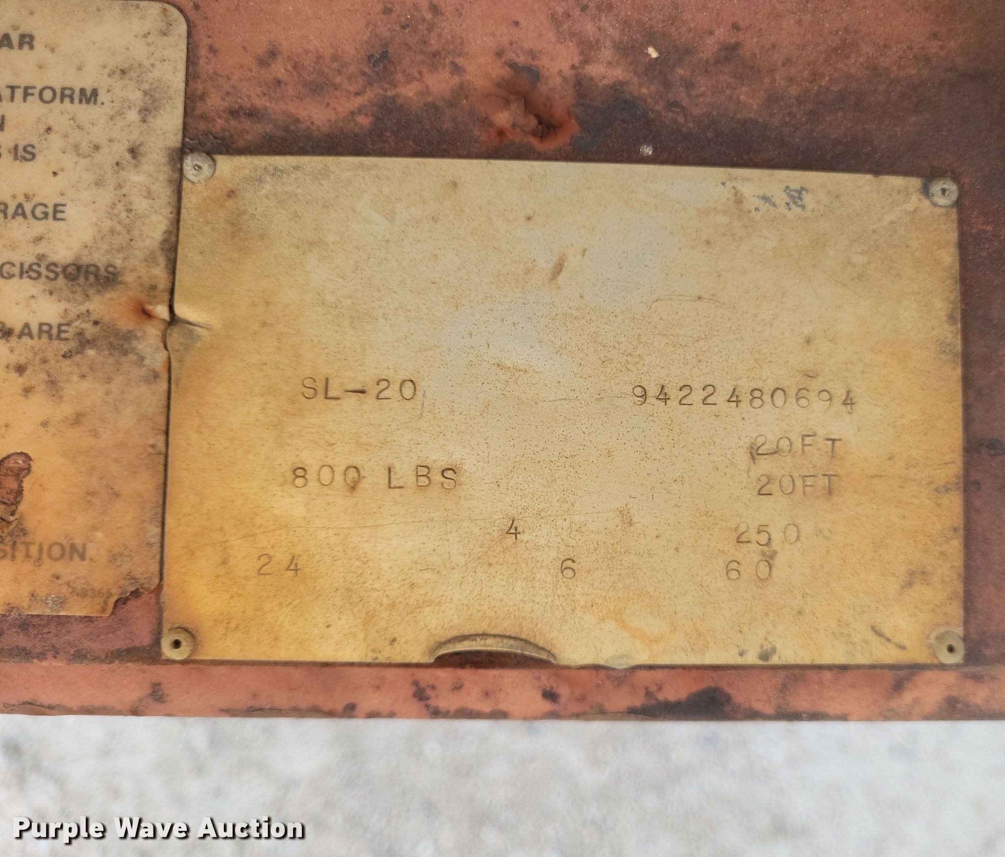 Purple Wave is selling a used Scissor or Vertical Lift in Missouri. This item is a Snorkel SL-20 scissor lift with the following: Hours: 272 on meter, Serial: 9422480694, Unit #: 82