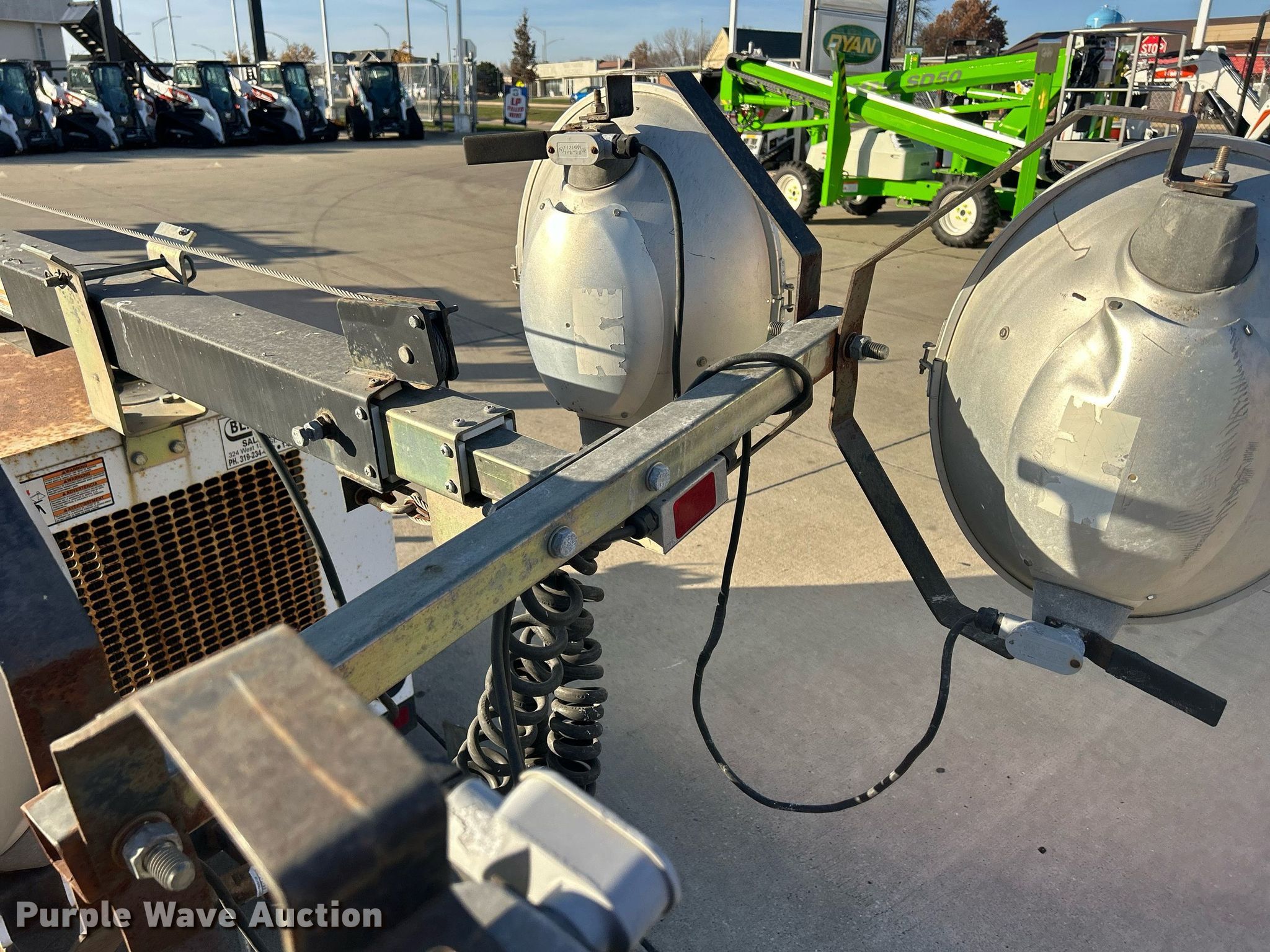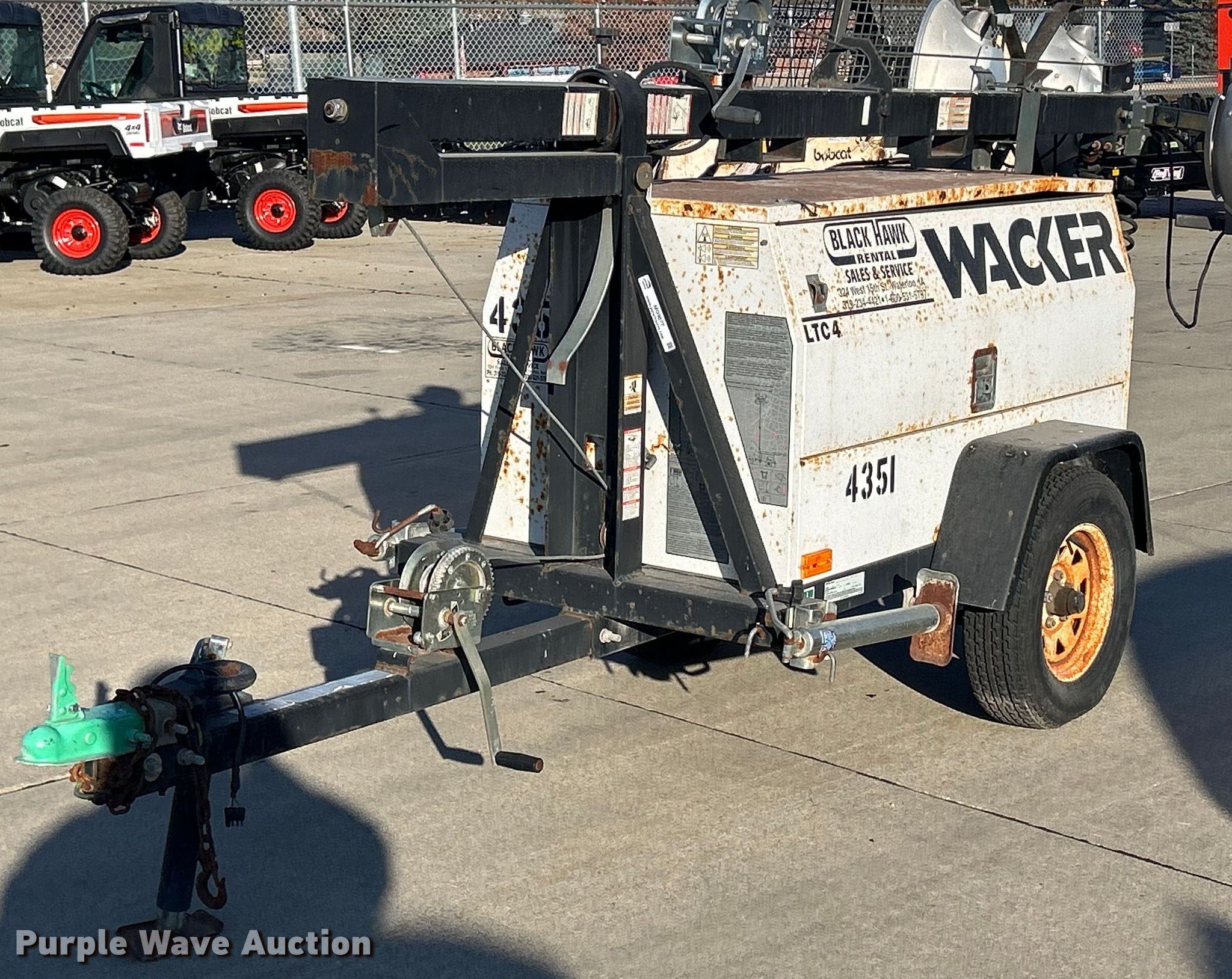 2007 Wacker LTC4 light plant. Hours: 1,996 on meter, VIN: 5F13D141471000192. Engine Lombardini, Cylinders: 3, Fuel type: Diesel. Features Light plant Bulbs: 4, Watts: 1,000, Tower height: 30', Hoist: Manual, Stabilizers. Trailer 10' L x 48" W, Ball hitch size: 2", Suspension: Spring, Axles: Single, Tire size: 175/80R13, GVWR: 2,100 lbs. Transfer of ownership documentation will be a bill of sale. Bobcat of Waterloo - Cedar Falls. 4325 University Avenue. Cedar Falls, IA 50613
