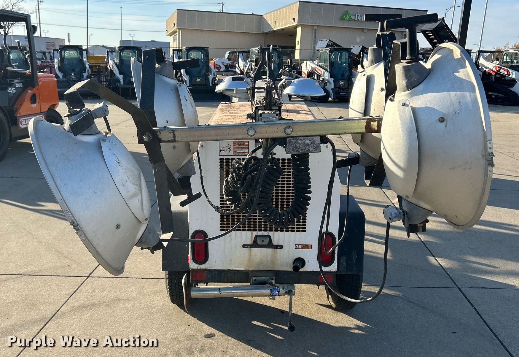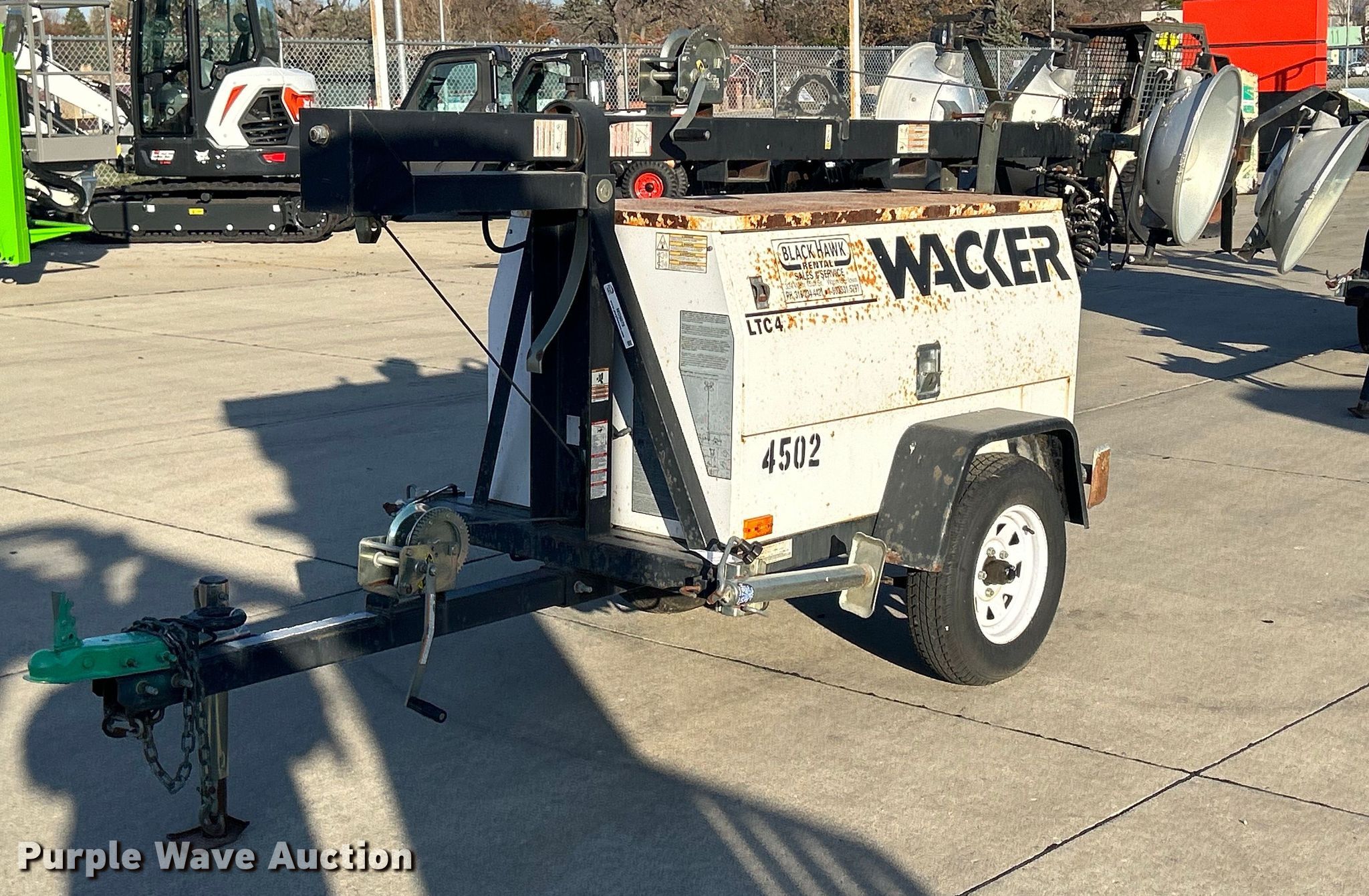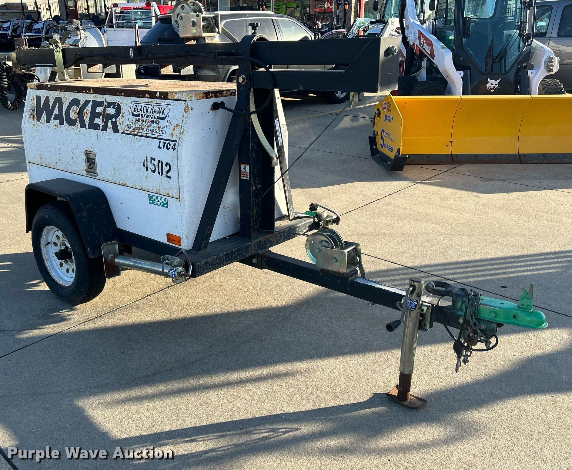 Wacker LTC4 light plant. Hours: 1,173 on meter, VIN: 5F13D141871003161. Engine Lombardini, Cylinders: 3, Fuel type: Diesel. Features Light plant Bulbs: 4, Watts: 1,000, Tower height: 30', Hoist: Manual, Stabilizers. Trailer 10' L x 48" W, Ball hitch size: 2", Suspension: Spring, Axles: Single, Tire size: 175/80R13, GVWR: 2,100 lbs. Transfer of ownership documentation will be a bill of sale. Bobcat of Waterloo - Cedar Falls. 4325 University Avenue. Cedar Falls, IA 50613