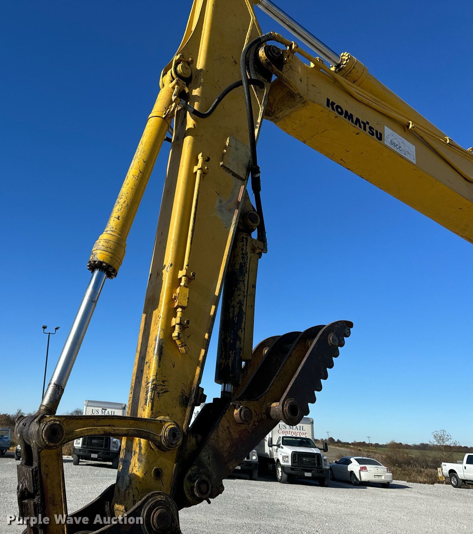 2004 Komatsu PC120-6E0 excavator. Hours: 7,418 on meter, Serial: 70082. Engine Komatsu, Cylinders: 4, Fuel type: Diesel. Transmission Hydrostatic, Three speed travel. Operators station Enclosed cab, AC, heat. Features Auxiliary hydraulics, Boom Standard, Stick Stick length: 98", Thumb: Hydraulic Fleco, Bucket Width: 32", Teeth: 4, Additional bucket Width: 24, Teeth: 4. Tracks Width: 19.75", Steel, Grouser pads: Triple. Notes Bucket pins loose. SSCC Inc.. 7380 East Angel Lane. Ashland, MO 65010