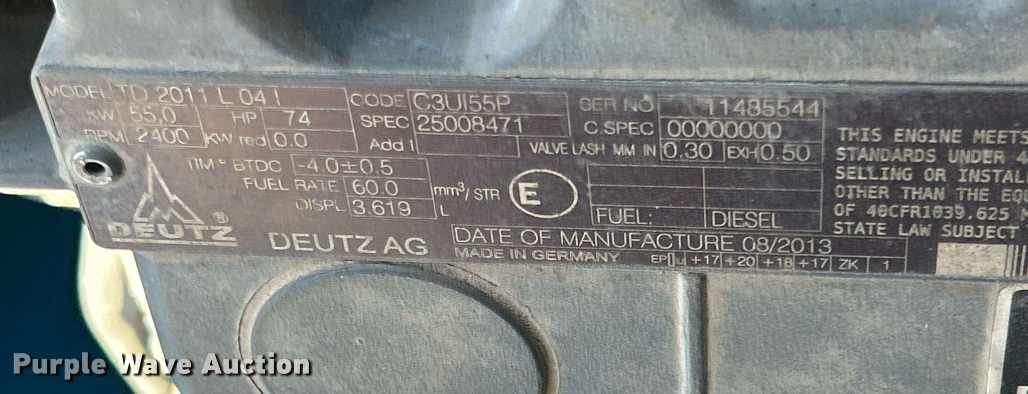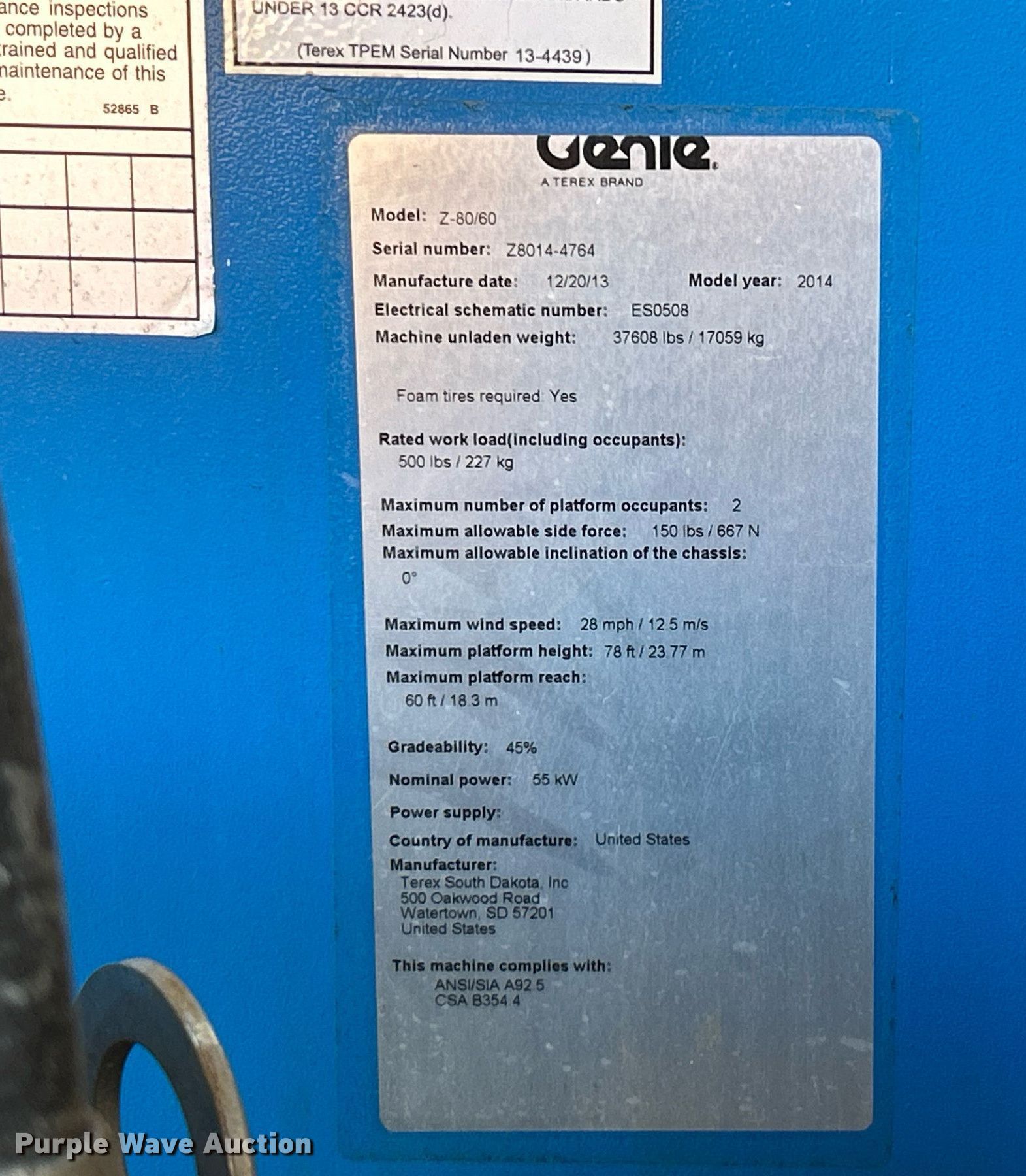 2014 Genie Z-80/60 boom lift. Hours: 2,319 on meter, Serial: Z8014-4764. Engine Deutz TD2011L041, Displacement: 3.619L, Cylinders: 4, Fuel type: Diesel. Features Articulating boom, Maximum lift capacity: 500 lbs, Maximum reach length: 60', Maximum lift height: 78', Hydraulic extendable jib, Hydraulic leveling, Platform: 94" L x 34" W, AC power outlet, Controls: Platform, Ground, Platform rotation: Hydraulic. Tires Tire size: 18-625NHS, Foam filled. JL Contracting. Kirkwood, MO 63122