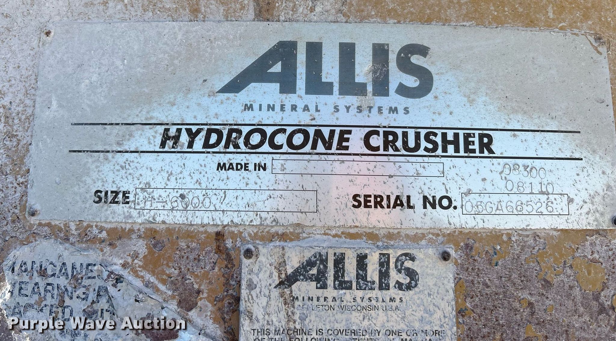 Allis Chalmers H-6000 hydrocone crusher. Serial: 05GA66526. Features Cone Diameter: 60", Lube pump, Oil cooler. Notes Cracked shaft, Bushings need replaced, Parts replaced in July 2017. View repairs. Bedrock Quarry LLC. Troy, MO 63379