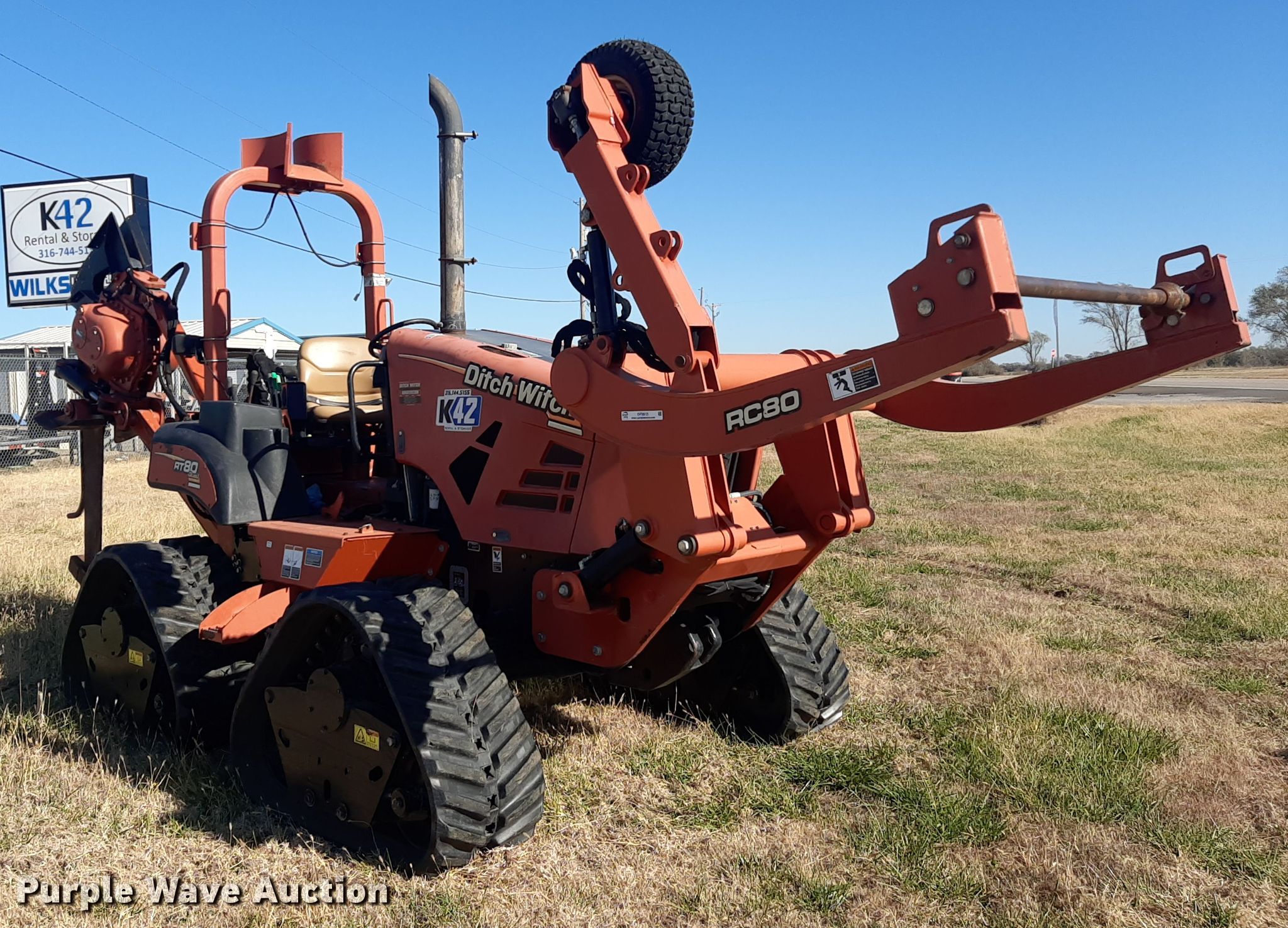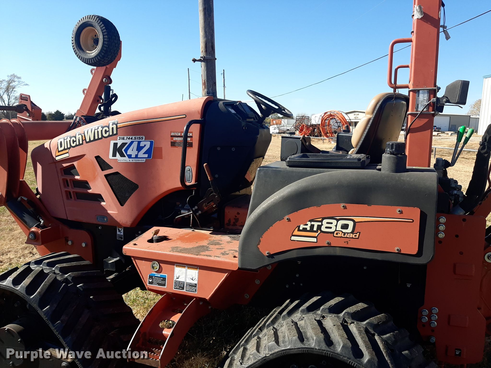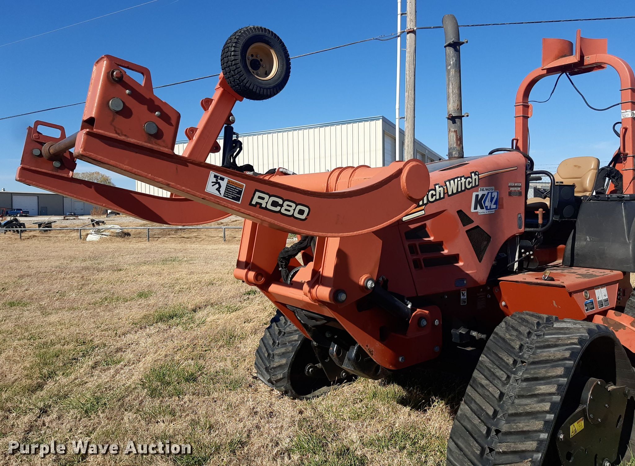 2013 Ditch Witch RT80 Quad vibratory cable plow. Hours: 437 on meter, Serial: CMWH832XPD0000037. Engine Cylinders: 4, Fuel type: Diesel. Transmission Hydrostatic, Four wheel drive, Differential lock, Four wheel steer. Features Vibratory plow Depth: 44", Reel carrier Model: Ditch Witch RC80, Maximum reel width: 55", Maximum reel diameter: 84". Tracks Width: 18", Rubber. K42 Equipment & Sales. 12000 West K42 Drive. Wichita, KS 67215