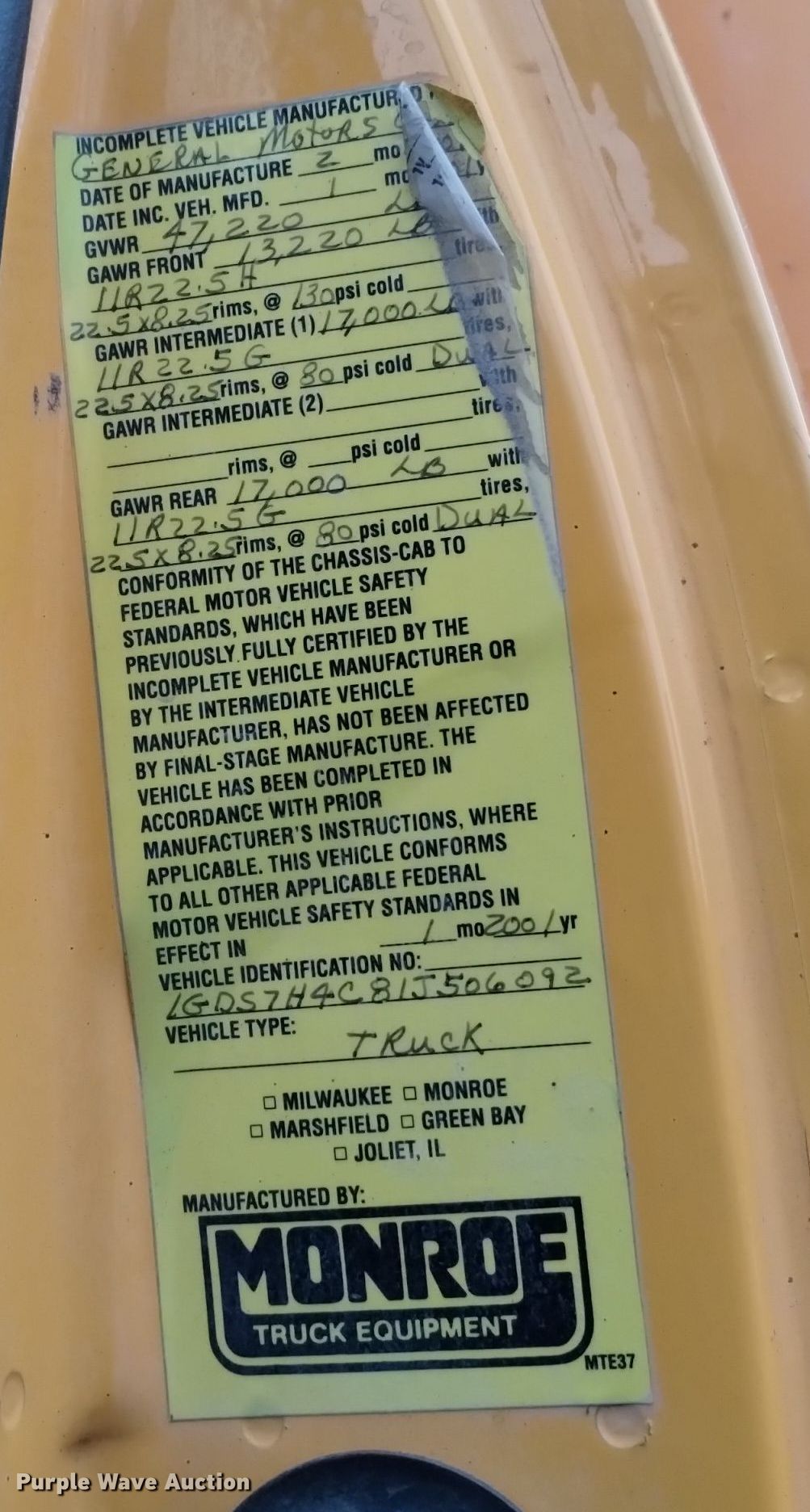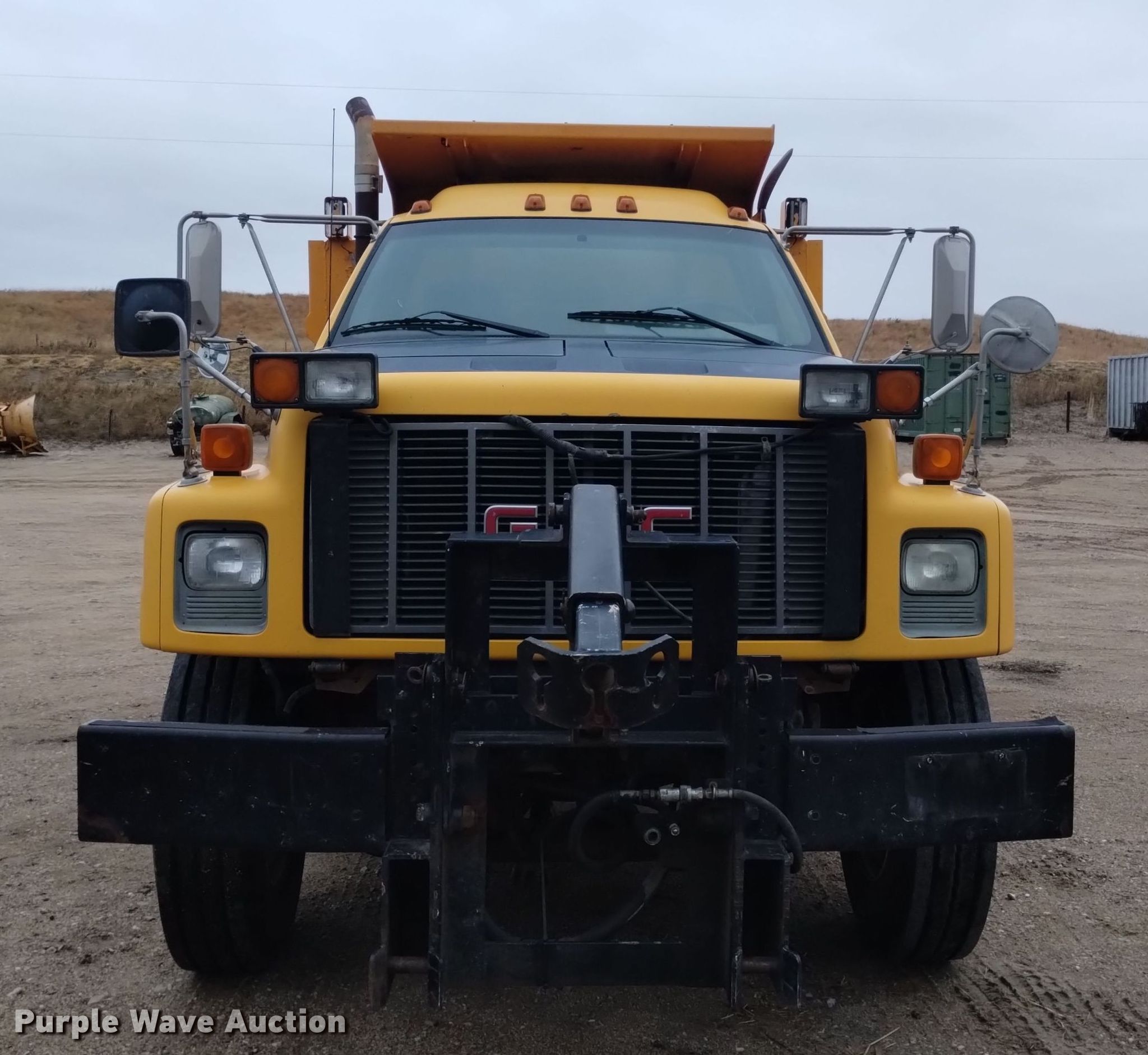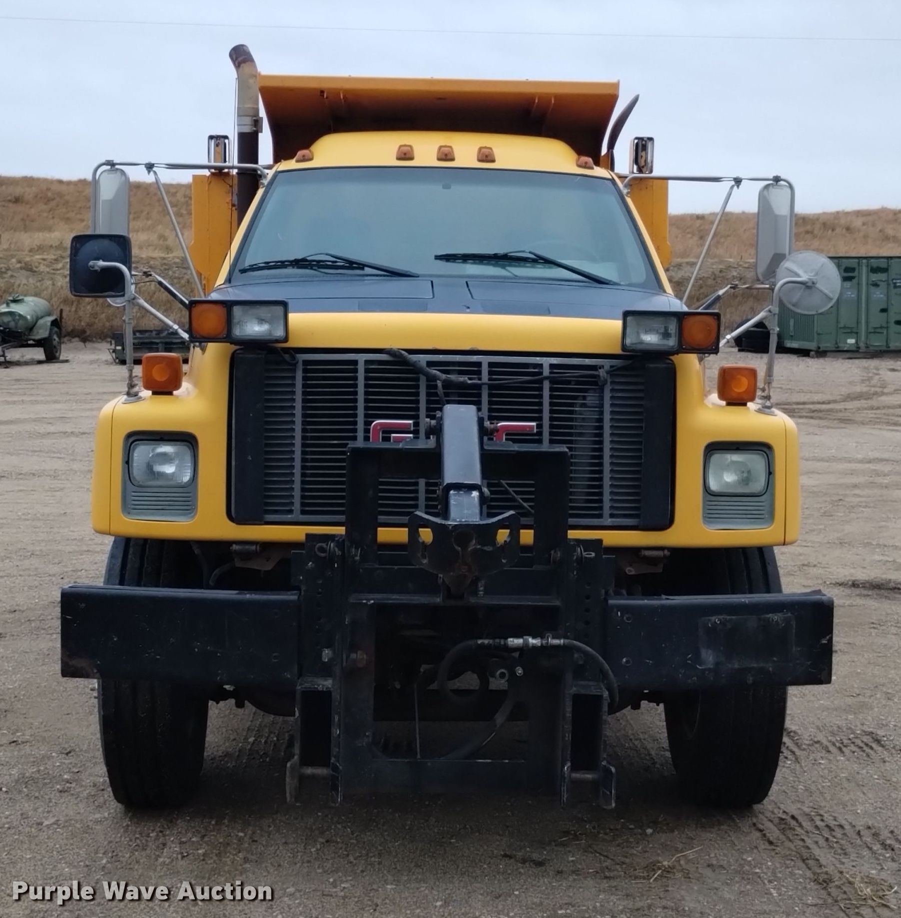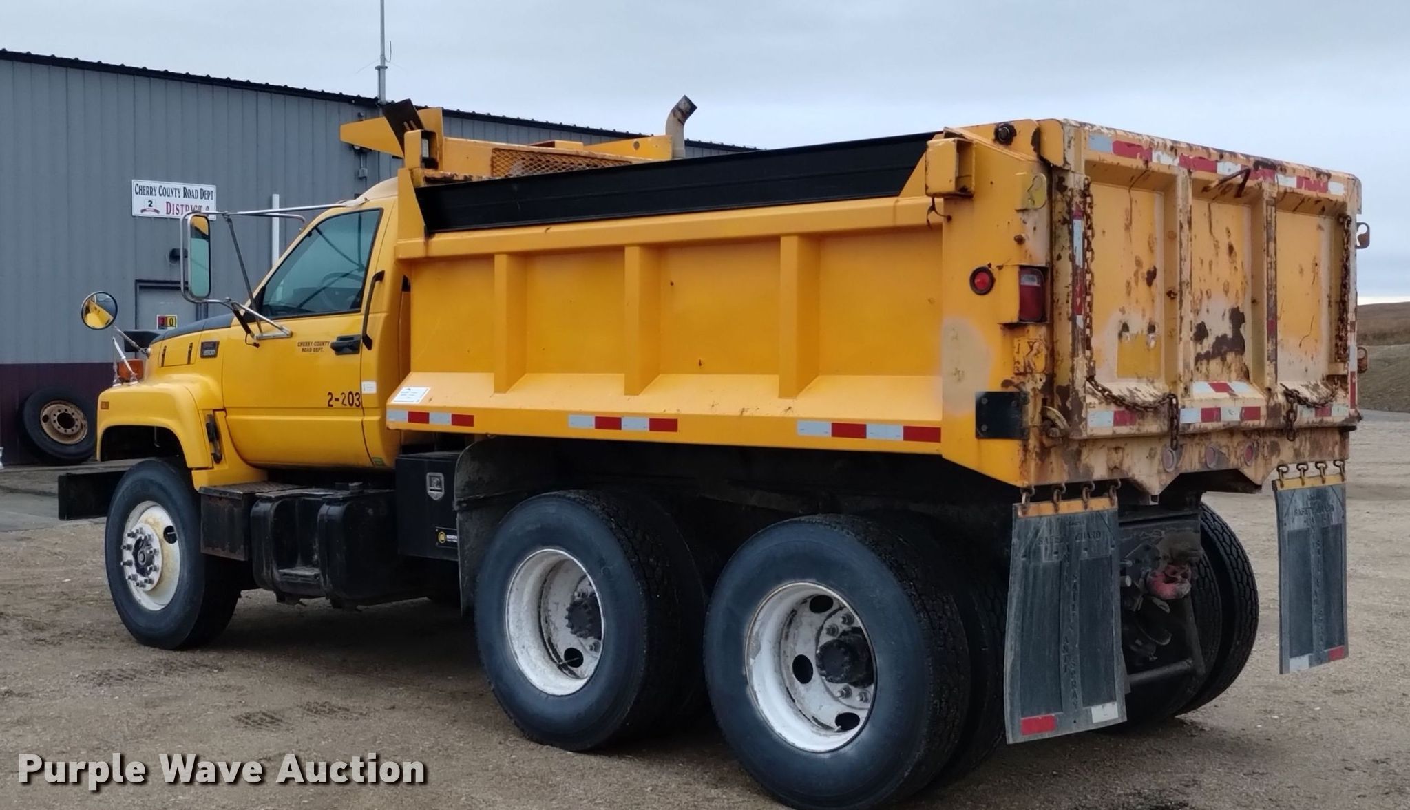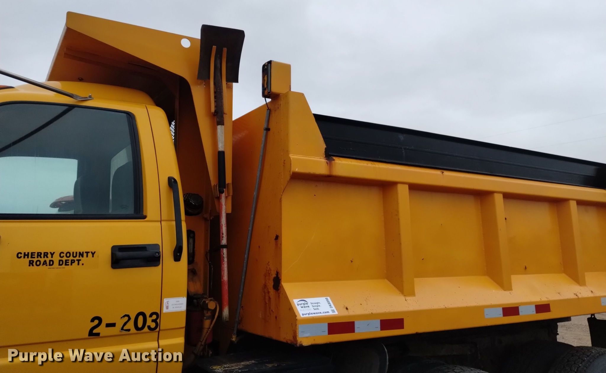 2001 GMC C7500 dump truck. Miles: 95,494 on odometer, Hours: 4,617 on meter, VIN: 1GDS7H4C81J506092, Unit #: 2-203. Engine Caterpillar 3126, Displacement: 7.2L, Cylinders: 6, Fuel type: Diesel. Transmission Eaton Fuller, Manual, Speed: 10. Chassis Axles: Tandem, Suspension: Spring over walking beam, Brakes: Air, PTO, Front mount PTO, GVWR: 47,220 lbs FAWR: 13,220 lbs, IAWR: 17,000 lbs, RAWR: 17,000 lbs. Interior AC, Heat. Features Dump bed 11' L x 8' W, Side height: 33", Side board height: 9", Bed type: Steel, Ram: Single , End gate: Air operated. Tires Size: 11R22.5. Notes Additional parts, Windshield chipped or cracked. Nebraska title. Title distribution may be delayed up to 14 days from verification of funds. Cherry County. Mullen, NE 69152