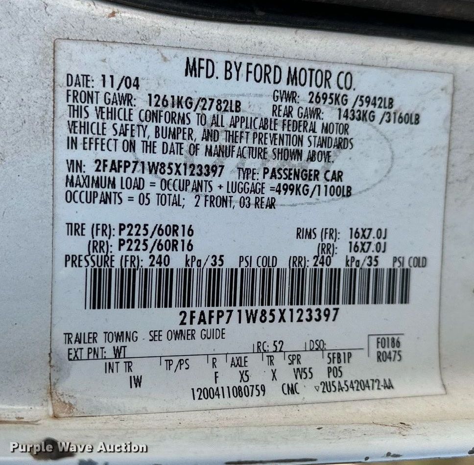 2005 Ford Crown Victoria Police Interceptor. Miles: Unknown, VIN: 2FAFP71W85X123397. Engine Displacement: 4.6L V8 SOHC, Cylinders: 8, Fuel type: Gas. Transmission Automatic. Interior AC, Heat, Seat: Power driver, Heated mirrors, Power windows, Power locks, Cruise control. Tires Front: 225/60R16, 235/55R17, Rear: 235/55R17. Notes Keys missing, Non-operational emergency lights, Non-operational unit. Oklahoma title. Mileage has not been verified. Odometer discrepancy will be marked on the title. Title distribution may be delayed up to 14 days from verification of funds. 1550 North Midwest Boulevard. Guthrie, OK 73044