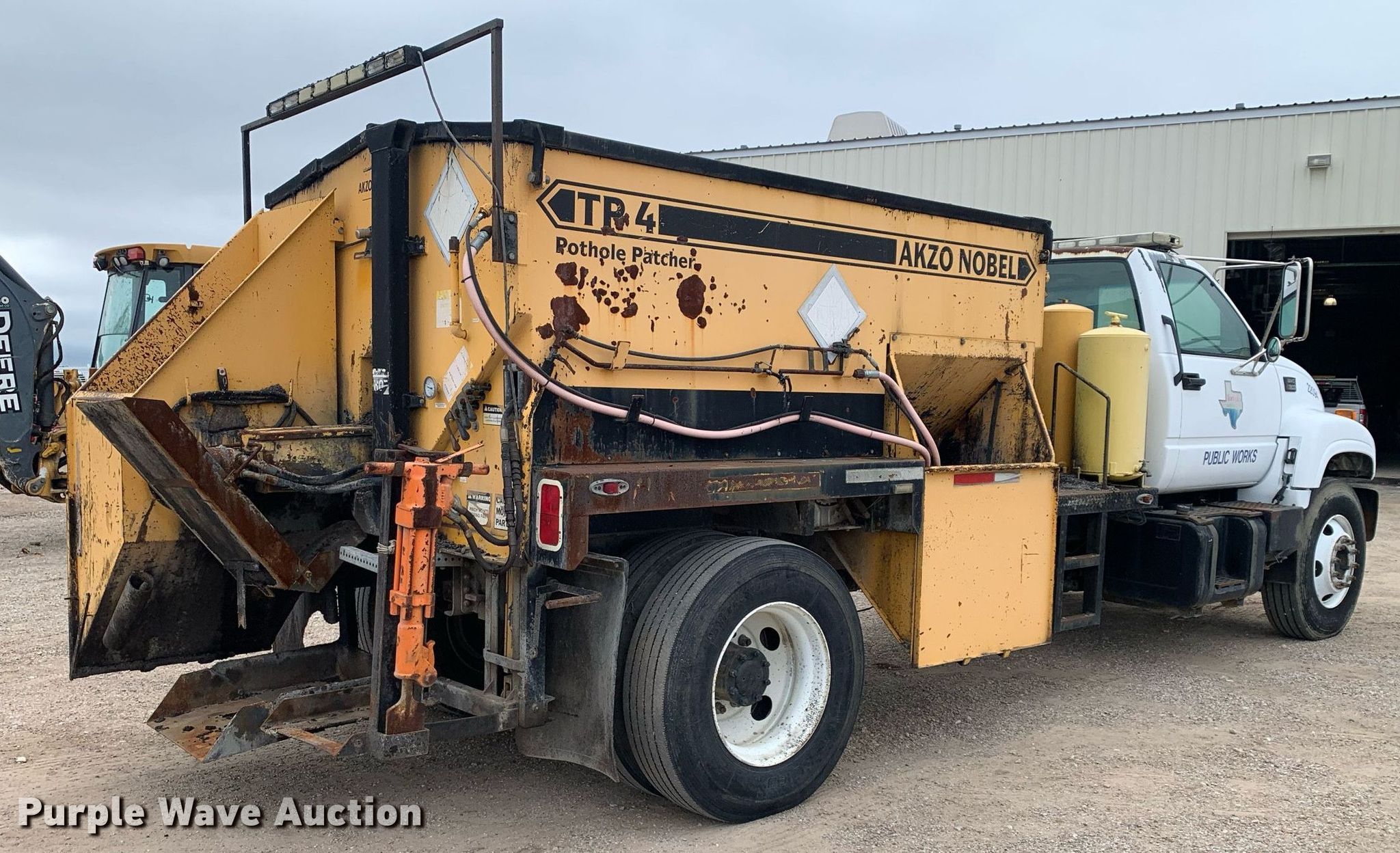2002 GMC C7500 pothole patcher truck. Miles: 69,942 on odometer, VIN: 1GDM7H1C22J510346, Unit #: 22094. Engine Caterpillar3126, Serial: CKM44494, Displacement: 7.2L, Cylinders: 6, Fuel type: Diesel. Transmission Automatic. Chassis Suspension: Spring, Brakes: Air. Features Bed 13' L x 8' W, Akzo Nobel TP 4 pothole patcher, Burner: LPG Burner Tank included, 220 VAC electric heater Phase: Single, Jack Hammer. Tires Size: 11R22.5. Notes Contents not included, Unknown operating condition of jack hammer. Texas title. Seller is a government entity who will be assigning and distributing the title. Please contact the seller for distribution questions. City Of Terrell. 400 Industrial Boulevard. Terrell, TX 75160