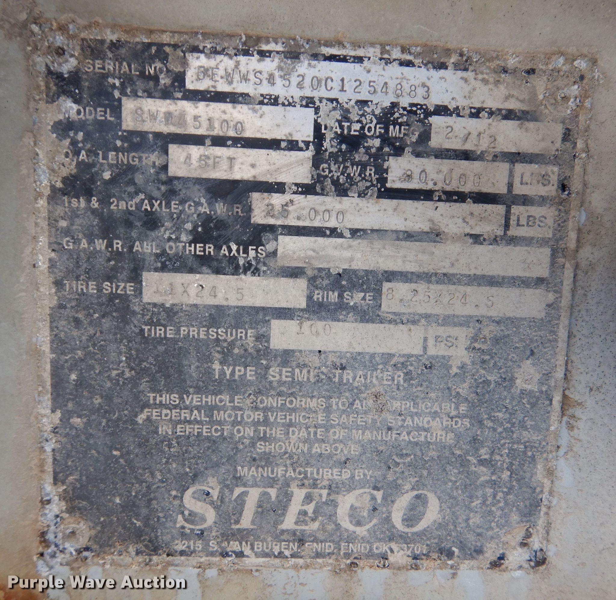 Purple Wave is selling a used Grain or Commodity Trailer in Kansas. This item is a 2012 Steco SW045100 walking floor trailer with the following: VIN: 5EWWS452OC1254883