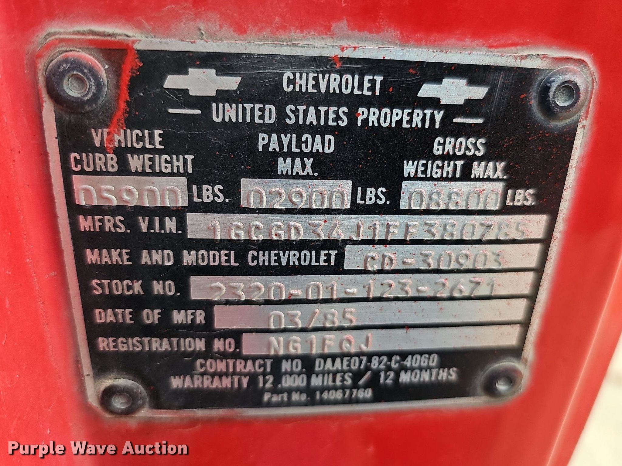 1985 Chevrolet D30 pickup truck. Miles: 9,369 on odometer Actual mileage unknown, VIN: 1GCGD34J1FF380785. Engine Displacement: 6.2L V8 OHV, Cylinders: 8, Fuel type: Diesel. Transmission Automatic. Chassis Four wheel drive, Axles: Single, Suspension: Spring, Brakes: Hydraulic, GVWR: 8,800 lbs. Interior Heat. Tires Size: 235/85R16, Brand: Thunder Trac Grip M/T. Notes Contents not included. Nebraska title. Mileage has not been verified. Exempt will be written in the odometer disclosure on the title. Seller is a government entity who will be assigning and distributing the title. Please contact the seller for distribution questions. NEB City Rural Fire Protection District. 1409 Central Avenue. Nebraska City, NE 68410