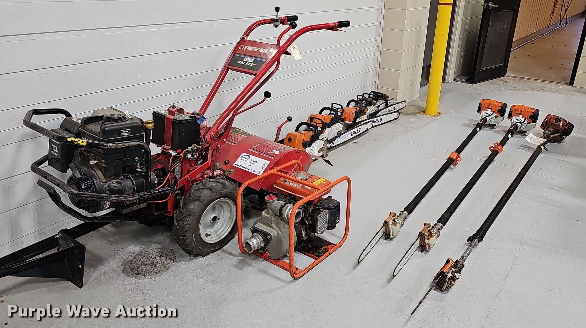 Lawn and garden equipment. Unit #: 96325. Troy-Bilt Big Red 21AE682L063 tiller Serial: 1E213G90018. Engine Troy-bilt Intek 305, Cylinders: 1, Fuel type: Gas, HP: 10. Transmission Hydrostatic. Features Width: 22, Tines: 4. Tires Front: 4.80/4.00-8. Notes Non-operational tire drive, Unknown operating condition. (5) Stihl chain saws (2) MS661, (2) MS2012C, MS362. (3) Stihl HT131 pole saws One unit non-operational. MultiQuip QP-204C trash pump Cylinders: 1, Fuel type: gas, Inlet/outlet: 2.5", Unknown operating condition. Lincoln Fleet Services. 901 West Bond Street. Lincoln, NE 68521