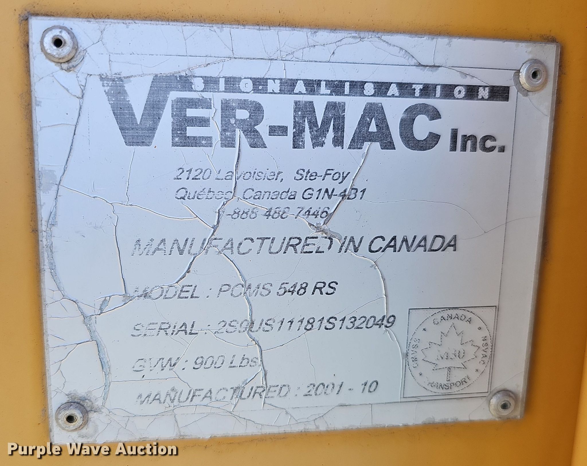 (3) arrow board trailers. Unit #: 92230. 2001 Ver-Mac PCMS 548 RS Serial: 2S9US11181S132049. Features Board: 72" W x 42" H, Suspension: Spring, Hitch: Pintle, Trailer:11.5' L x 66" W. Tires Size: ST205/75R15. Notes Unknown operating condition. 2002 Ver-Mac PCMS548 RS Serial: 2S9US111X1S132053, Unit #: 92234. Features Board: 72" W x 42" H, Suspension: Spring, Hitch: Pintle, Trailer: 11.5' L x 66" W. Tires Size: ST205/75R15. Notes Batteries missing, Unknown operating condition. 2011 Addco DH250-FM VIN: 4SEPA0916BM4SE023, Serial: 700302, Unit #: 92258. Features Board: 84" W x 44" H, Suspension: Spring, Hitch: Pintle, Trailer: 9.5' L x 66" W. Notes Board damaged, Batteries missing, Non-operational unit. Transfer of ownership documentation will be a bill of sale. Lincoln Fleet Services. 901 West Bond Street. Lincoln, NE 68521