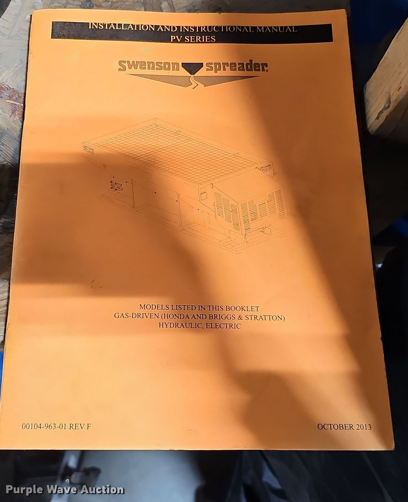 Swenson 2-533-00 spreader. Serial: 214-3674. Engine Power Built, Displacement: 344 cc, Fuel type: Gas. Features 8' L x 96" W, Bed type: Steel, Crane Capacity: 2 cu.yd.. Notes Owners manual, Additional parts, Stand not included. City of Valley. 203 N Spruce. Valley, NE 68064