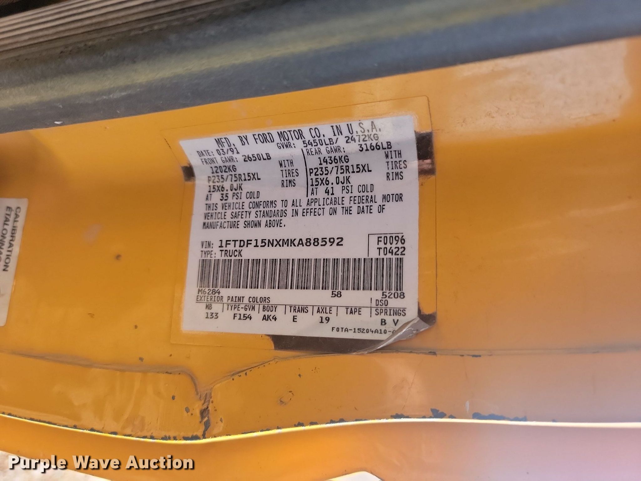 1991 Ford F150 pickup truck. Miles: 91,819 on odometer, VIN: 1FTDF15NXMKA88592. Engine Displacement: 5.0L V8 OHV, Cylinders: 8, Fuel type: Gas. Transmission Automatic. Interior Heat. Tires Size: 235/75R15. Notes Windshield chipped or cracked. South Dakota Title. Title distribution may be delayed up to 14 days from verification of funds. Bon Homme County, SD. 1310 Birch Street. Tyndall, SD 57066
