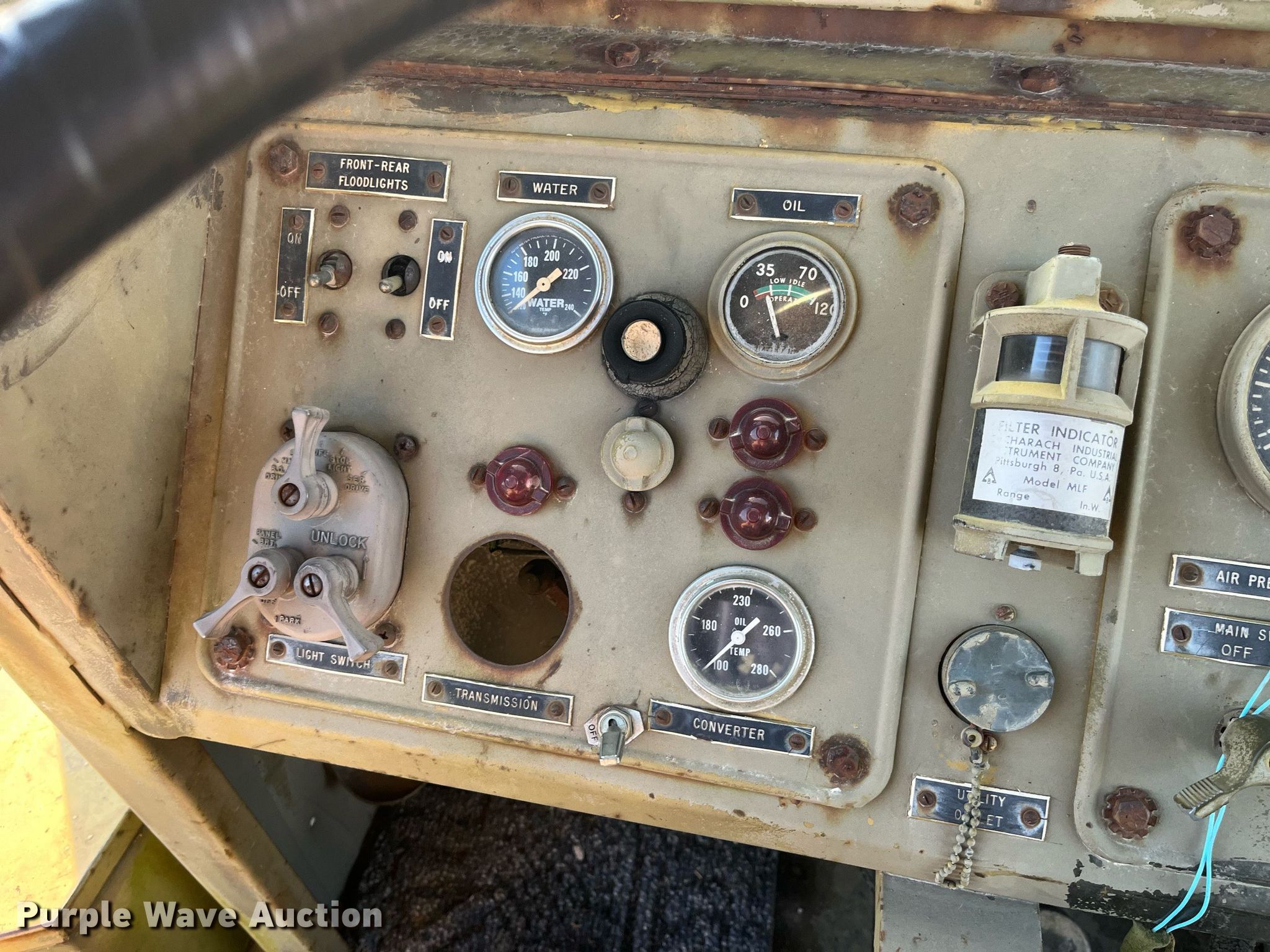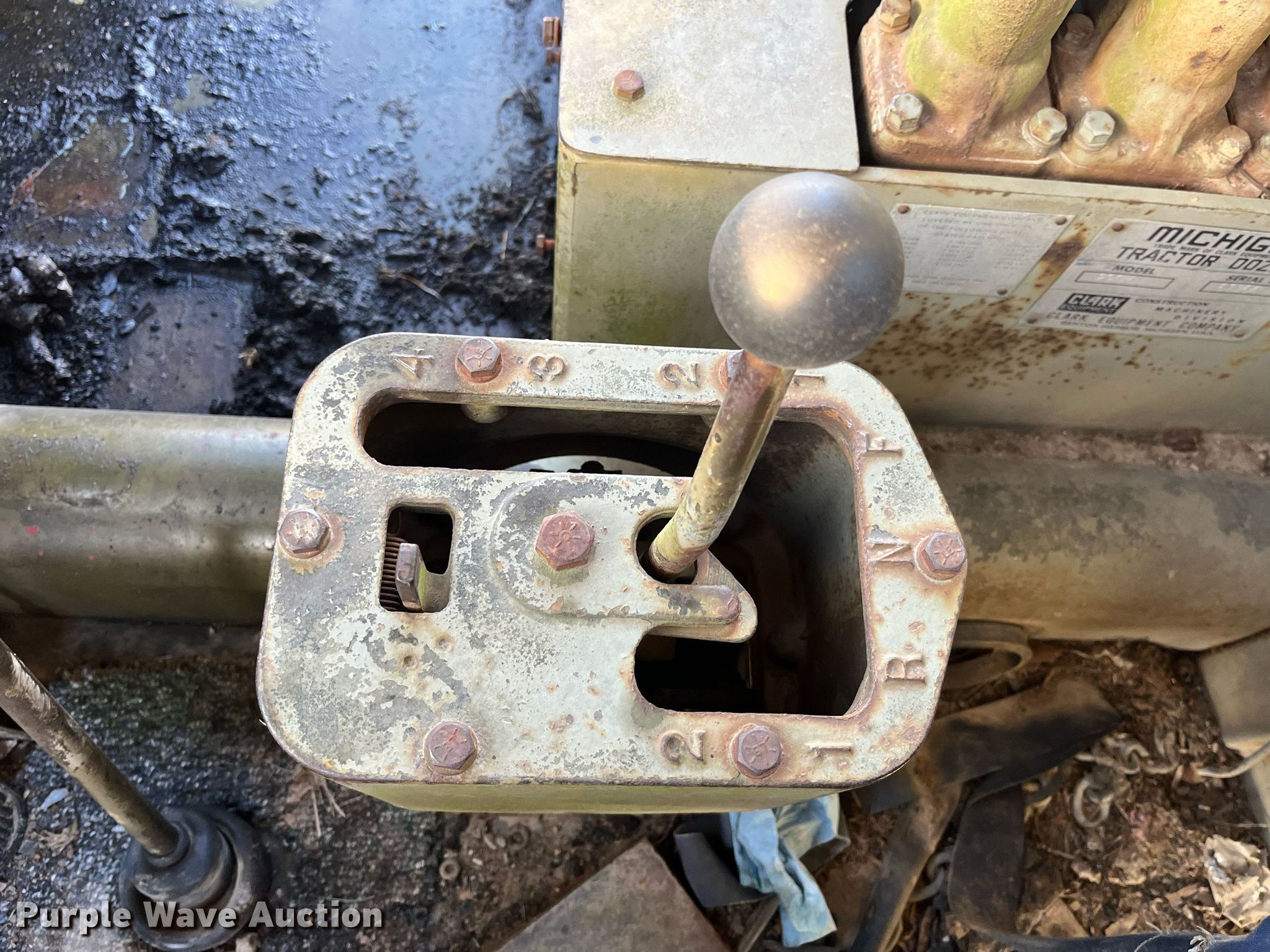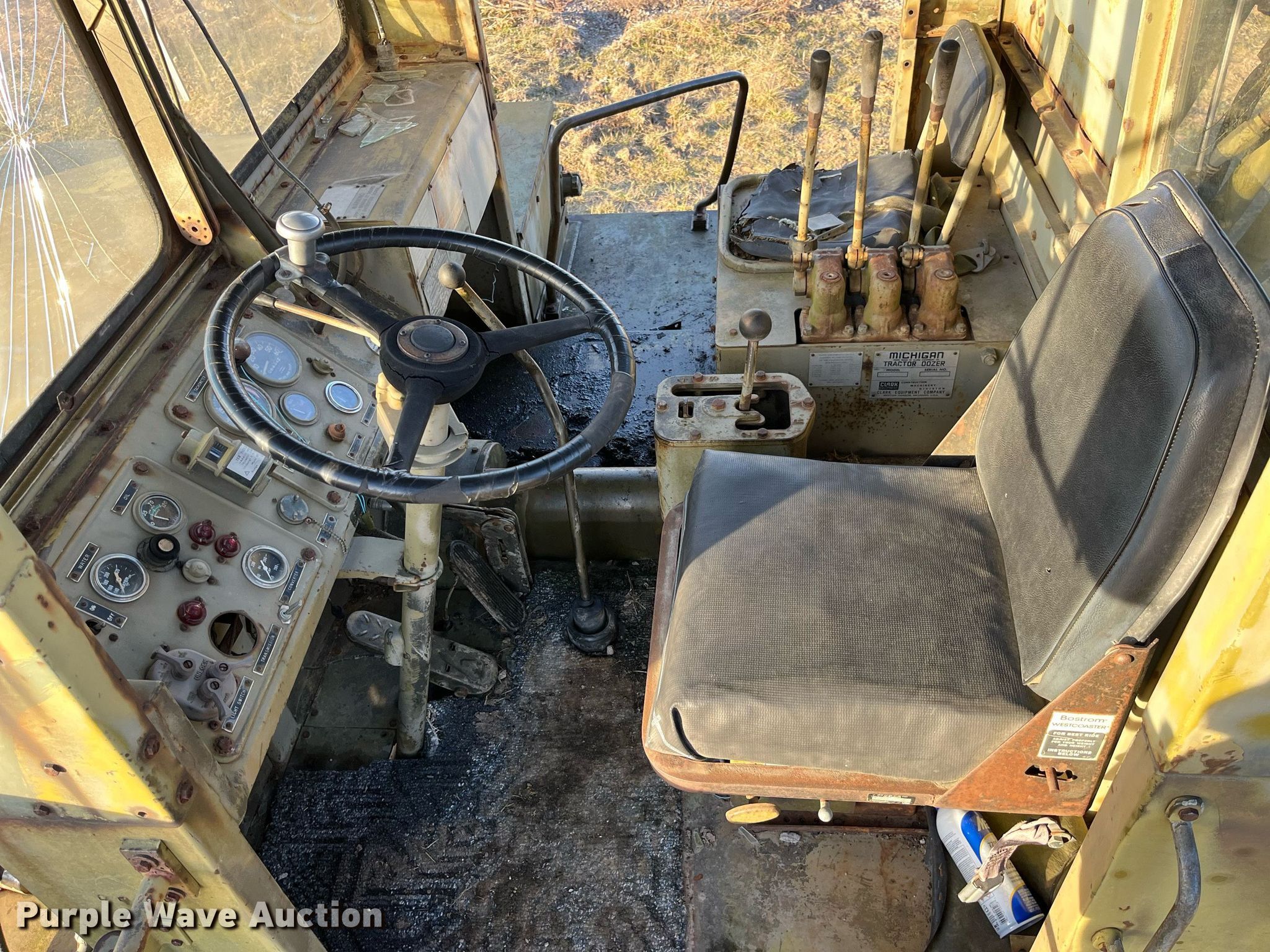 Michigan 290M scraper. Hours: 1,551 on meter, Serial: 61364. Engine Cylinders: 6, Fuel type: Diesel. Transmission Powershift, 4F - 2R. Features Bowl capacity: 12 cu.yd., Hydraulic lift, Scraper controls: Lever controls No. of controls: 3, Rear push block, Blade: 11' 3" W Semi U. Tires Size: 29.5-29. Notes No brakes, Glass cracked, Dead battery, Antifreeze leak. Monroe County. 300 N Main St. Paris, MO 65275