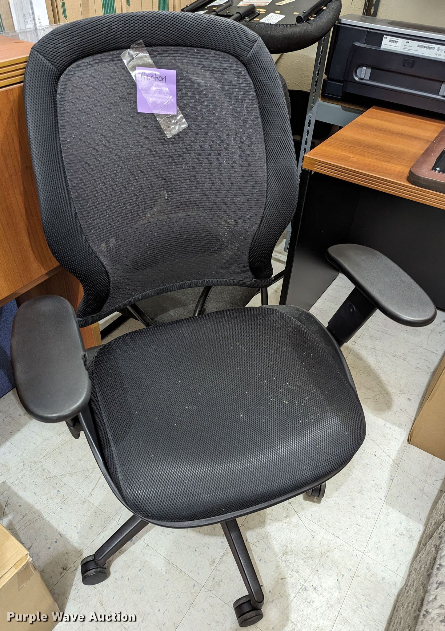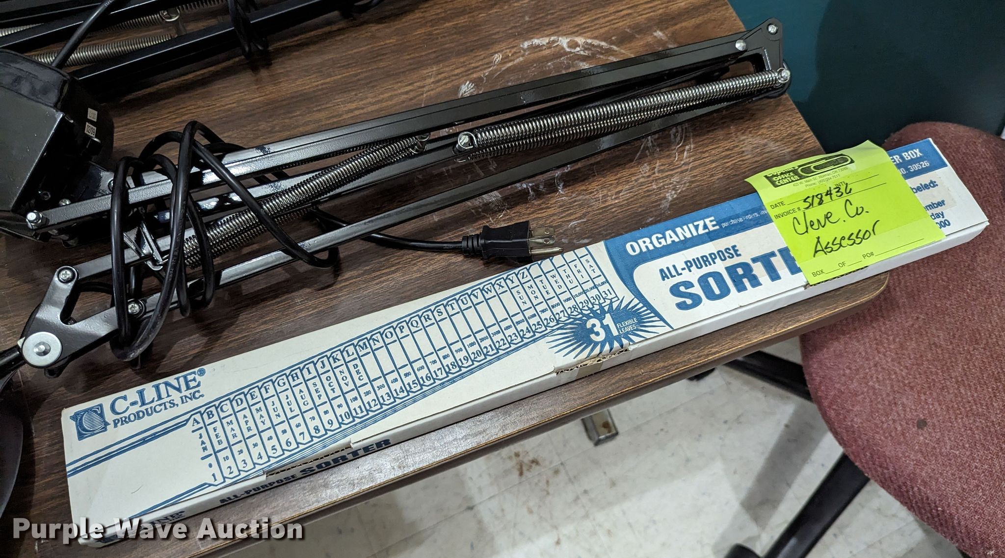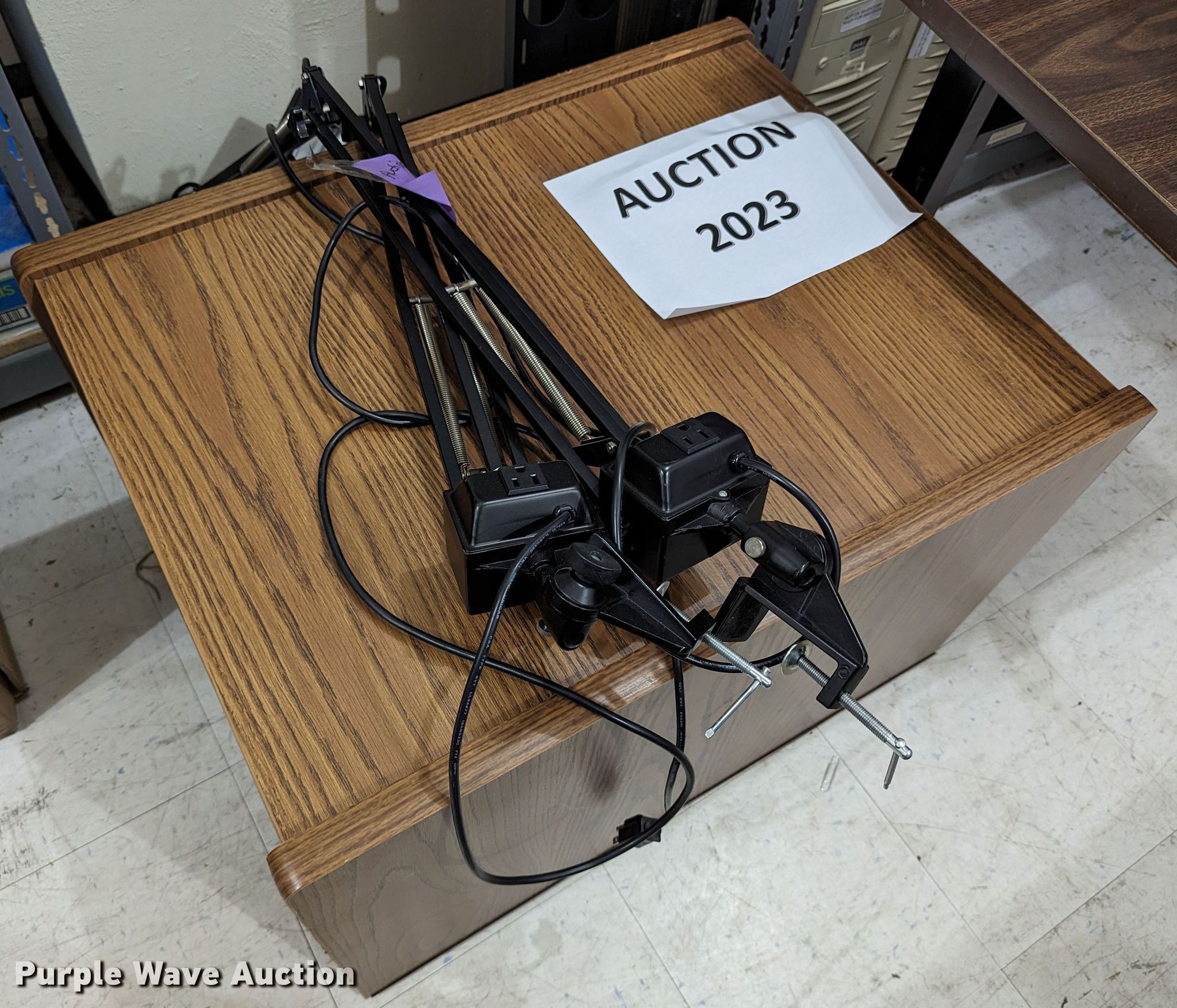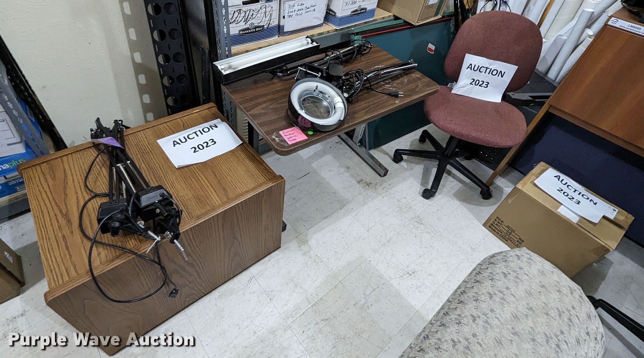 Purple Wave is selling a used Office Supplies and Equip. in Oklahoma. This item is a Office supplies with the following: (3) chairs, Table, Desk, (3) table lights, Magnifying light, Electrical racking, (6) clipboards, Versa keyboard stand, Paper organizer and more