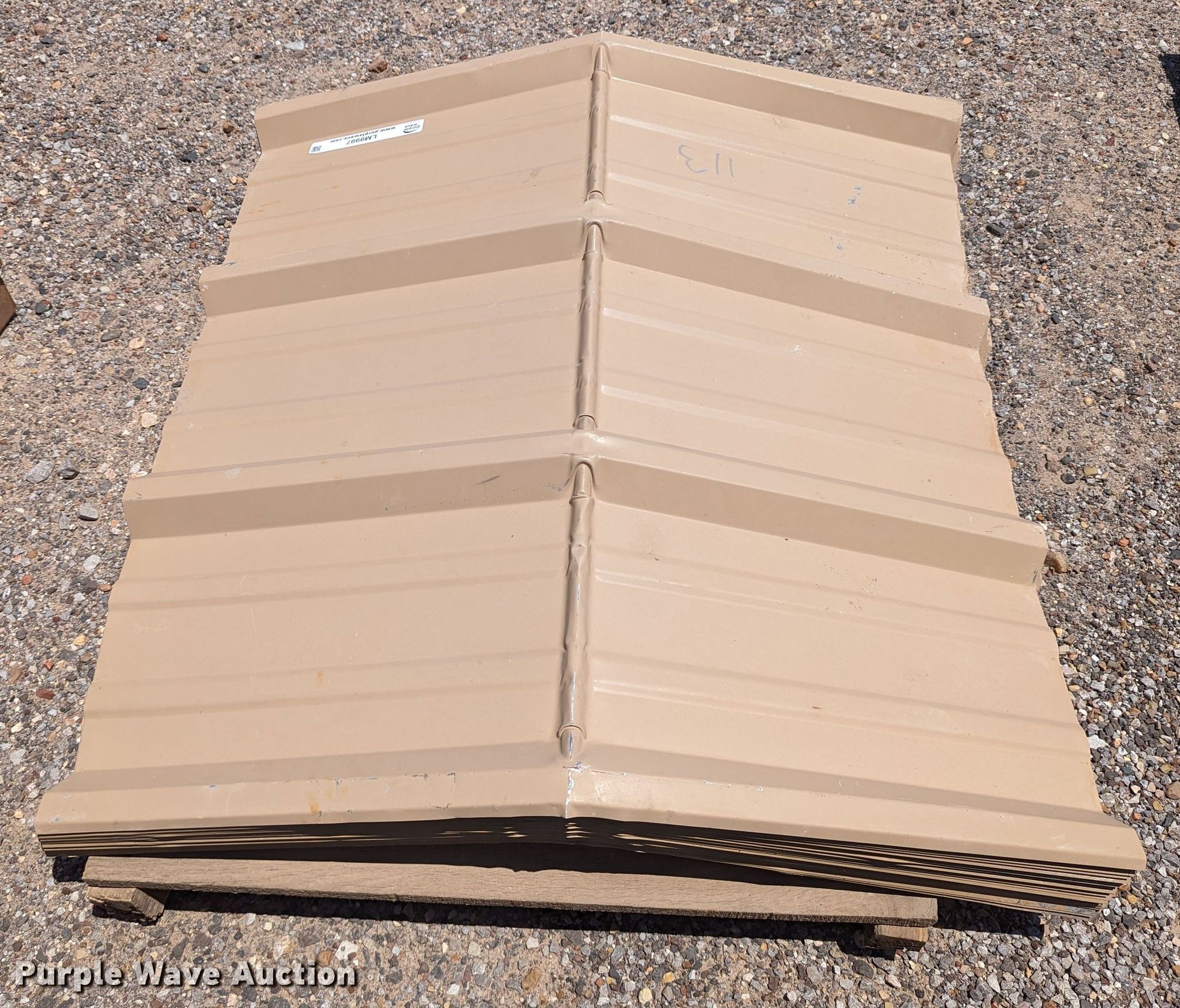 Purple Wave is selling a used Building Materials in Oklahoma. This item is a Approximately (35) metal ridge caps with the following: 38" x 36", Unit #: 113