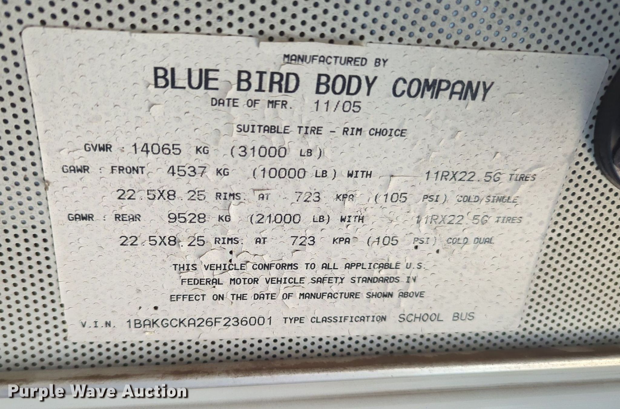 Purple Wave is selling a used Bus in Oklahoma. This item is a 2006 Blue Bird Vision school bus with the following: Miles: 80,318 on odometer, Hours: 5,603 on meter, VIN: 1BAKGCKA26F236001