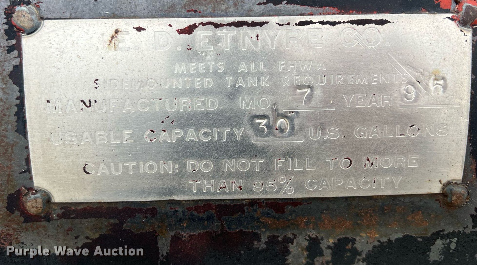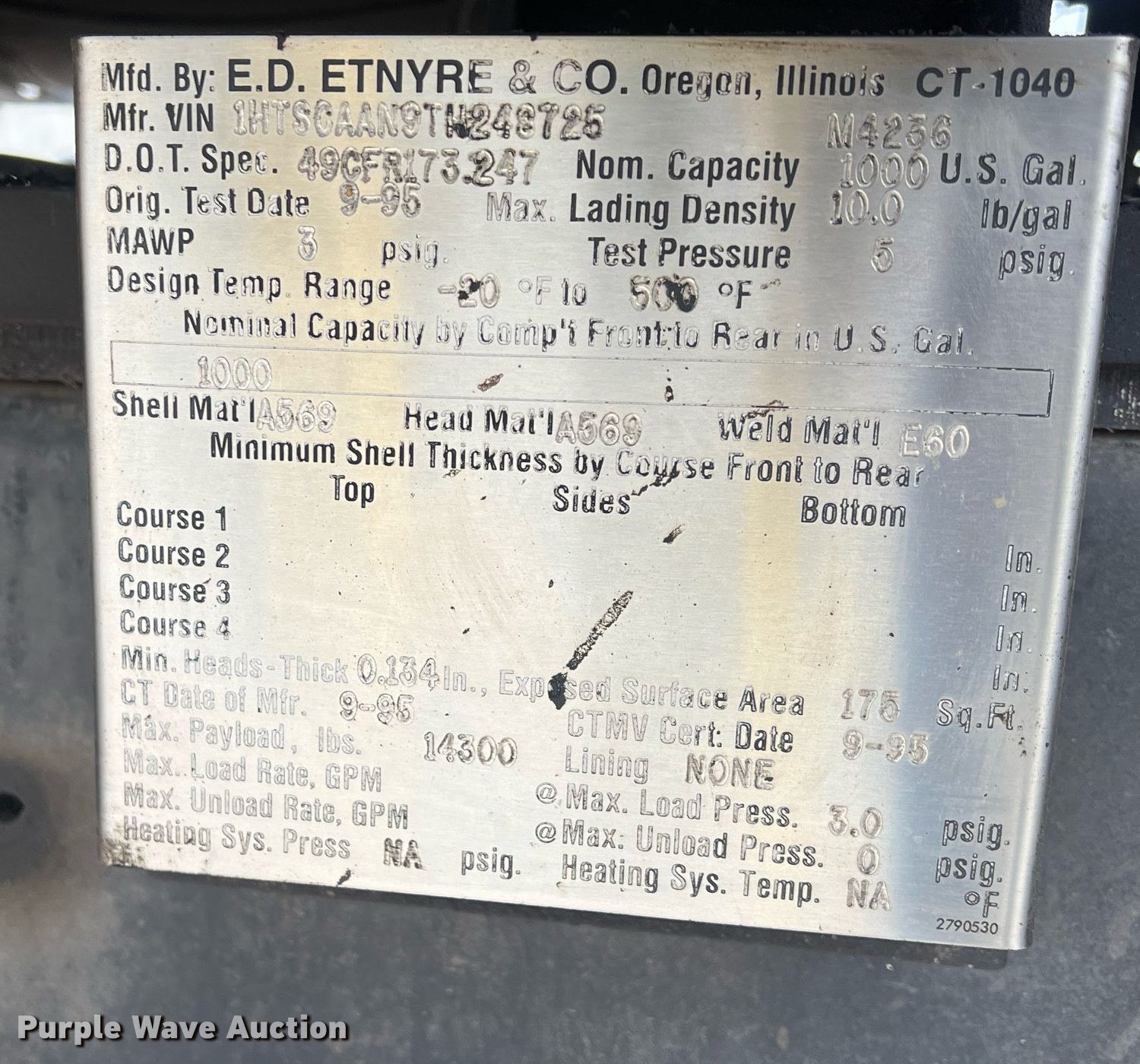 1996 International 4700 oil distributor truck. Miles: 66,219 on odometer, VIN: 1HTSCAAN9TH248725. Engine Navistar DT466, Displacement: 7.6L, Cylinders: 6, Fuel type: Diesel. Transmission Automatic. Chassis Axles: Single, Suspension: Spring, Brakes: Air, PTO. Interior AC, Heat. Features Bed / tank Etnyre, Serial: 1HTSCAAN9TH248725, Capacity: 1,000 gallons, Width: 96", Burner: LPG, Heat rating: 450 degrees, Spray wand, Spray boom Width: 96'.. Tires Size: 11/R22.5. Kansas title. Title distribution may be delayed up to 30 days from verification of funds. City of Overland Park, KS. 12401 Antioch Road. Overland Park, KS 66213