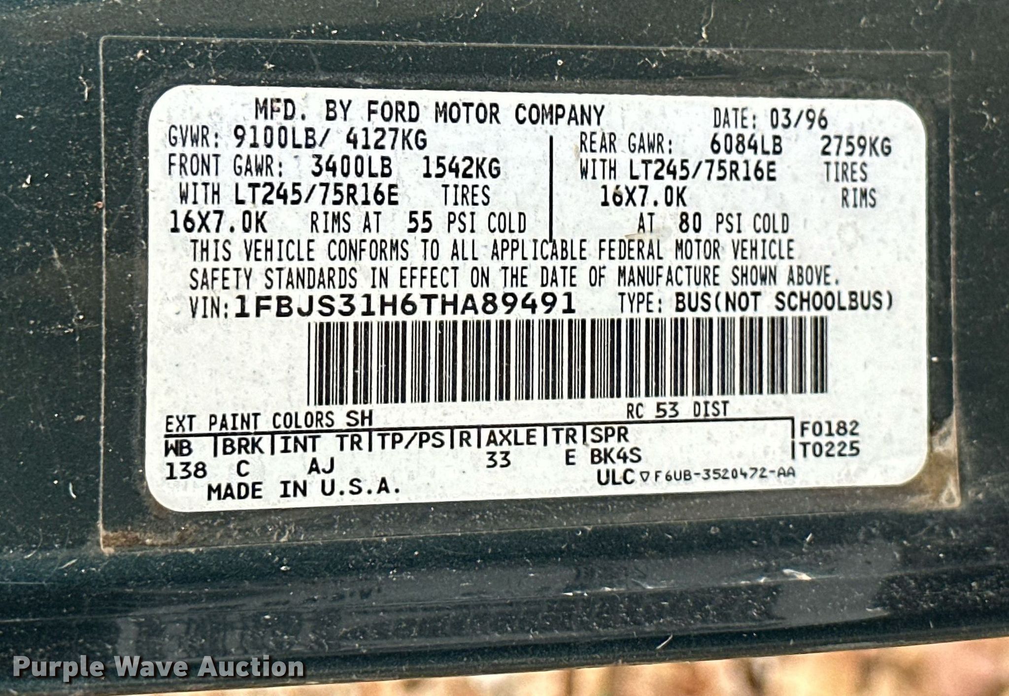 Purple Wave is selling a used Passenger Vehicle in Kansas. This item is a 1996 Ford Club Wagon van with the following: Miles: Unknown, VIN: 1FBJS31H6THA89491