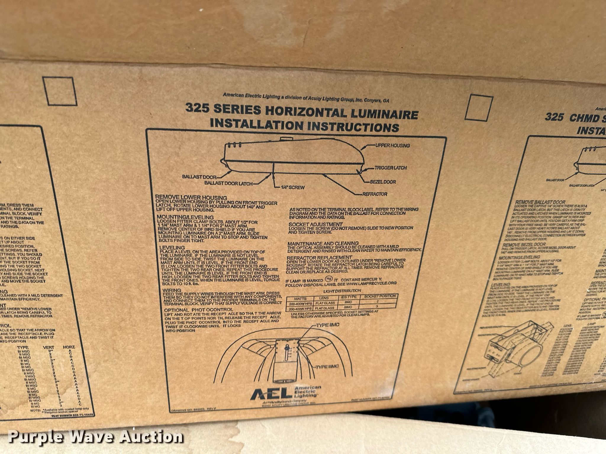 Purple Wave is selling a used Building Materials in Kansas. This item is a Street lights with the following: (3) AEL 325 series horizontal luminaire, Unknown operating condition