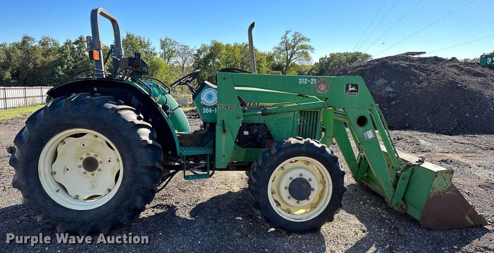 1996 John Deere 5300 MFWD tractor. Hours: 811 on meter, Serial: LV5300E631859. Engine John Deere, Cylinders: 3, Fuel type: Diesel. Transmission Manual, 9F - 3R, Creeper, Differential lock. Features PTO: 540, Three point, Hydraulic remote sets Rear: 2, Loader John Deere 540, Controls: Joystick, Bucket Width: 75".. Tires Front: 9.5-24, Rear: 16.9-28. Notes Hood damaged, Hydraulic hose damaged, Hydraulic cylinder leak. Cleveland County. 6706 Alameda St. Norman, OK 73026