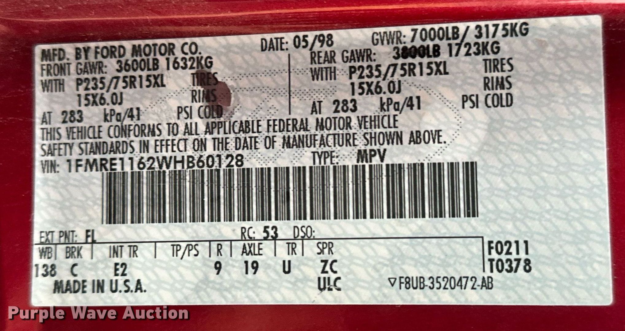 Purple Wave is selling a used 1/2 Ton Pickup or Van in Kansas. This item is a 1998 Ford Club Wagon van with the following: Miles: 222,731 on odometer, VIN: 1FMRE1162WHB60128, Unit #: 13