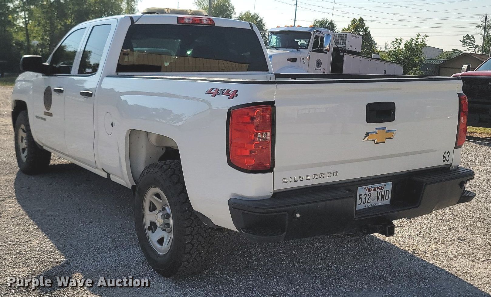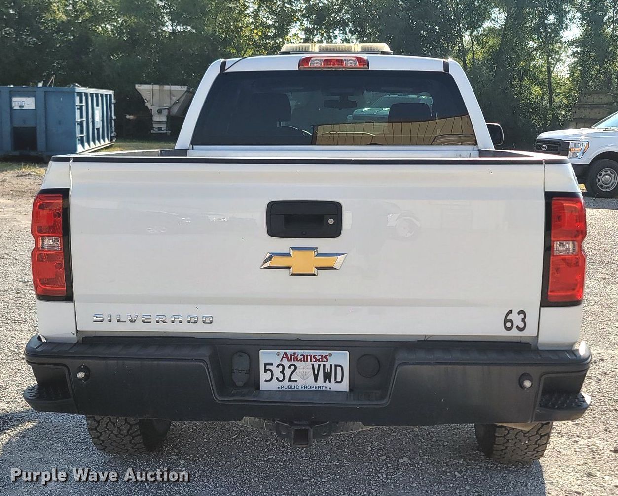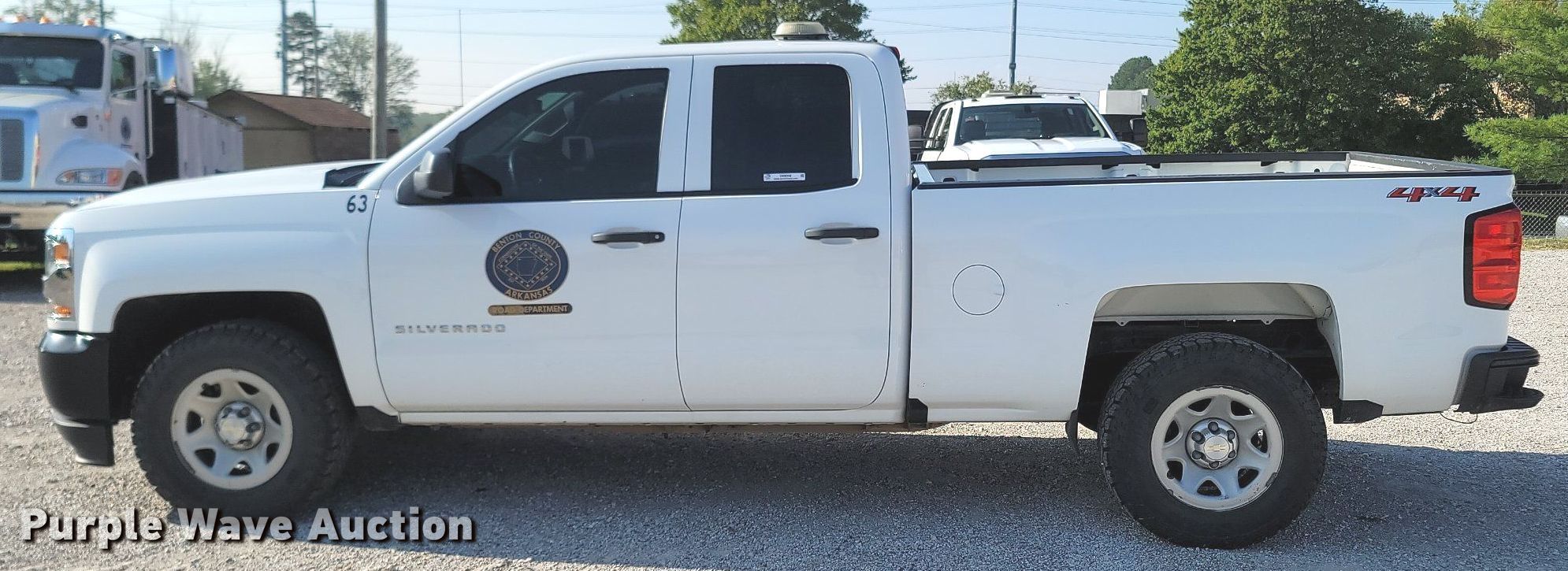 2018 Chevrolet Silverado 1500 Double Cab pickup truck. Miles: 102,356 on odometer, VIN: 1GCVKNEC9JZ190006. Engine Displacement: 5.3L V8 OHV , Cylinders: 8, Fuel type: Gas. Transmission Automatic, Four wheel drive. Interior AC, Heat, Power windows, Power locks, Cruise control, Backup camera. Tires Size: LT265/70R17. Notes Light bar and flashlight charger will be removed prior to auction. Arkansas title. Title distribution may be delayed up to 14 days from verification of funds. Benton County. 1206 SW 14th St, Bentonville, AR 72712. Bentonville, AR 72712