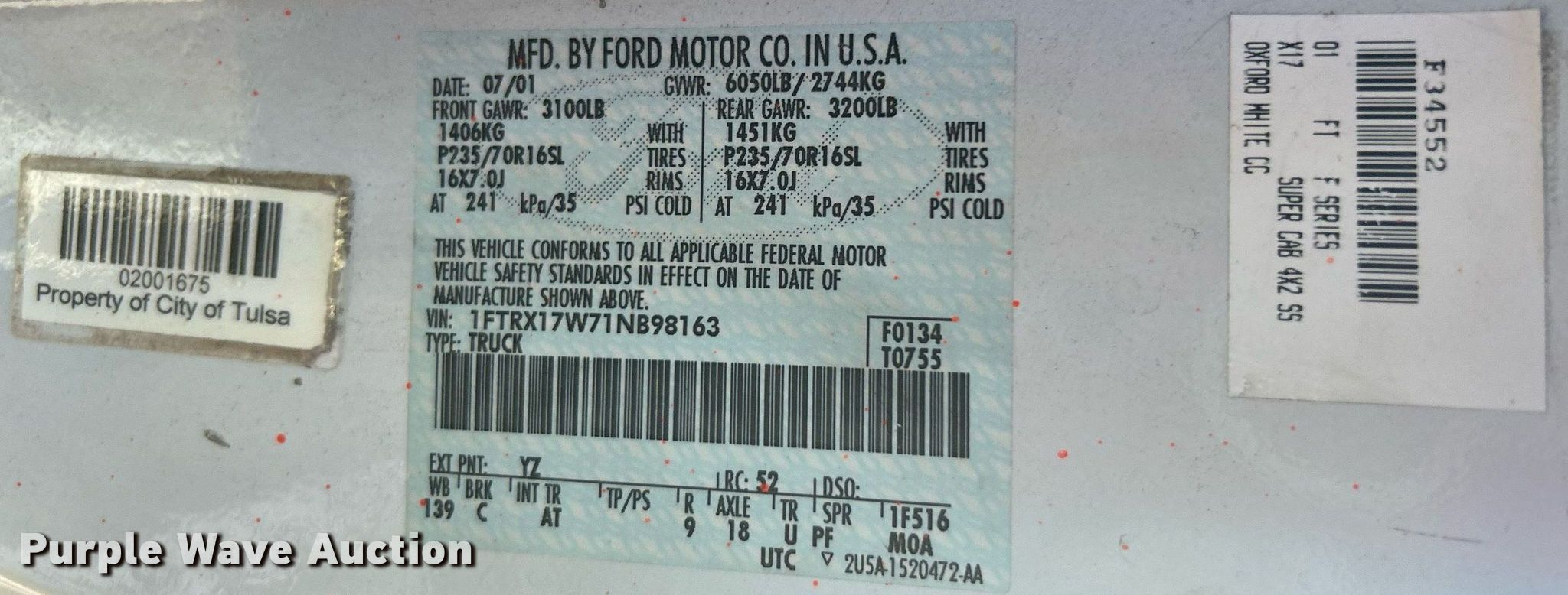 2001 Ford F150 SuperCab pickup truck. Miles: 160,513 on odometer, VIN: 1FTRX17W71NB98163, Unit #: 217. Engine Displacement: 4.6L V8 SOHC, Cylinders: 6, Fuel type: Gas. Transmission Automatic. Interior AC, Heat, Cruise control. Tires Size: 235/70R16. Notes Dead battery, Engine issues, cylinder number five issues, Oil leak. Oklahoma title. Seller is a government entity who will be assigning and distributing the title. Please contact the seller for distribution questions. City of Tulsa. 108 N Trenton Ave. Tulsa, OK 74120